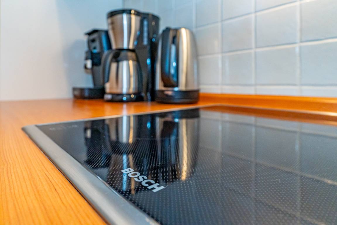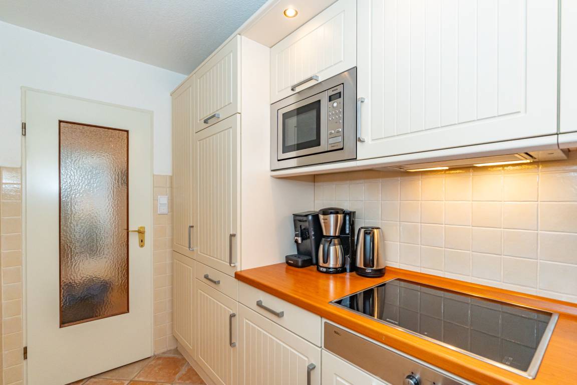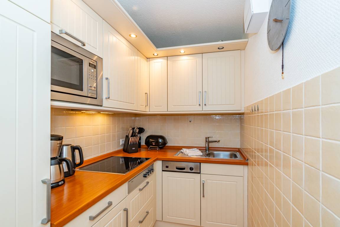 Die separate Küche hat einen Geschirrspüler, eine Mikrowelle, ein Ceranfeld. Kaffeemaschine, Senseomaschine, Wasserkocher und Toaster gehören zur Grundausstattung.
