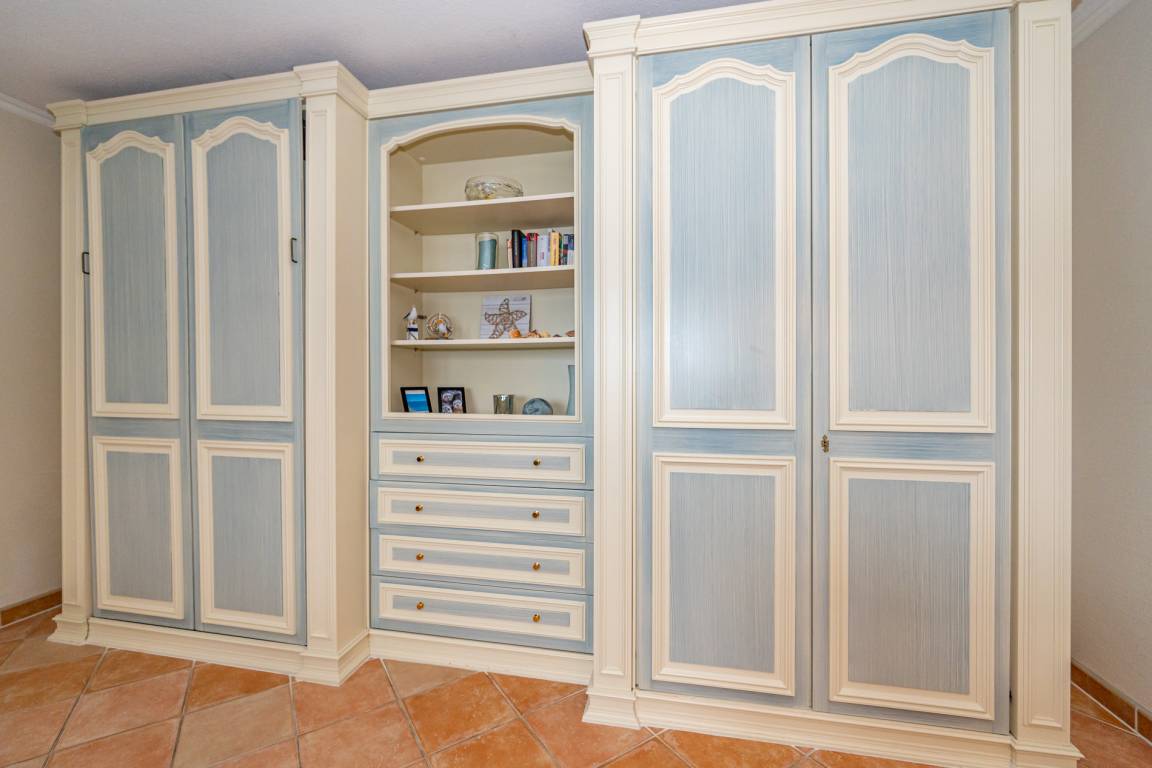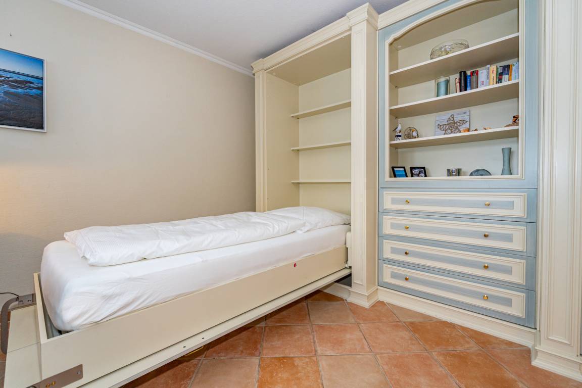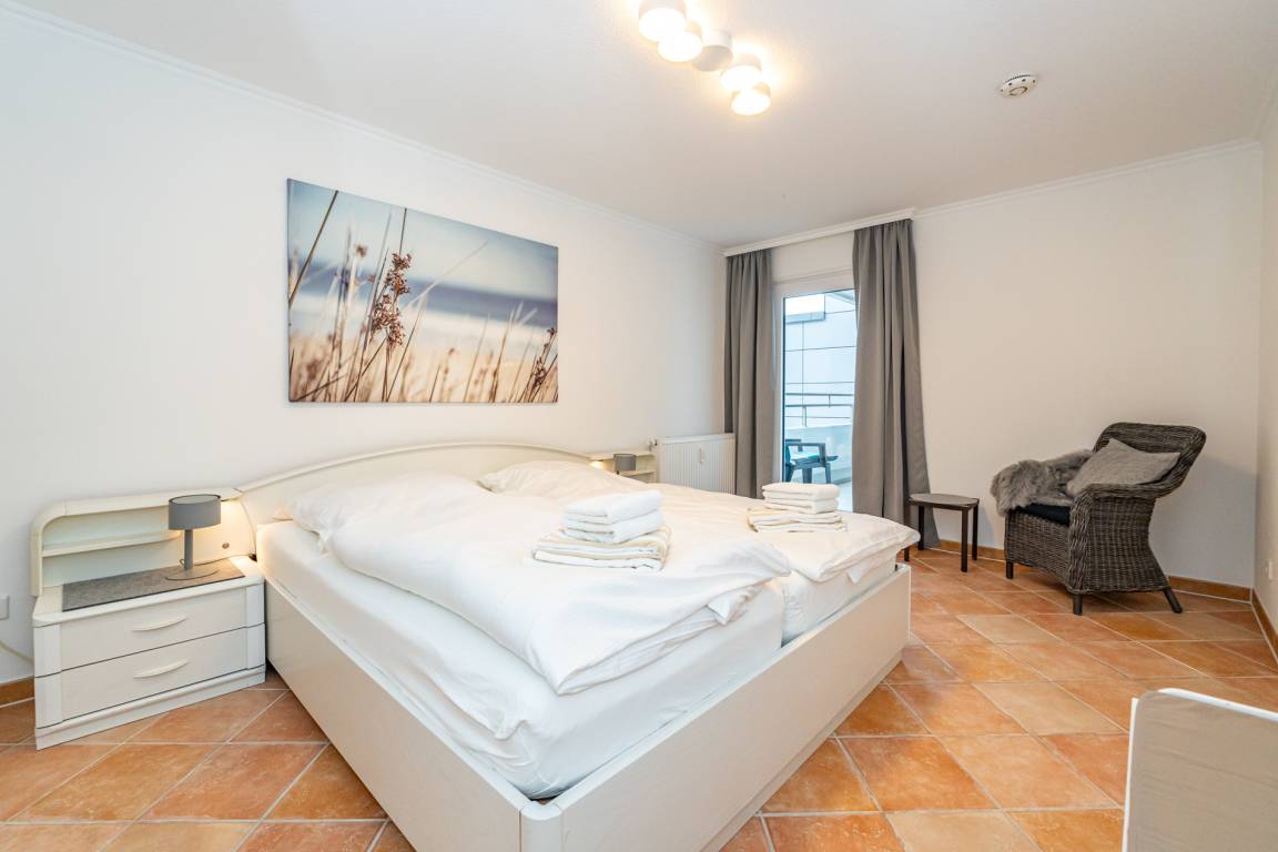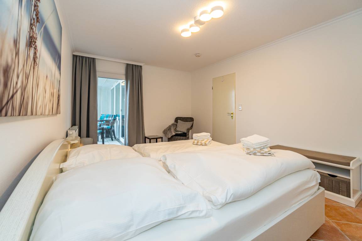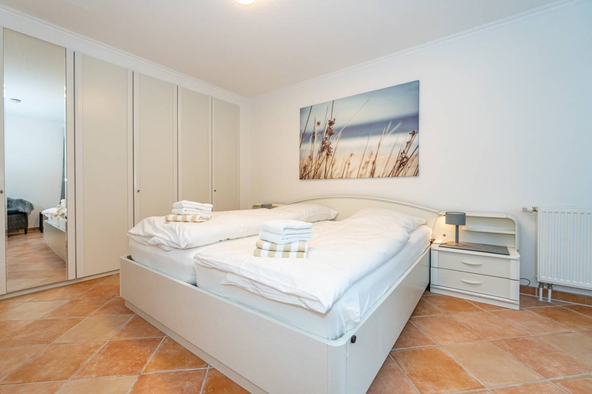 Im Schlafzimmer (mit einem weiteren Austritt zur Westloggia) befinden sich ein Doppelbett und ein Kleiderschrank.