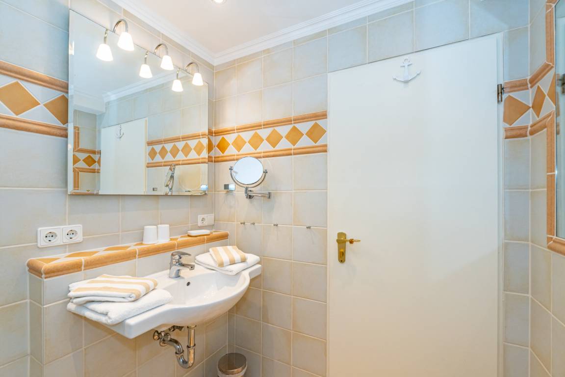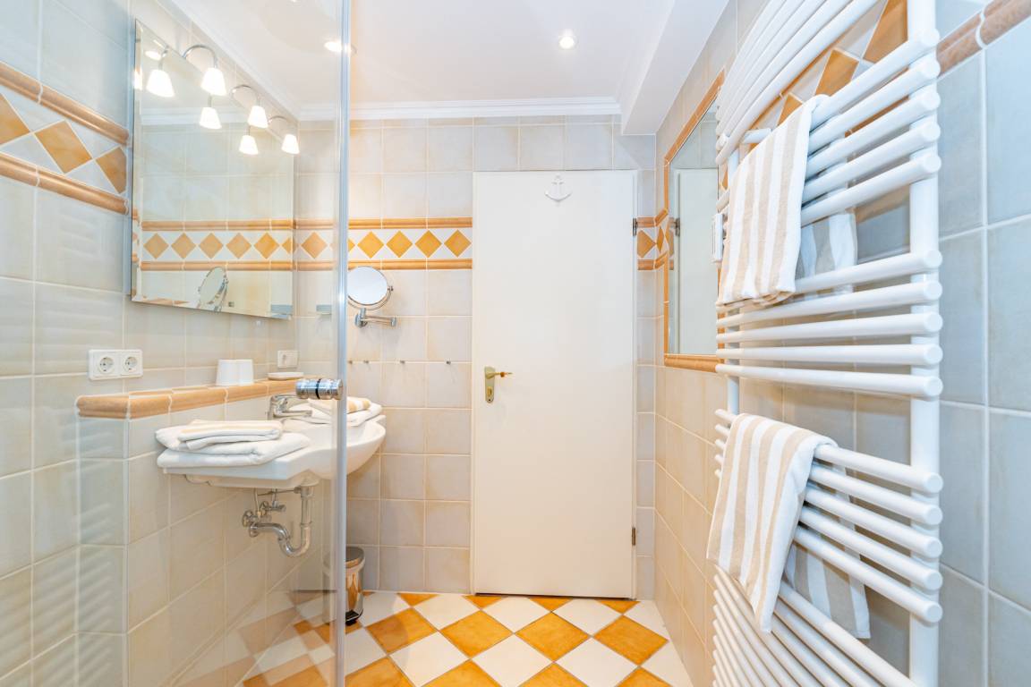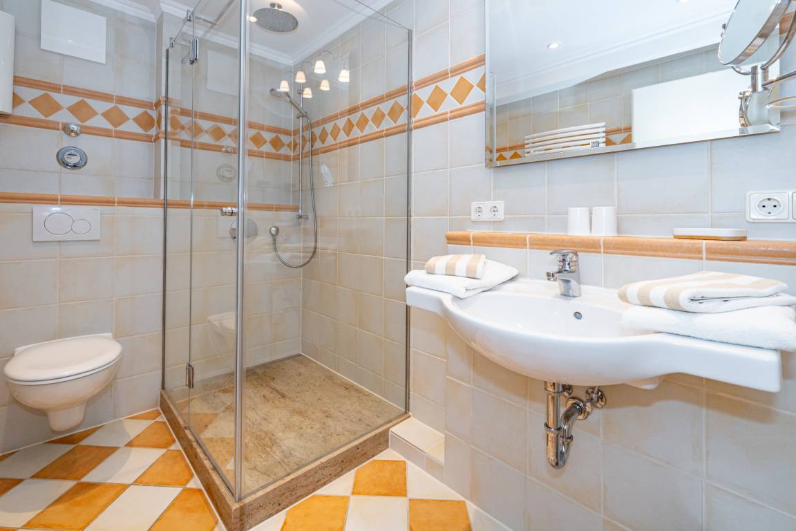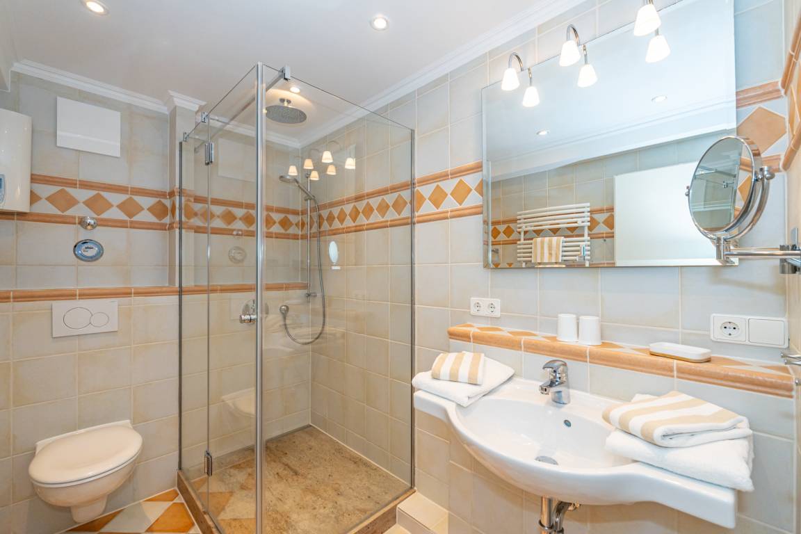 Im modernen Bad befinden sich eine Dusche mit niedrigem Einstieg, ein WC und ein Waschtisch.