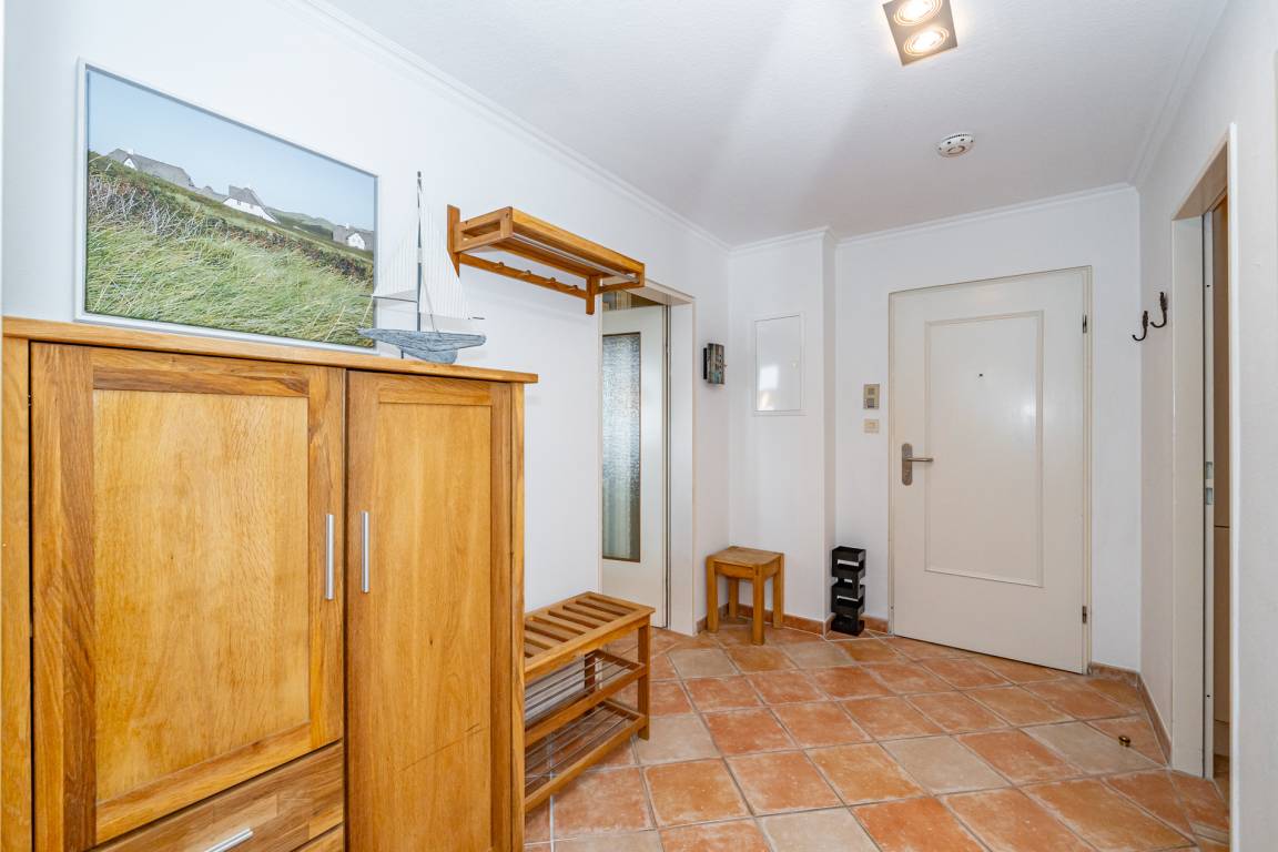 Vom Vorflur mit Garderobe gelangt man in das Wohnzimmer (mit Austritt zur Westloggia), die Küche, das Schlafzimmer und das Duschbad/WC.