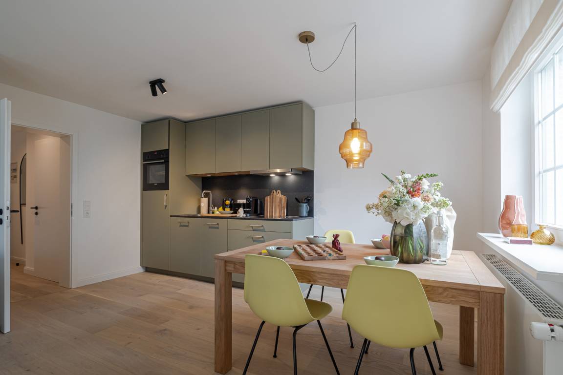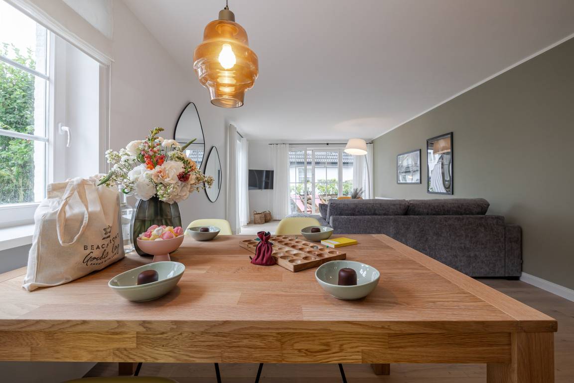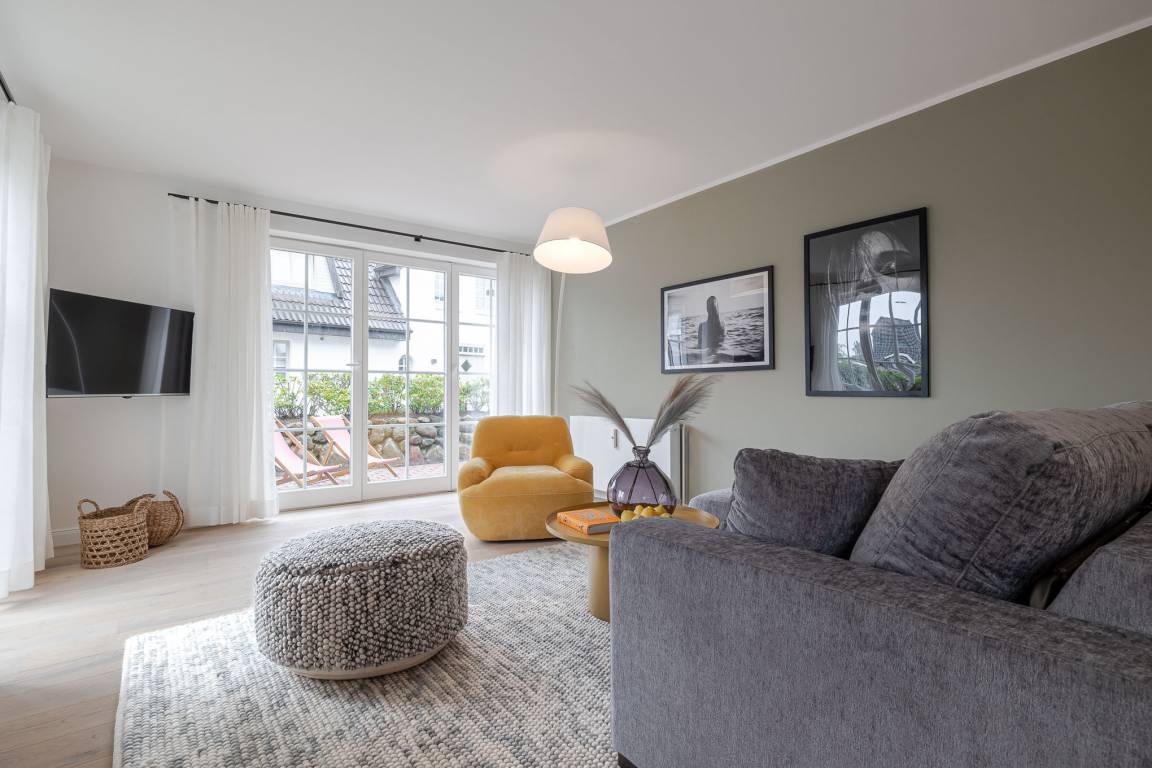 Der offene Wohn- und Essbereich bietet ein gemütliches Schlafsofa als zusätzliche Schlafmöglichkeit sowie eine hochwertig ausgestattete Küche mit Markengeräten (u. a. Miele) und allem, was Sie zum entspannten Kochen benötigen. Ein besonderes Highlight ist die eigene Terrasse mit komfortablen Loungemöbeln (Mai–Oktober) – perfekt für ein Frühstück an der frischen Nordseeluft oder ein Glas Wein am Abend.