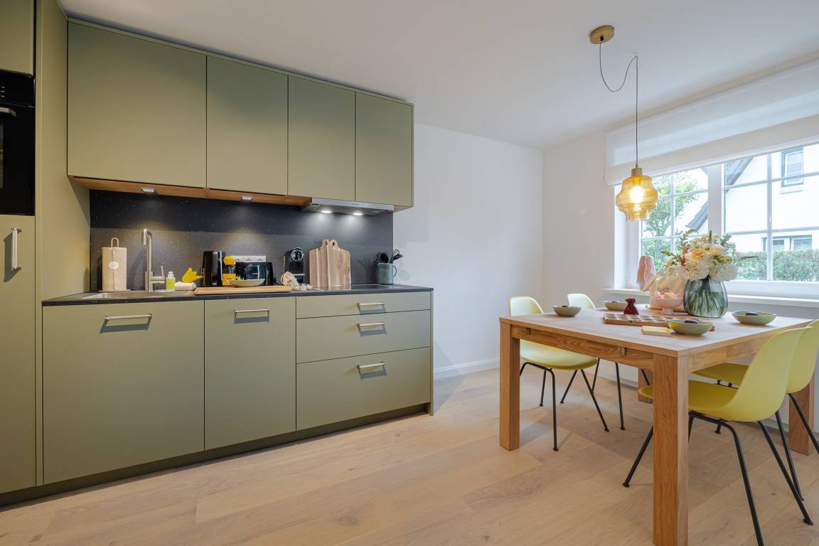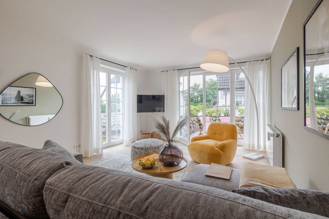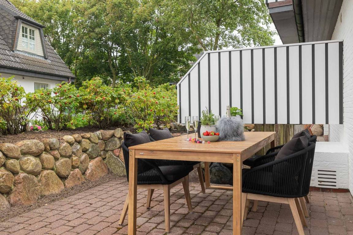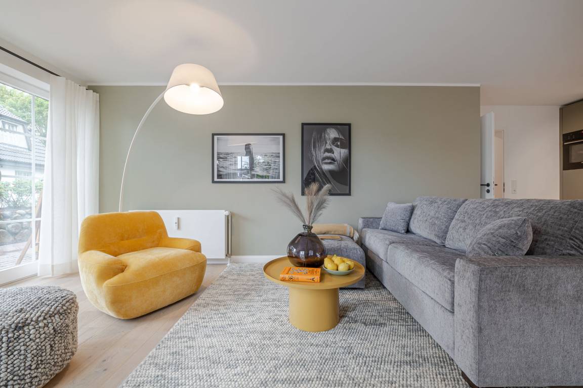 Der offene Wohn- und Essbereich bietet ein gemütliches Schlafsofa als zusätzliche Schlafmöglichkeit sowie eine hochwertig ausgestattete Küche mit Markengeräten (u. a. Miele) und allem, was Sie zum entspannten Kochen benötigen. Ein besonderes Highlight ist die eigene Terrasse mit komfortablen Loungemöbeln (Mai–Oktober) – perfekt für ein Frühstück an der frischen Nordseeluft oder ein Glas Wein am Abend.