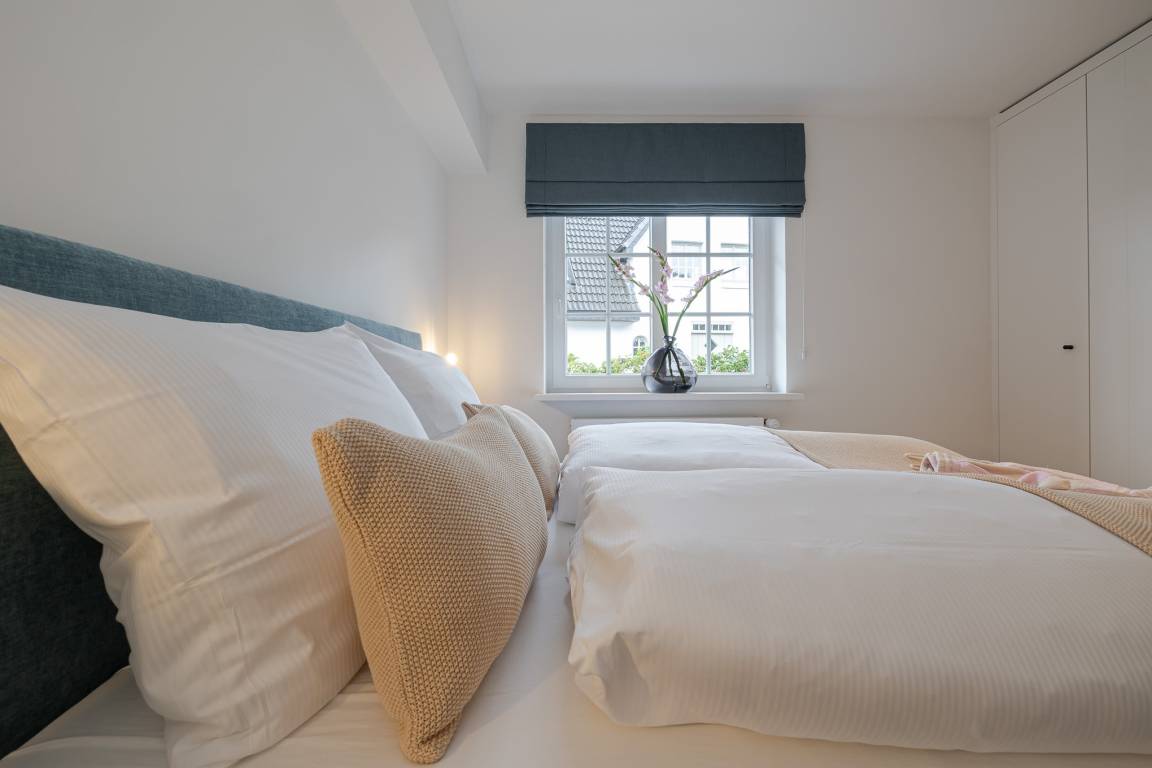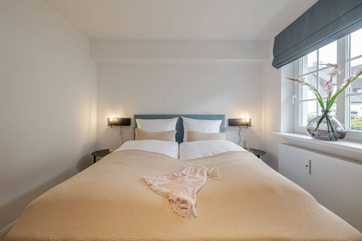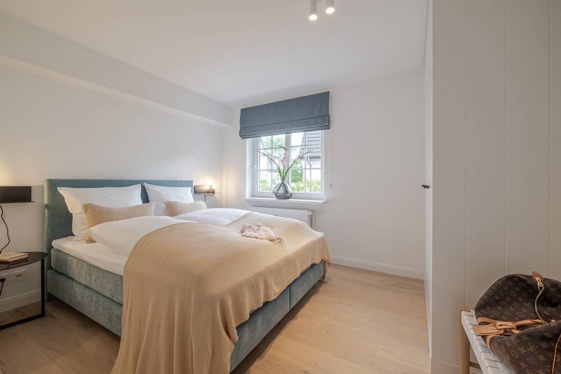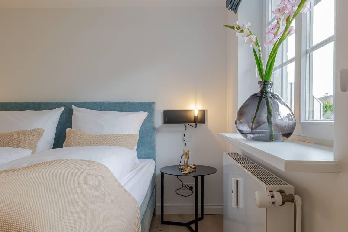 Das Schlafzimmer ist mit einem besonders komfortablen Schramm-Boxspringbett ausgestattet und lädt zu erholsamen Nächten ein. Direkt angrenzend befindet sich das moderne Badezimmer in maritimen Farben mit Regendusche und Fußbodenheizung, wohltuend zu jeder Jahreszeit.