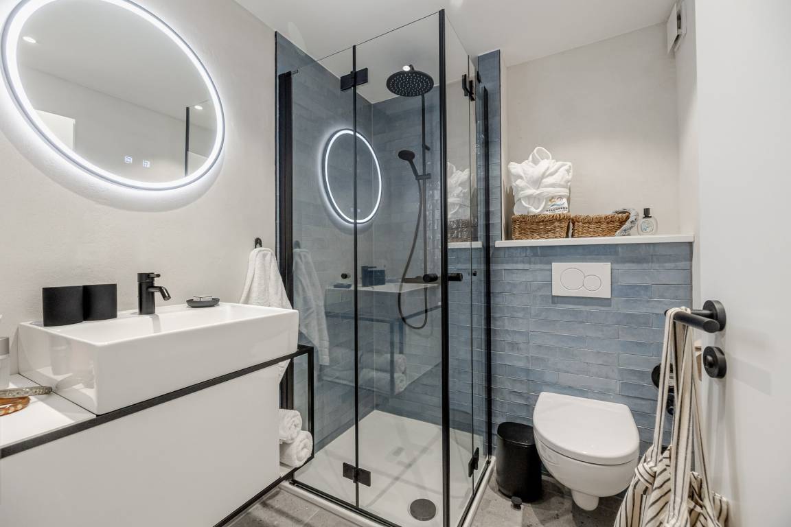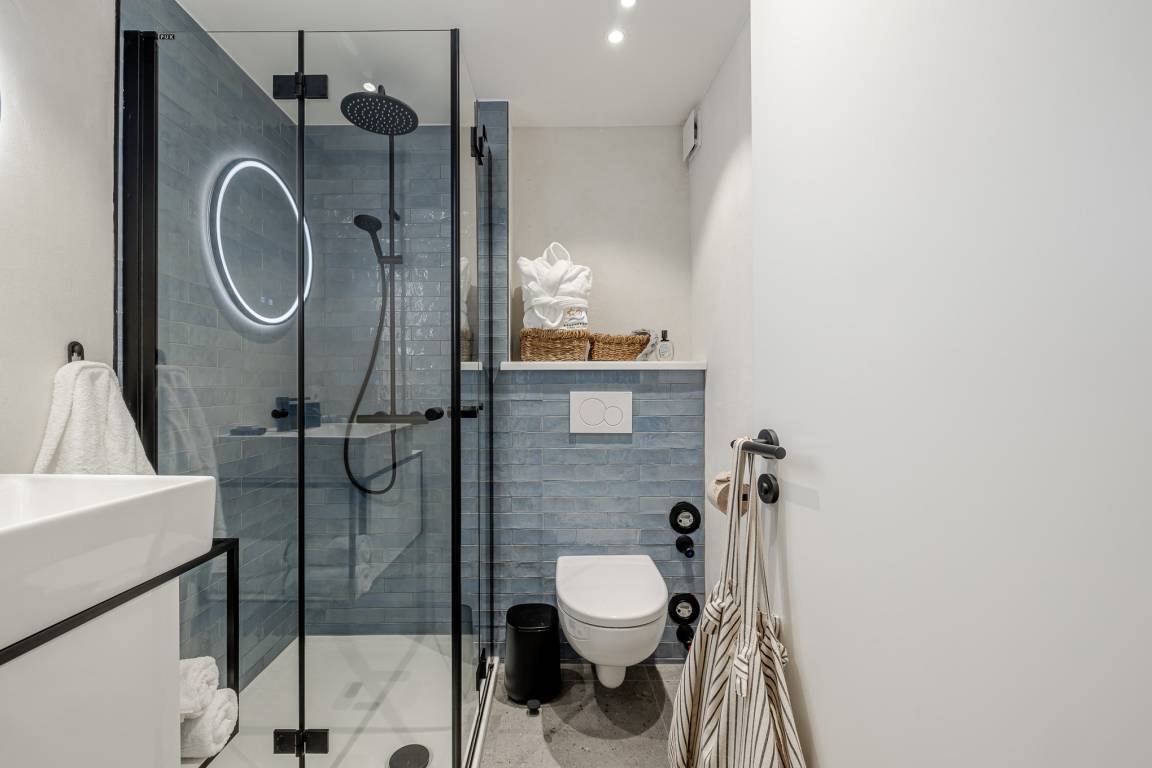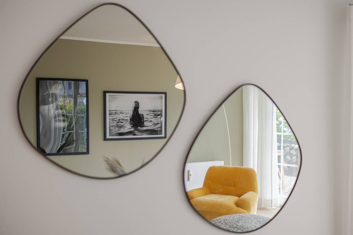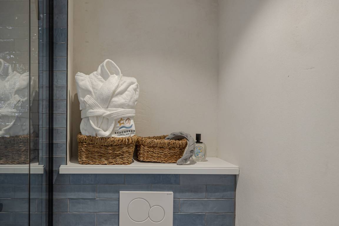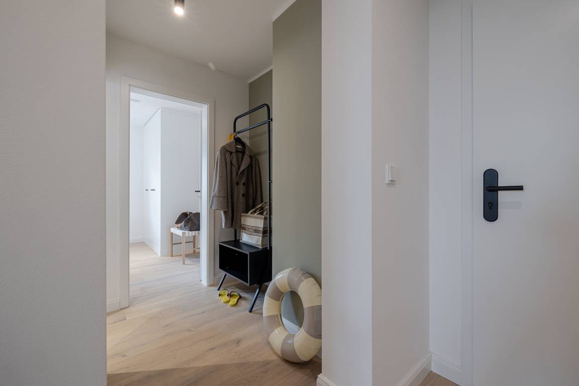Das Schlafzimmer ist mit einem besonders komfortablen Schramm-Boxspringbett ausgestattet und lädt zu erholsamen Nächten ein. Direkt angrenzend befindet sich das moderne Badezimmer in maritimen Farben mit Regendusche und Fußbodenheizung, wohltuend zu jeder Jahreszeit.