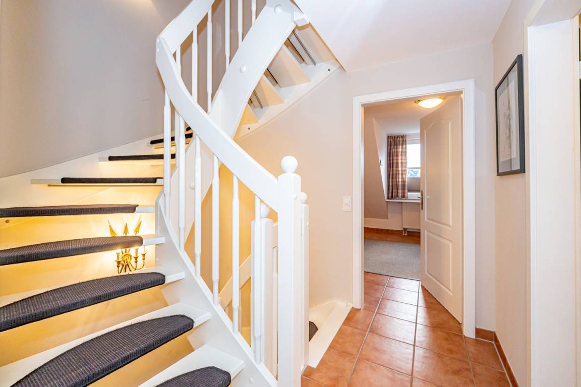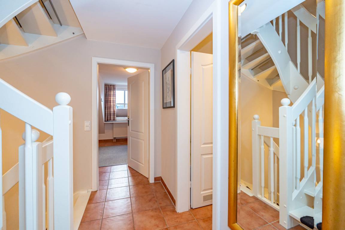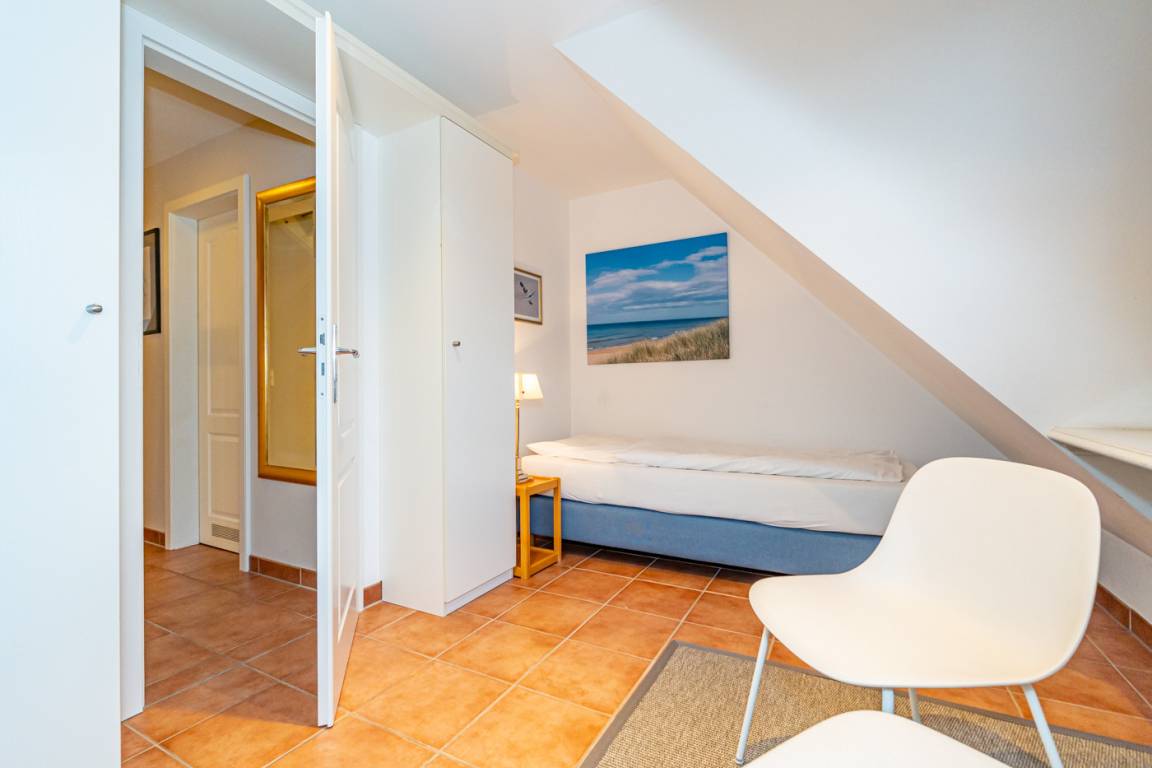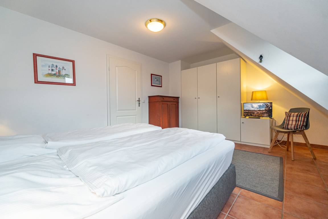 Im 1. Obergeschoss befinden sich ein großzügiges Schafzimmer mit Doppelbett (0,90 x 2,00 m), Kleiderschrank und TV, sowie ein Zweibett-Schlafzimmer (1,00 x 2,00 m) mit Kleiderschrank.