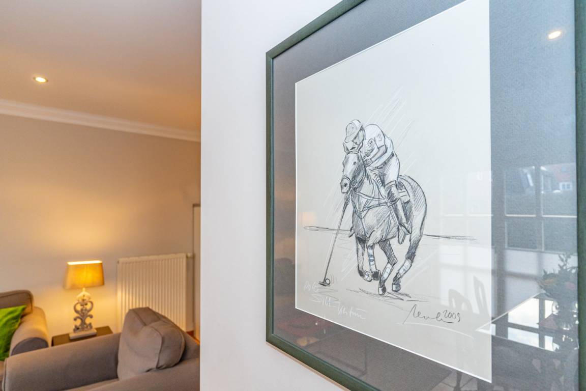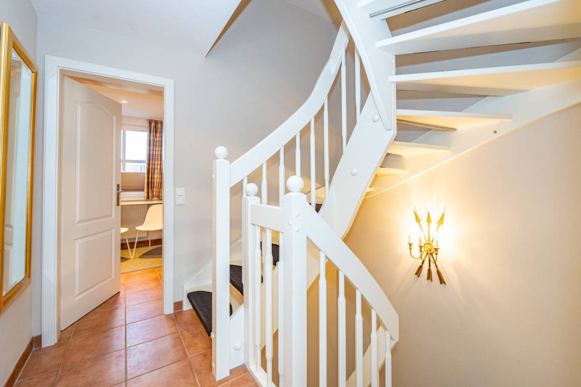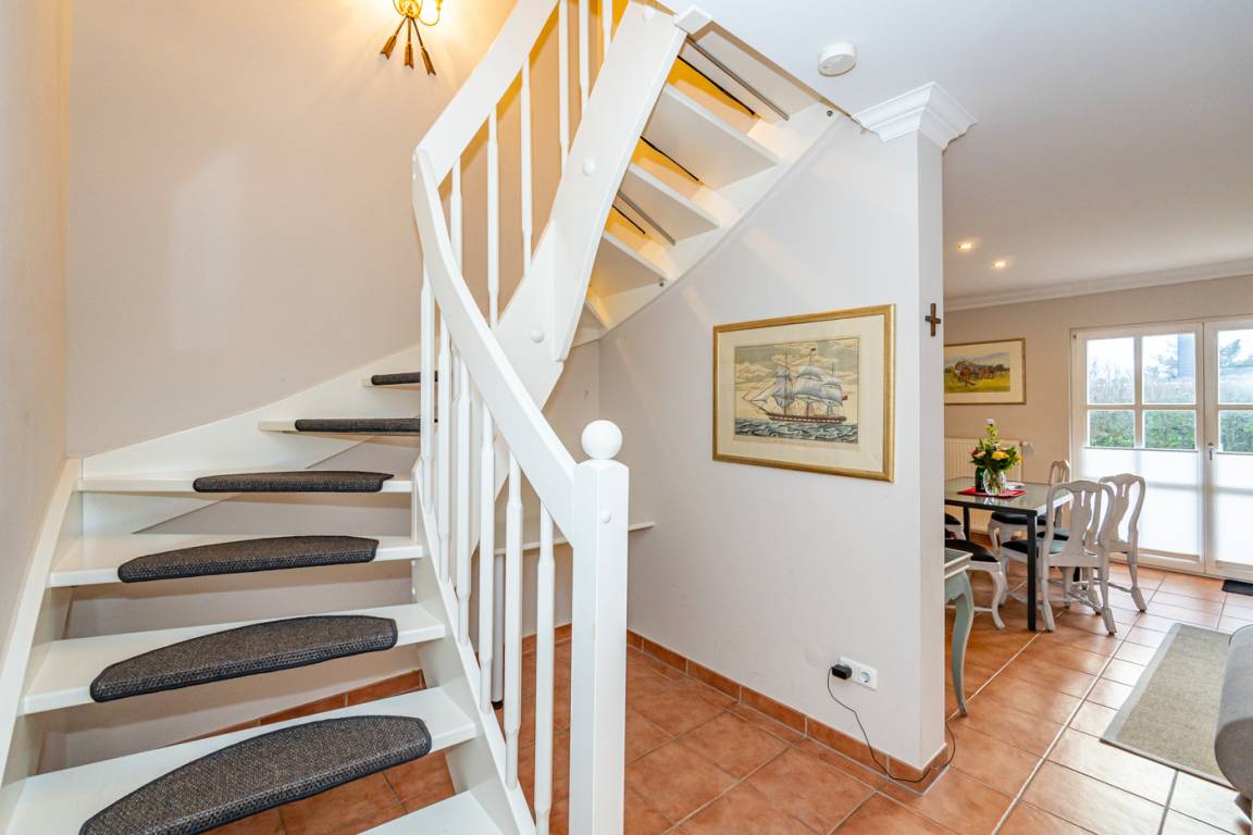Im Erdgeschoss gelangt man von der Diele in das exklusive Wohnzimmer mit offener Einbauküche, das Duschbad/WC und in den Hauswirtschaftsraum mit Waschmaschine und Trockner.