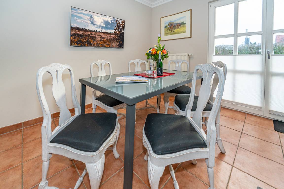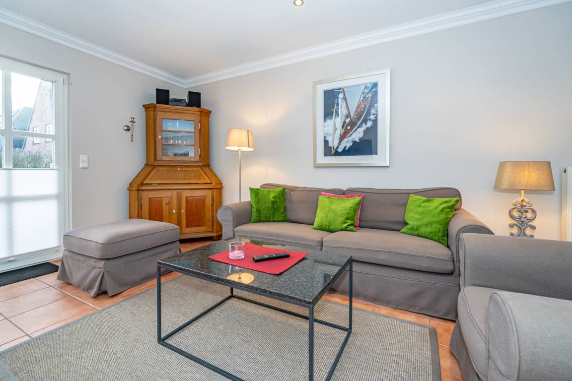 Das Wohnzimmer ist mit einer edlen Couchgarnitur (Zweisitzer-Couch und 1 Sessel mit Fußhocker), Essplatz für 6 Personen, weißem antiken Kachelofen, Kabel-Flachbild-TV, Radio/CD-Player und einer cremefarbenen Küche im Landhausstil ausgestattet. Kostenlose Internetnutzung per W-Lan.