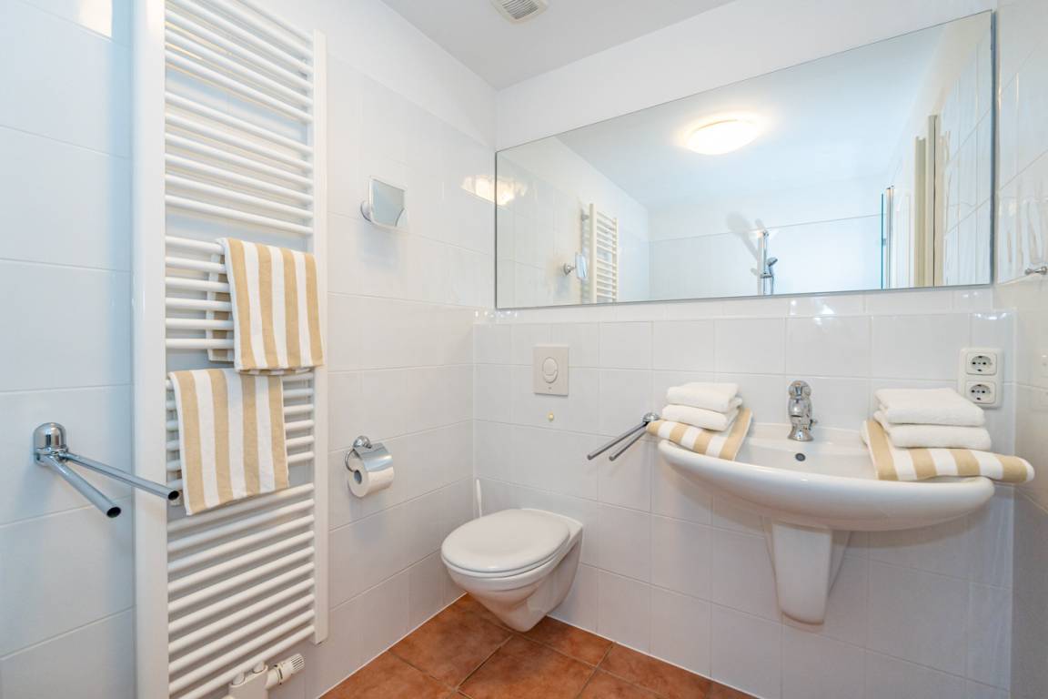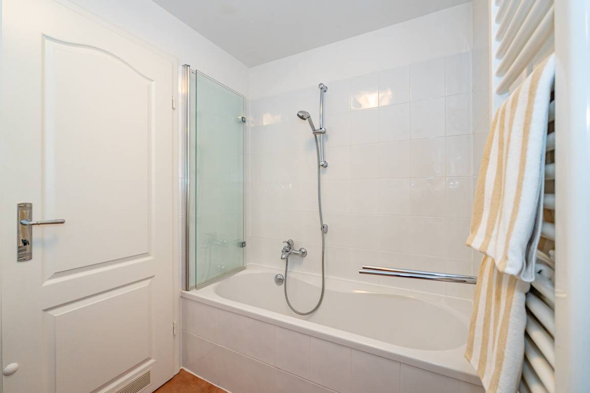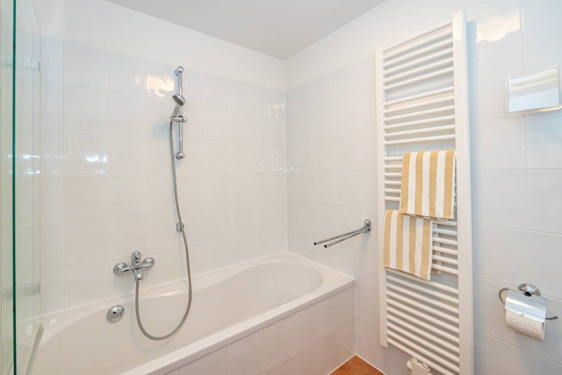 Das helle Wannenbad besitzt eine Badewanne mit Duschvorrichtung, Waschtisch, Handtuchtrockner, WC und Fön.