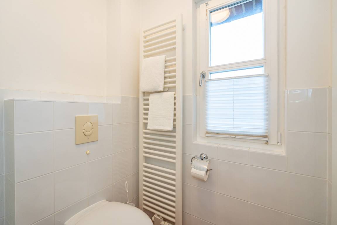 Das helle Badezimmer mit Fenster ist mit Dusche, Waschtisch, Handtuchtrockner, WC und Fön ausgestattet.