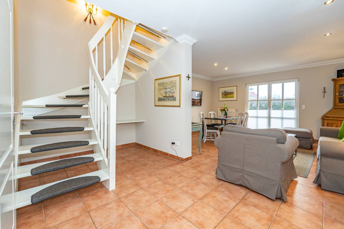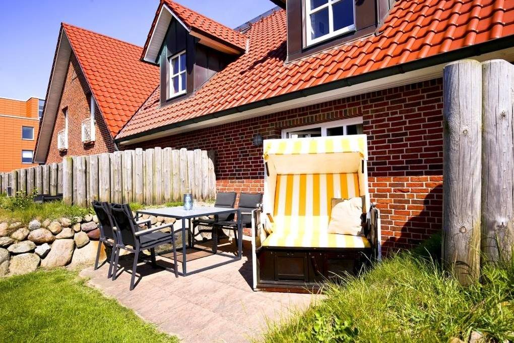 Vom Wohnzimmer betritt man die nach Süden ausgerichtete Sonnenterrasse mit Saison-Strandkorb (ca. April-Oktober) und Gartenmöbeln.