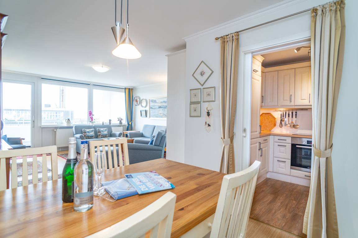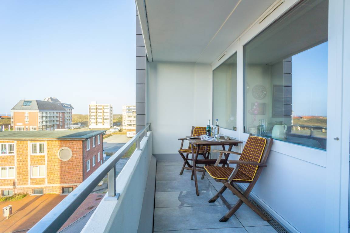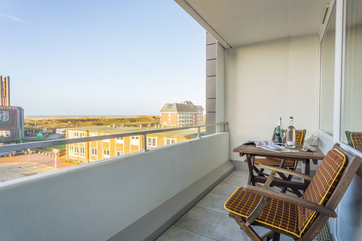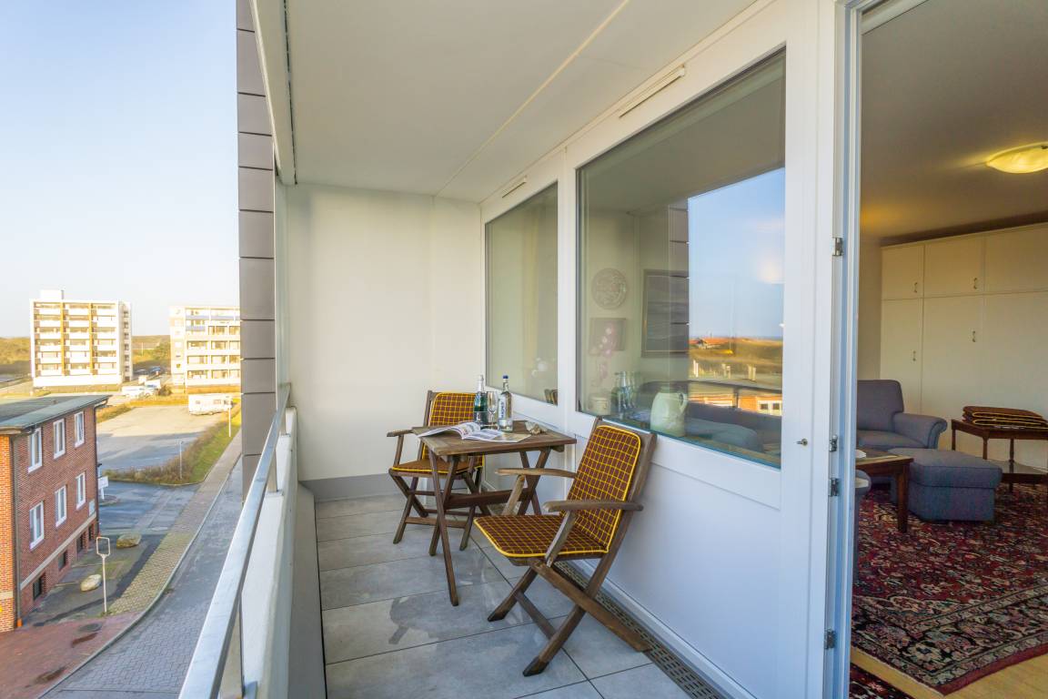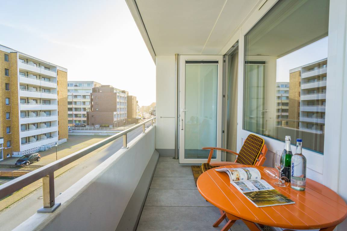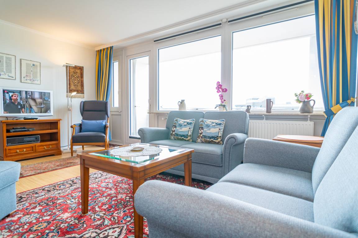 Komfortable 2-Zimmer-Nichtraucher-Ferienwohnung (ca. 76 qm) in der 3. Etage zur See- und Landseite mit Westloggia (Nachmittagssonne, mit Balkonmöbeln und Auflagen) und Ostloggia (Morgensonne, mit Balkonmöbeln und Auflagen) für max. 4 Personen.