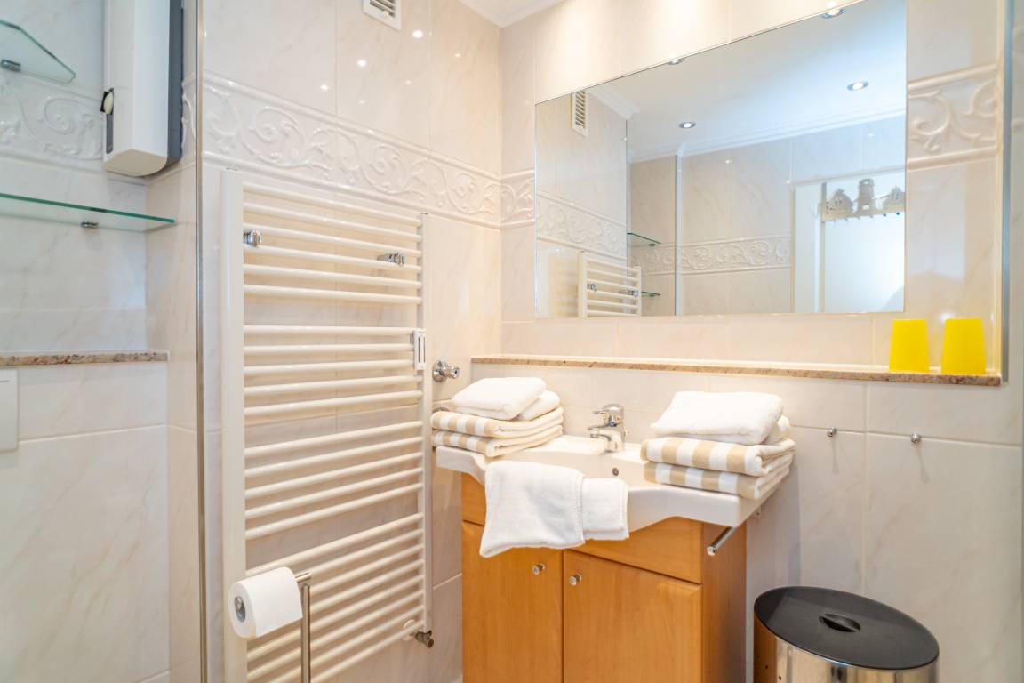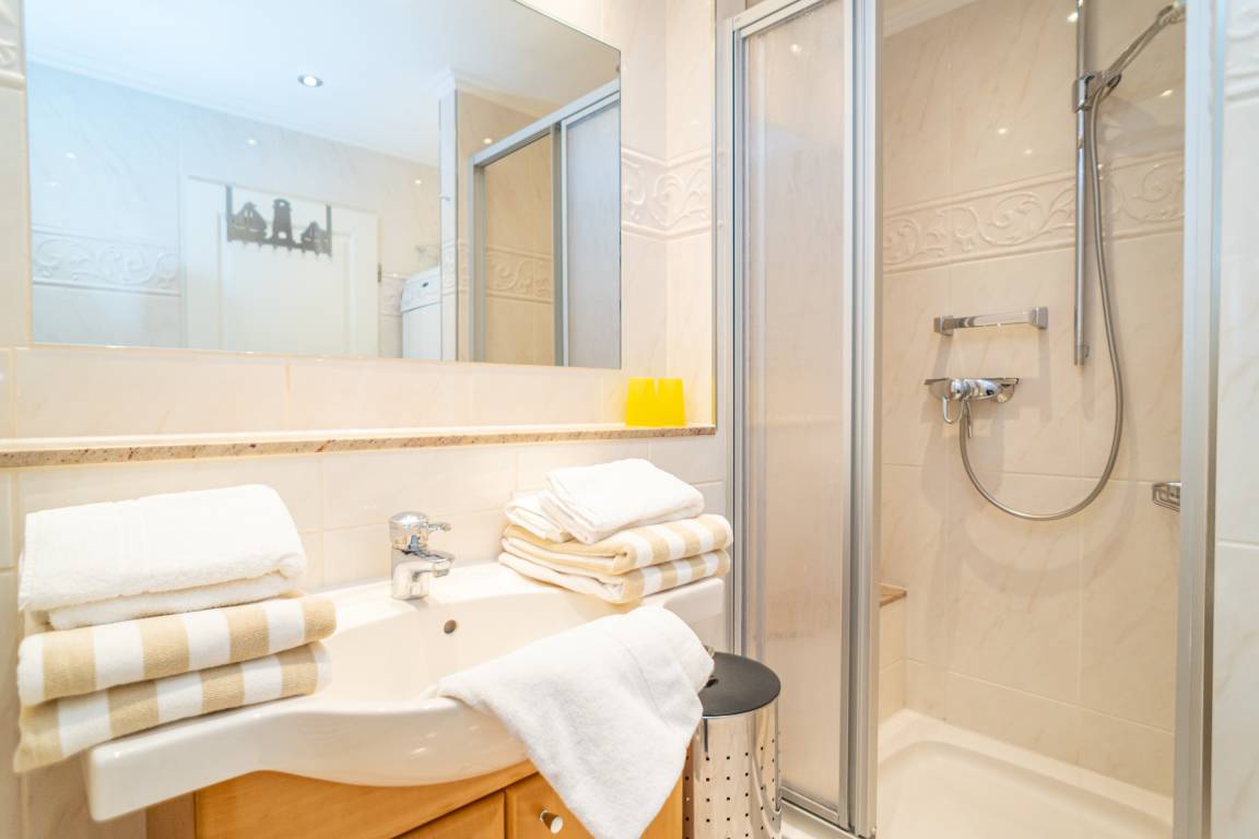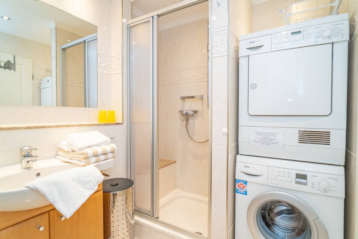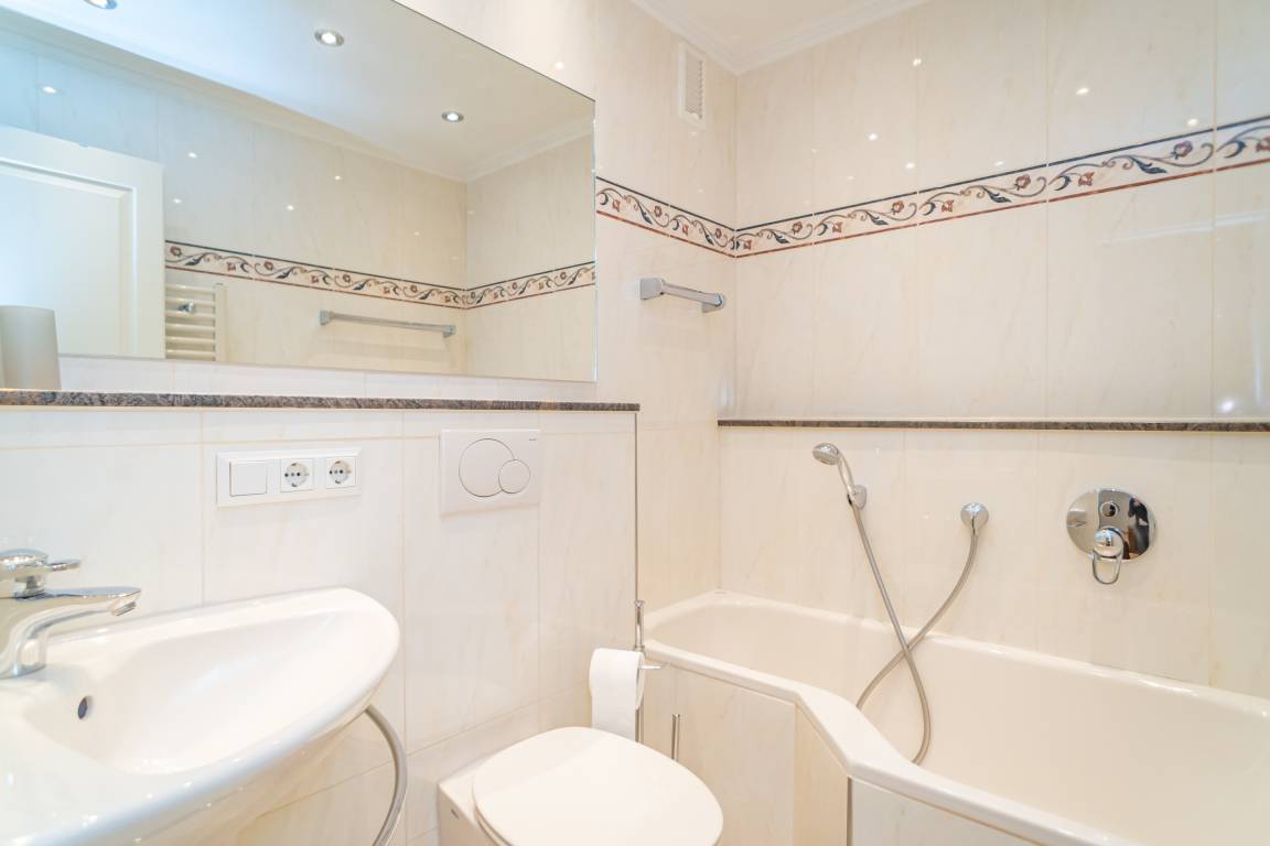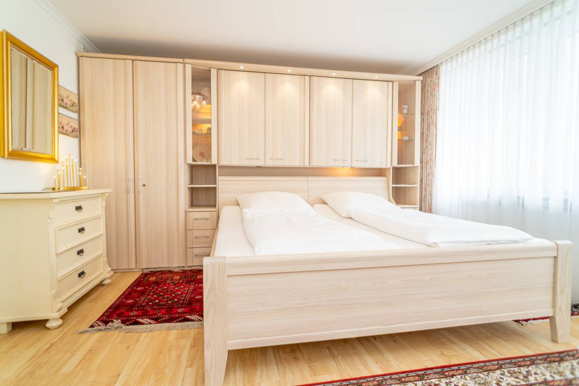 Das Wohnzimmer mit Austritt zur Westloggia hat eine Couchgarnitur mit zwei 2-Sitzer-Sofas, 2 Sesseln, einem Essplatz, einem Doppelschrankbett mit 1-türigem Kleiderschrank, Kabel-Flachbild-TV mit digitalem Empfang, Radio. Vom Wohnzimmer gelangt man in die neue, vollausgestattete, großzügige Küche mit Geschirrspüler, Backofen, Ceranfeld und mit Kühl- und separatem Gefrierschrank (mit 3 Gefrierfächern). Kaffeemaschine, Toaster, Wasser- und Eierkocher gehören zur Grundausstattung. Das große Schlafzimmer mit Austritt zur Ostloggia (Morgensonne) hat ein Doppelbett, viel Schrankraum und über den Zwischenflur direkten Zugang zum Badezimmer. Im 1. neuen Bad befinden sich eine Wanne, ein WC, ein Waschtisch und ein Handtuchtrockner. Im 2. neuen Bad befinden sich eine Dusche, ein WC, ein Waschtisch, ein Handtuchtrockner, eine Waschmaschine und ein Trockner (gebührenfreie Nutzung inklusive).