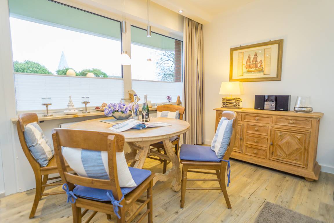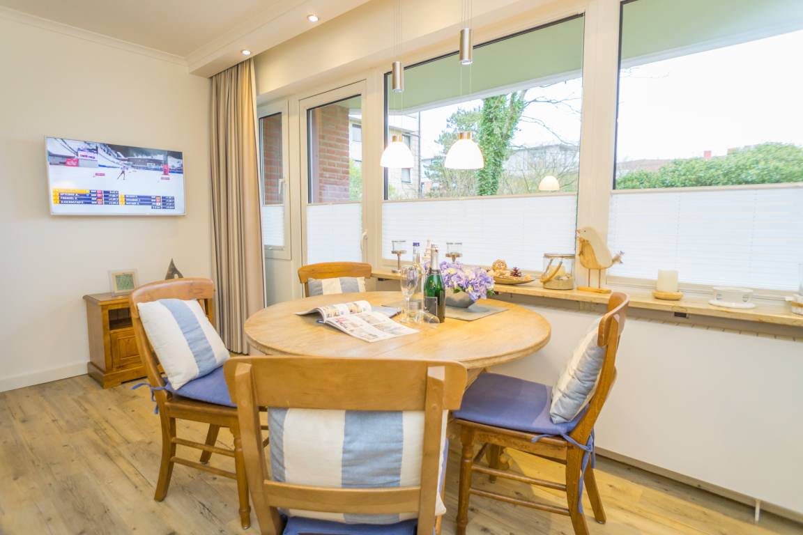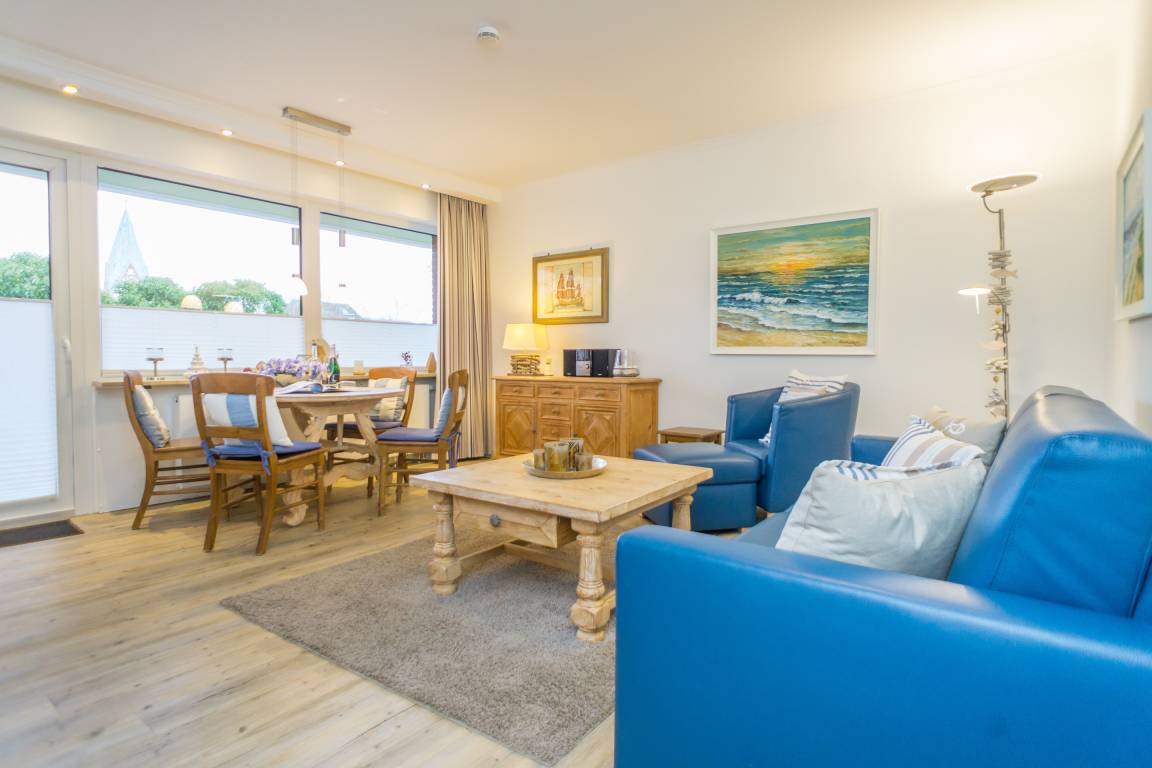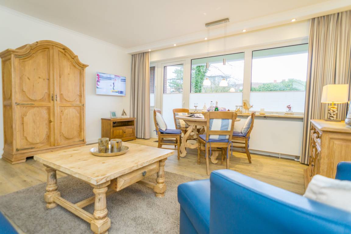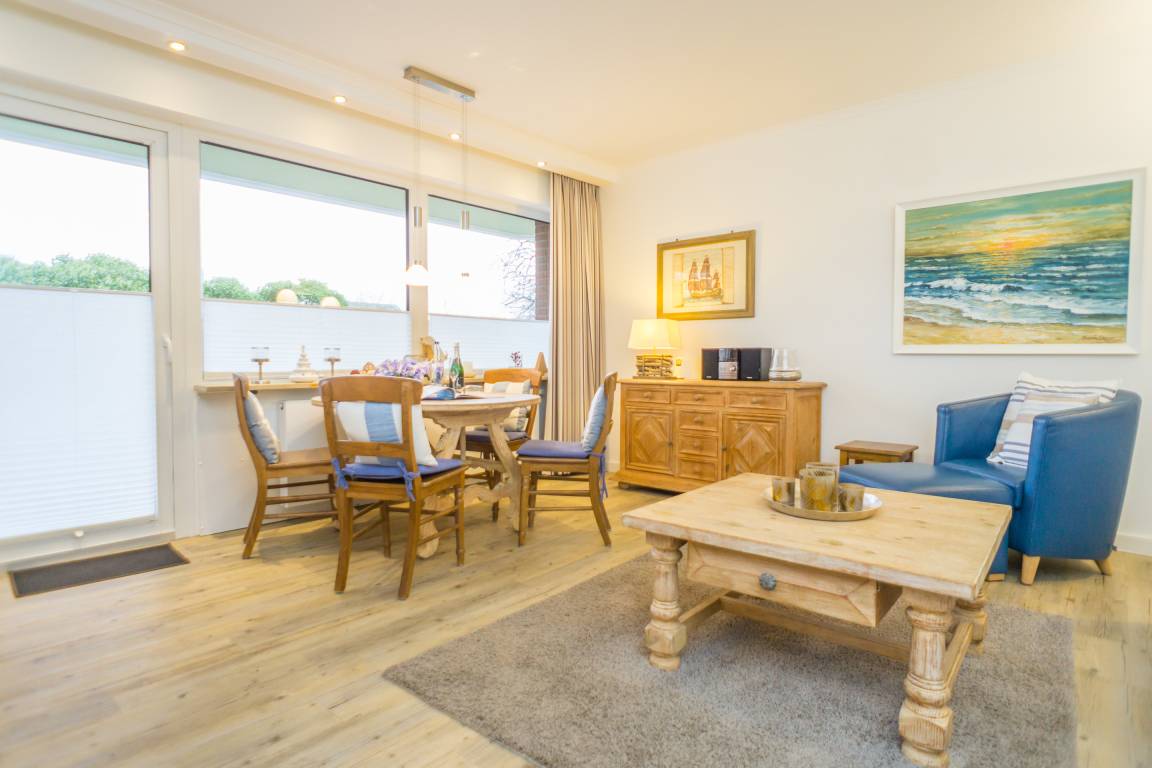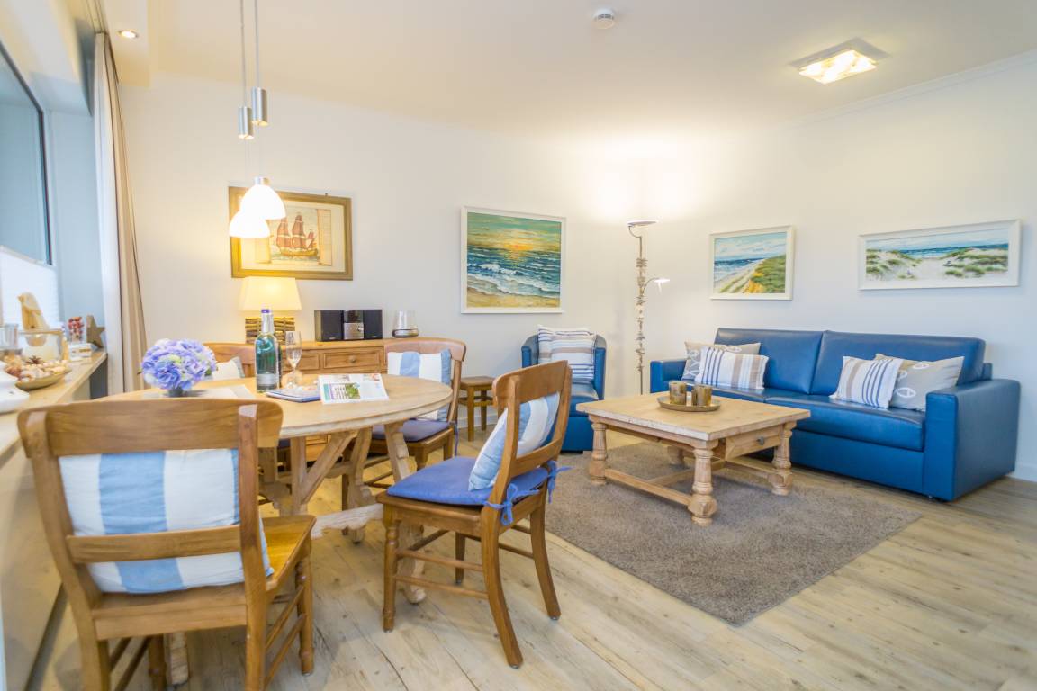 Der Wohnraum besteht aus einer Couchgarnitur von Bielefelder Werkstätten mit Schlaffunktion (separat ausklappbare Matratze in Komfortliegehöhe), einem Sessel, einem Essplatz, Kabel-Flachbild-TV, Radio und Telefon. Vom Wohnzimmer gelangt man in die vollausgestattete separate Küche bestehend aus einem Herd mit Backofen und Cerankochfeld, Geschirrspüler, Mikrowelle und Kühlschrank. Kaffeemaschine, Wasserkocher und Toaster gehören zur Grundausstattung.