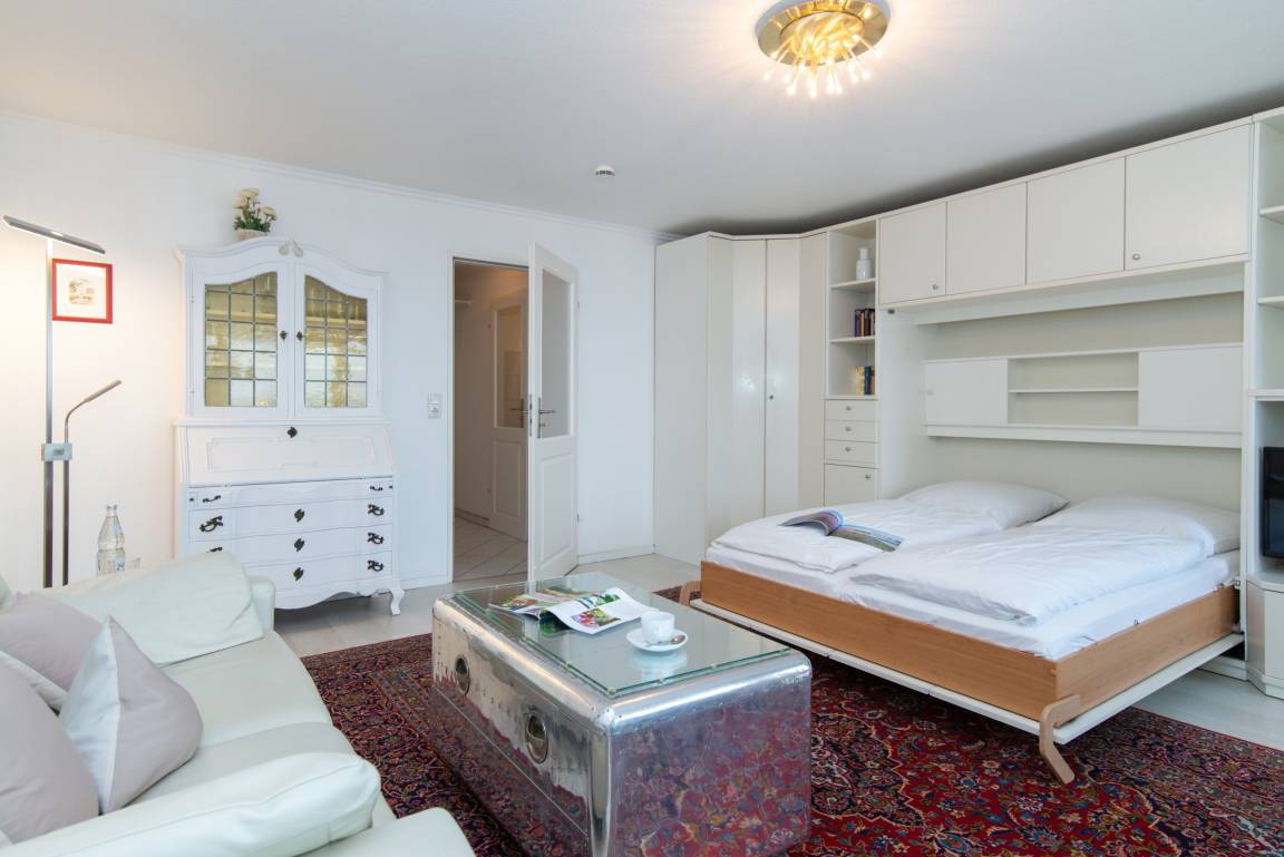 Der kombinierte Wohn-/Schlafraum besteht aus einer gemütlichen Sitzgarnitur (2-Sitzer-Couch), Doppelschrankbett (mit getrennten Matratzen, im Ganzen klappbar), Essplatz, Kabel-Flachbild-TV.