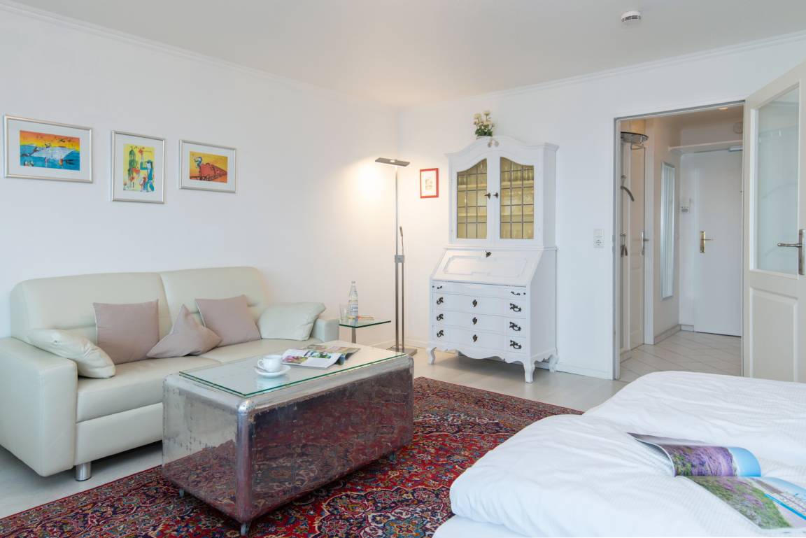 Angeboten wird Ihnen ein 1-Zimmer-Nichtraucher-Appartement (ca. 43 qm) in der 3. Etage mit Meerblick und Westloggia (Nachmittagssonne/Sonnenuntergang) für 2 Personen.