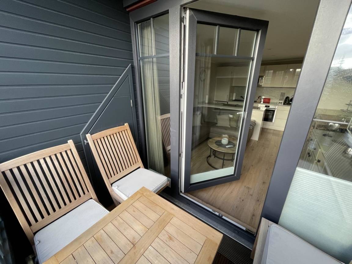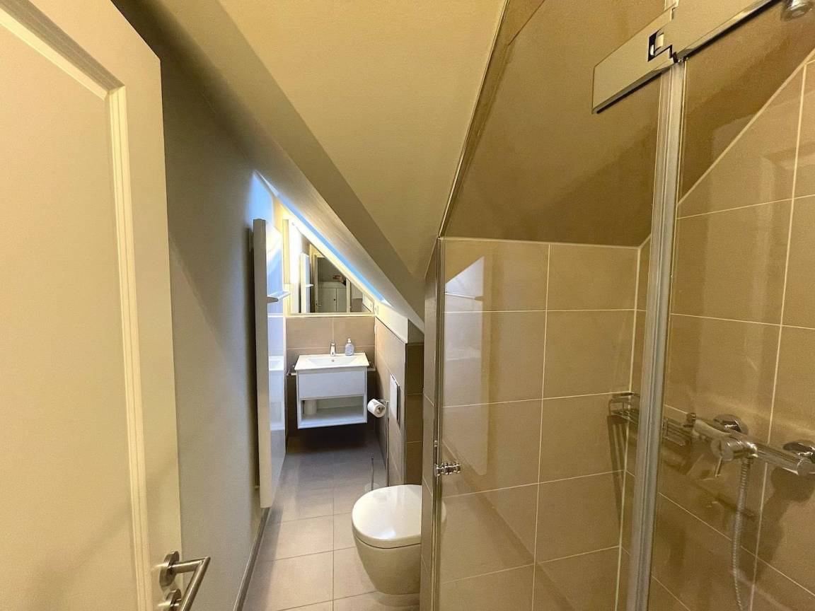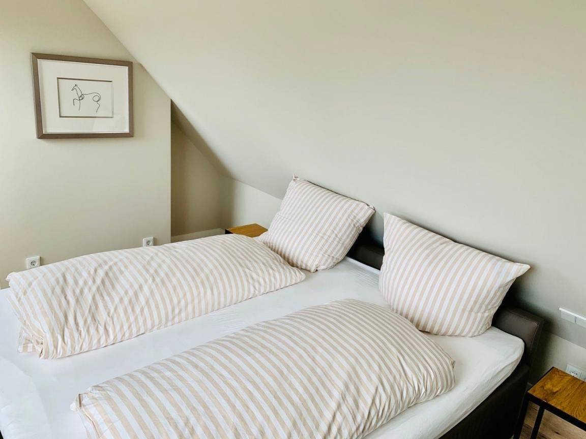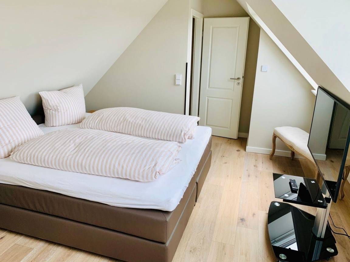 Modern eingerichtet bietet die Ferienwohnung Platz für bis zu 4 Personen. Die Wohnung liegt im Obergeschoss, erreichbar über das gepflegte Treppenhaus. Vom Flur aus gehen Schlafzimmer mit Doppelbett, das Bad und das Wohnzimmer mit Südbalkon ab. Das weitere Schlafzimmer mit Doppelbett erreichen Sie durch die interne Treppe nach oben, dort befindet sich ein weiteres Bad.