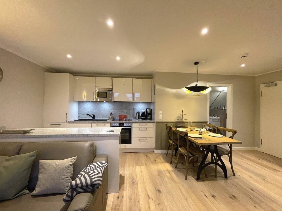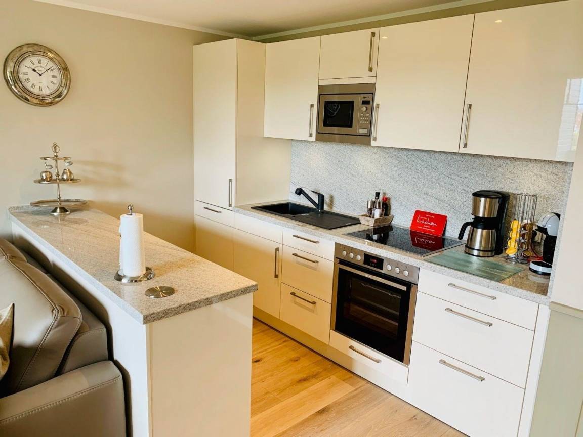 Besonders hervor zu heben ist die Sauna im Bad auf der Hauptebene, genießen Sie diese nach einem frischen Strandspaziergang. Der Küchenbereich ist als moderne Küchenzeile in das Wohnzimmer integriert.