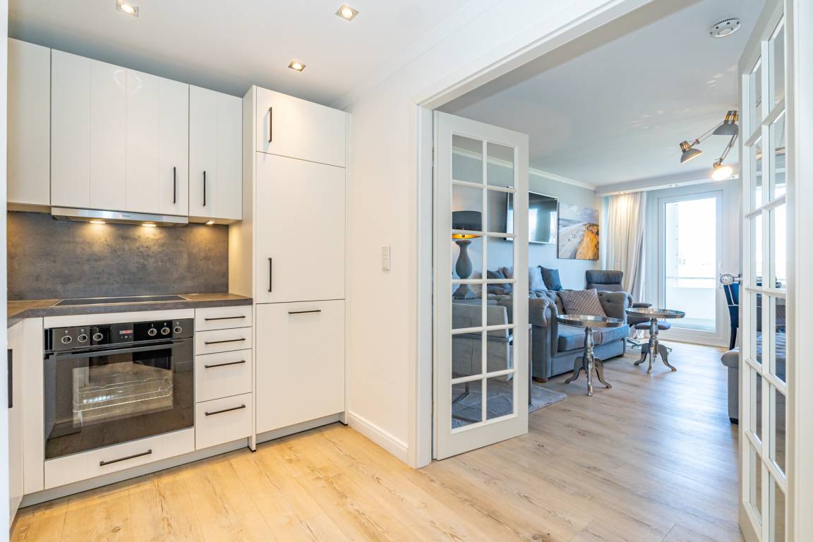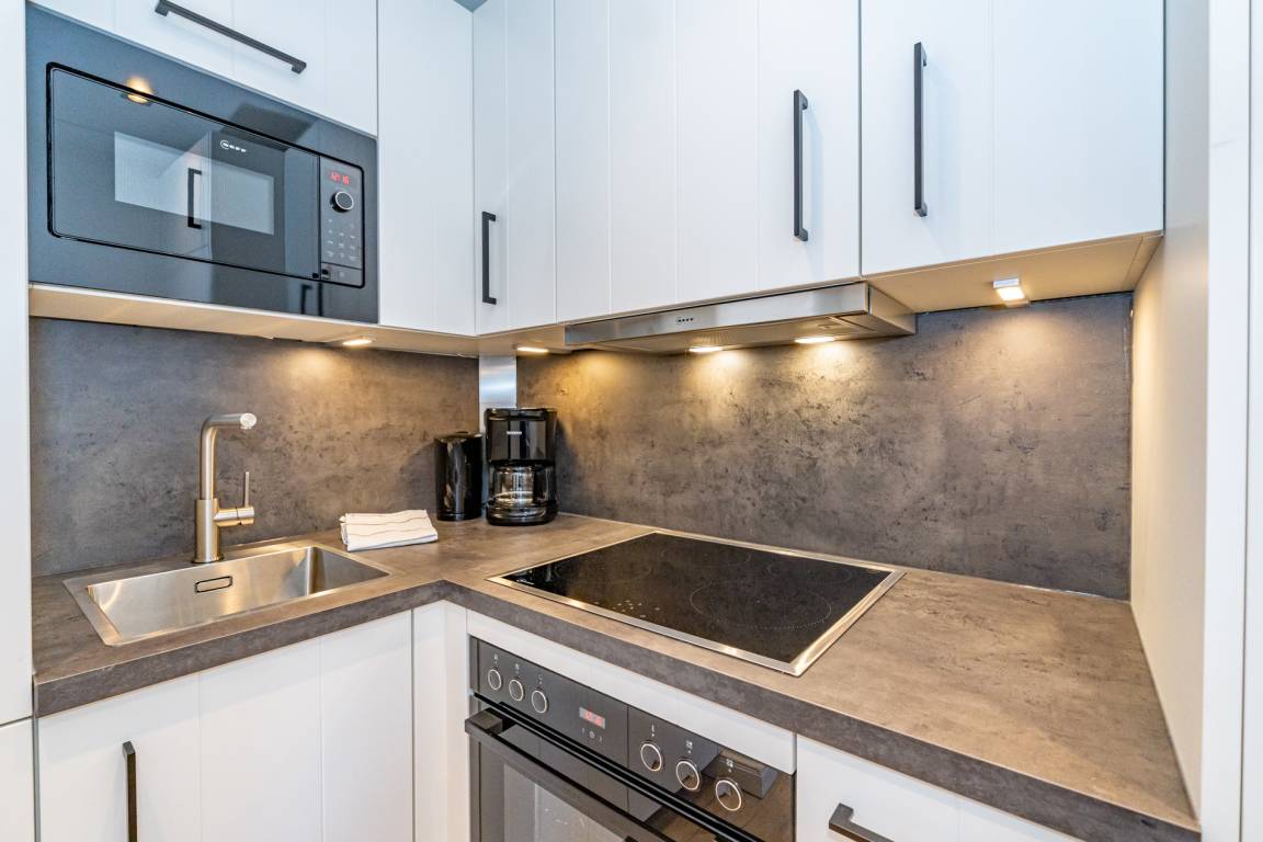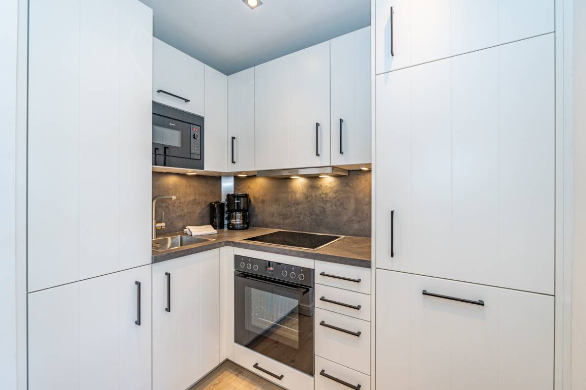 Die voll ausgestattete, offene Küche lässt mit Geschirrspüler, Mikrowelle, Herd mit Backofen und Cerankochfeld (4 Felder), Kühlschrank mit 3* Gefrierfach[nbsp] keine Wünsche offen. Kaffeemaschine, Wasserkocher und Toaster gehören zur Grundausstattung.