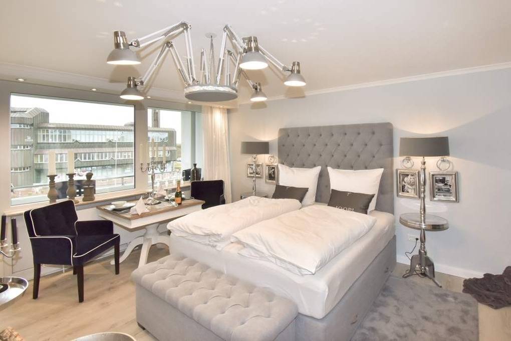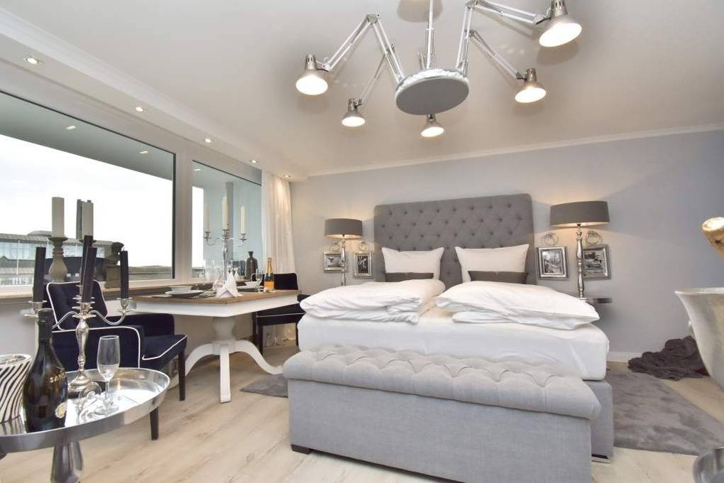 Der im exklusiven flämischen Landhausstil eingerichtete Wohn-/Schlafraum besteht aus einem sehr hochwertigem Sofa (2,5-Sitzer), einem neuen luxuriösen Boxspringbett (Liegefläche 1,80 x 2,00 m mit zwei Einzelmatratzen und einem durchgängigem Topper), einem gemütlichen Essplatz, einem Schreibtisch und einem Kabel-Flachbild-TV, Radio/CD sowie abdunkelnden Gardinen (Black out).