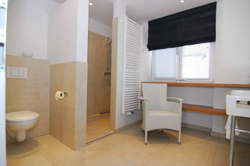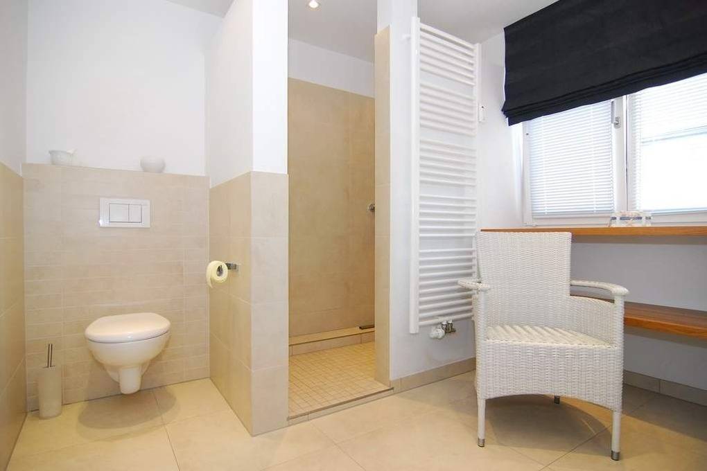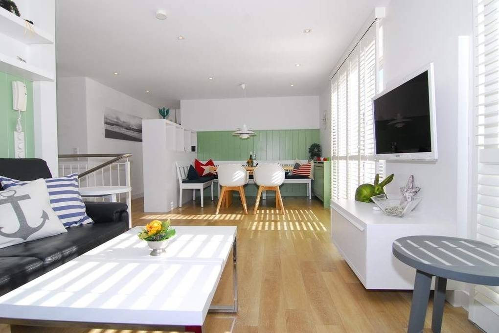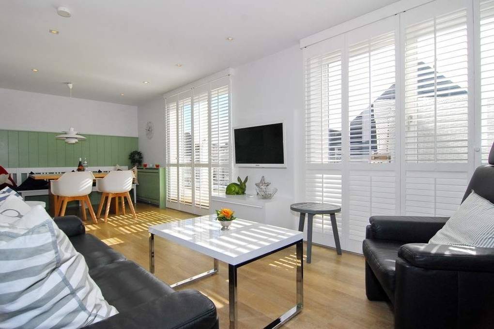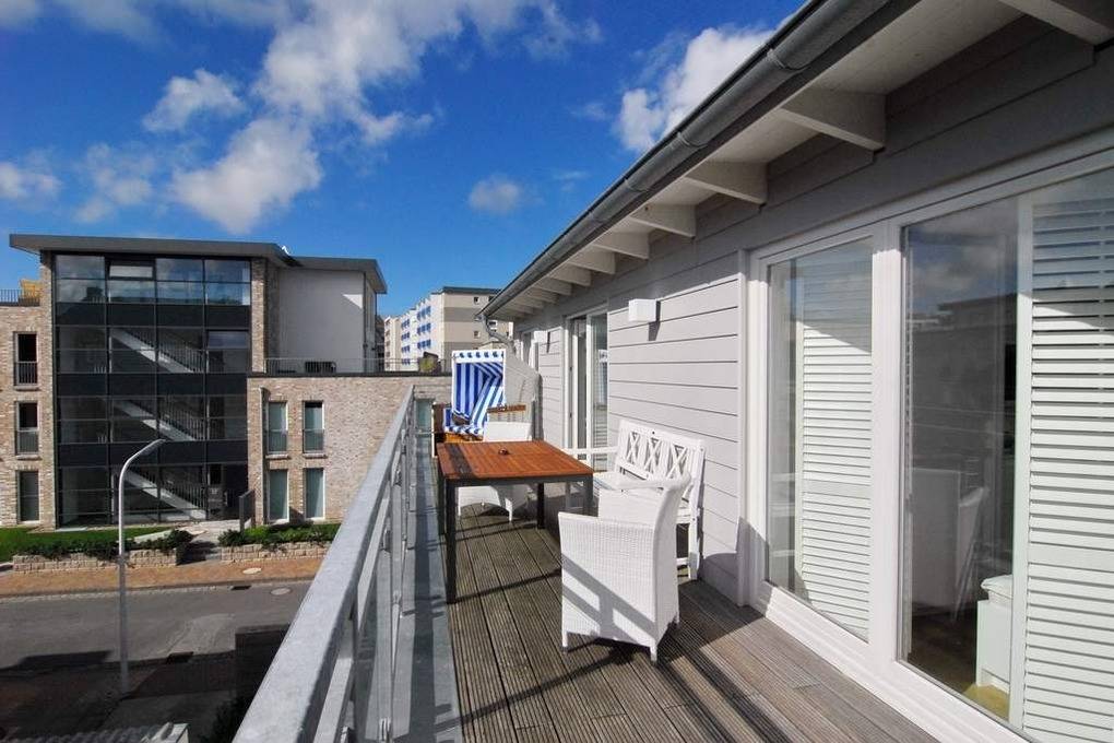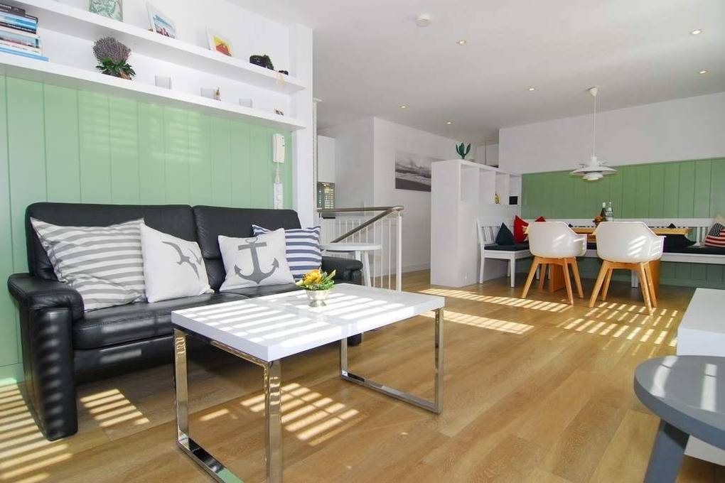 Exklusive 3-Zimmer-Ferienwohnung - Penthouse, 2. OG, ca. 90m², "Nichtraucher", Wohnzimmer mit Couch, Sessel, Esstisch mit Eckbank und 2 Rattanstühlen, Flat-TV, WLAN (ohne Gewähr), Musikanlage, offene Küche mit Geschirrspüler, Mikrowelle und Backofen, Zugang zur Südterrasse, 1 Schlafzimmer mit Doppelbett, Einbauschrank und Flat-TV und Zugang zur Terrasse, 1 Schlafzimmer mit Etagenbetten (Matratzen 1x2m) Einbauschrank und Flat-TV, 1 großes Duschbad / WC, 1 Gäste-WC, Flur mit Garderobe, Abseite mit Waschmaschine, Pkw-Stellplatz am Haus. Tierhaltung ist nicht gestattet. Bettwäsche und Handtücher sind zur Anreise aufgezogen. Auf dem östlich angrenzenden Nachbargrundstück entsteht ein Neubauvorhaben mit Baubeginn Juli 2024 - geplante Fertigstellung Winter 2026. Hier kann es zu Lärmbelästigung kommen.