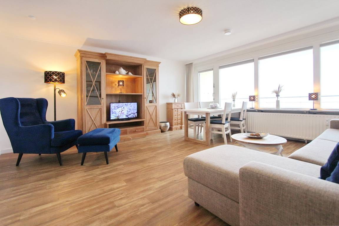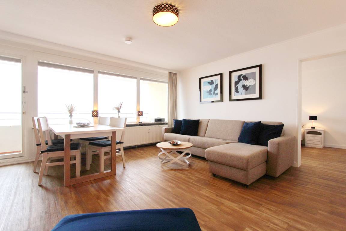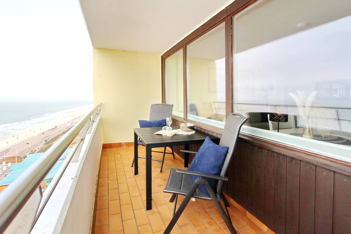 Große Zweizimmerwohnung in der 12. Etage im Haus Metropol mit herrlichem Blick über den Strand und das Meer. Das Wohnzimmer und das Schlafzimmer haben je einen vorgelagerten Westbalkon mit Loungemöbeln. Ausgestattet ist die Wohnung mit einer Couch mit Schlaffunktion, 1 gemütlichen Ohrensessel mit Hocker, einem Essplatz mit 4 Stühlen und einer Schrankwand mit viel Stauraum. Designboden in Holzoptik verleiht dem Raum Wärme und Gemütlichkeit. Im Schlafzimmer gibt es ein feststehendes Doppelbett mit 2 Matratzen und ein TV. Im separaten Ankleidezimmer gibt es einen großen Kleiderschrank, Sessel und Spiegel. Um sich selbst zu verpflegen verfügt diese Wohnung über eine kleine Küche mit Geschirrspüler, Backofen, Ceranfeld und Mikrowelle. Stilvoll decken Sie den Tisch mit Geschirr von Thomas Trend. Das Badezimmer hat eine Dusche, die einen niedrigen Einstieg hat, einen Fön und einen Handtuchtrockner. Zur technischen Ausstattung gehört: ein Flachbildfernseher von Panasonic und ein Radio. Ein freies WLAN Netzwerk (WEG Haus Metropol - Passwortfrei - ohne Gewähr) steht ihnen kostenfrei zur Verfügung. Wohnungsgröße: ca. 67 m².