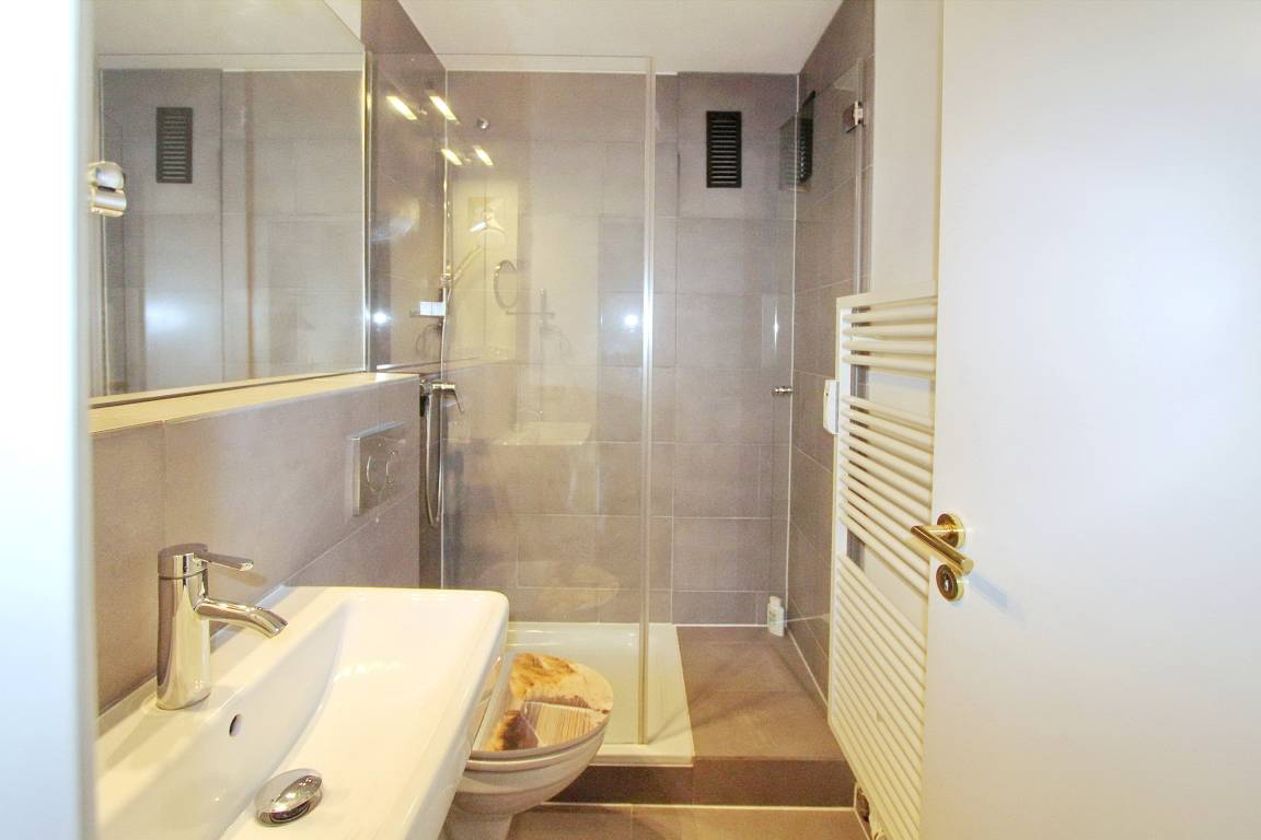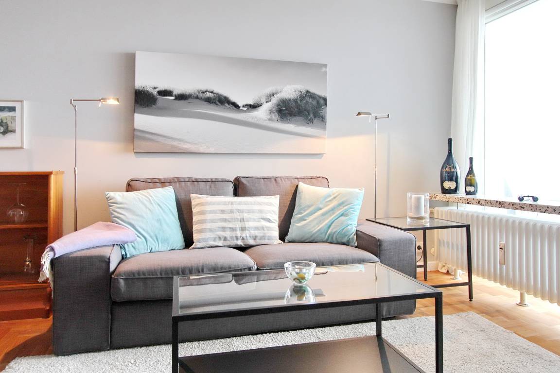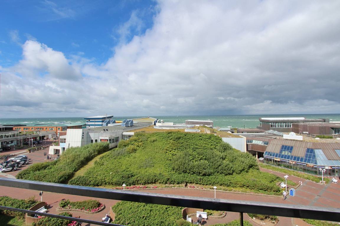 Ferienwohnung in der 5. Etage des Haus Eydum mit tollem Blick auf die Nordsee. Wenn man die Wohnung betritt steht man im Flur, im dem sich Schränke mit viel Stauraum befinden. Vom Flur geht eine Abstellkammer ab und das Badezimmer mit Dusche, Handtuchtrockner, Fön und Kosmetikspiegel. Der Einstieg der Dusche ist niedrig. Im Wohn-/Esszimmer gibt es eine bequeme Couch, 2 Korbstühle und ein Sideboard, zum offenen Küchenbereich gibt es einen Tisch mit 2 Stühlen. Um sich selbst zu verpflegen ist die Küche voll ausgestattet und verfügt über einen Geschirrspüler, ein 4 Platten Ceranfeld und einen großen Kühlschrank mit Gefrierfach. Selbst ein Smoothiemaker von WMF und eine zusätzliche Nespressomaschine sind vorhanden.