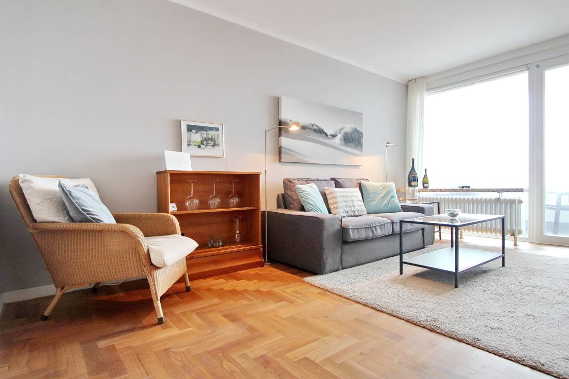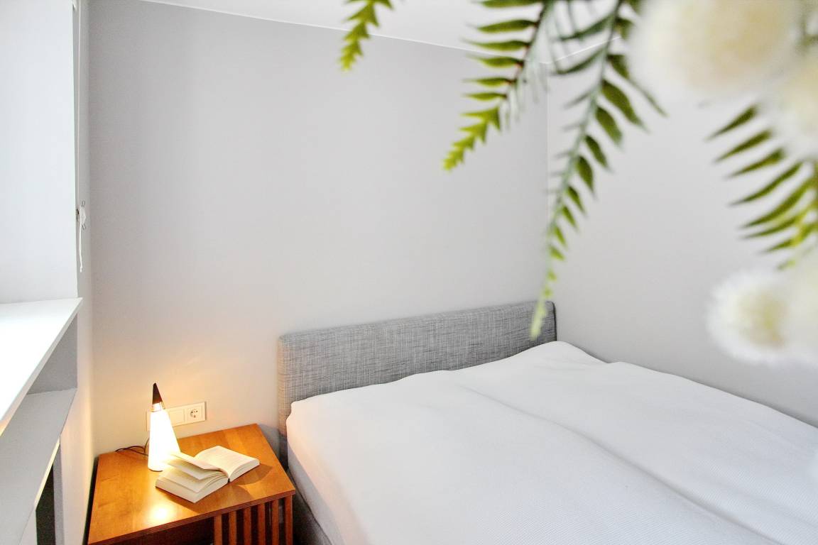 Vom Wohnbereich geht es in das kleine Schlafzimmer mit Fenster. Es steht ein Doppelbett drin, dass nur von einer Seite begehbar ist. Vom Wohnbereich kann man auf den Balkon gehen. Sie sitzen dort auf Rattanmöbeln (3 Stühlen und ein Tisch). Zur technischen Ausstattung der Wohnung gehört ein Smart Fernseher von Panasonic (mit T-Home Entertain), ein DVD Player und eine Soundbox von Bose. Das WLAN des Eigentümers können Sie kostenfrei nutzen (die Zugangsdaten finden sie auf dem Router in der Wohnung). Den kostenfreien Parkplatz Nr. 69 (hinter dem Haus, rechte Seite, 5. Stellplatz von unten gezählt) können Sie gerne nutzen. Eine große Auswahl an Büchern und DVDs steht Ihnen in dieser Nichtraucherwohnung zur Verfügung. Die Wohnungsgröße ist ca. 45 m².
