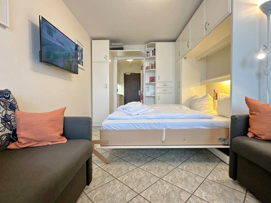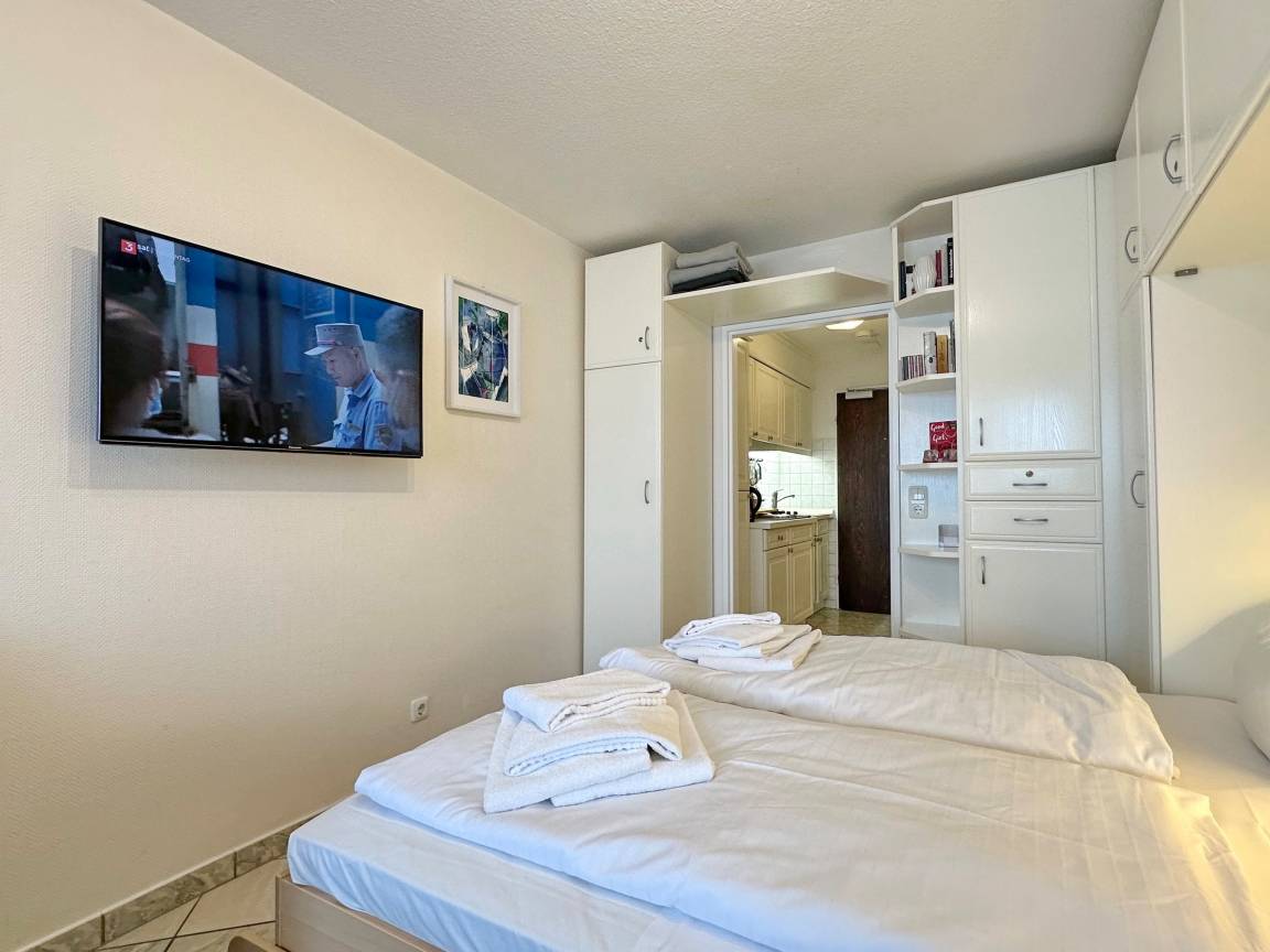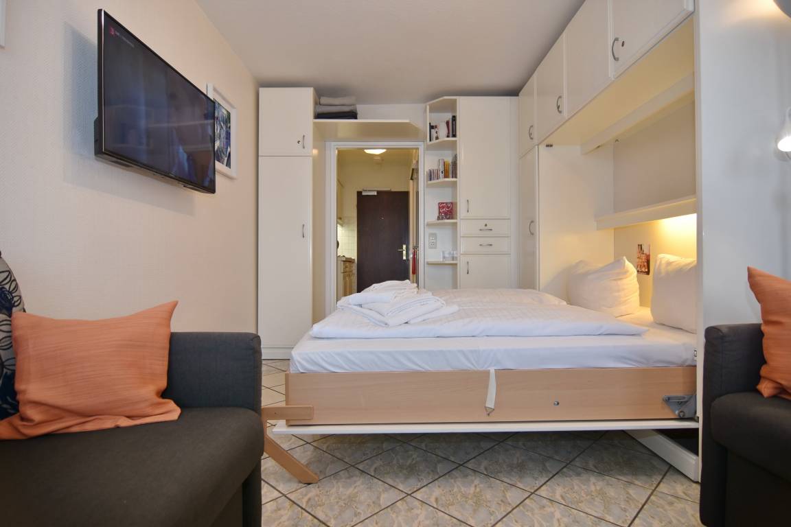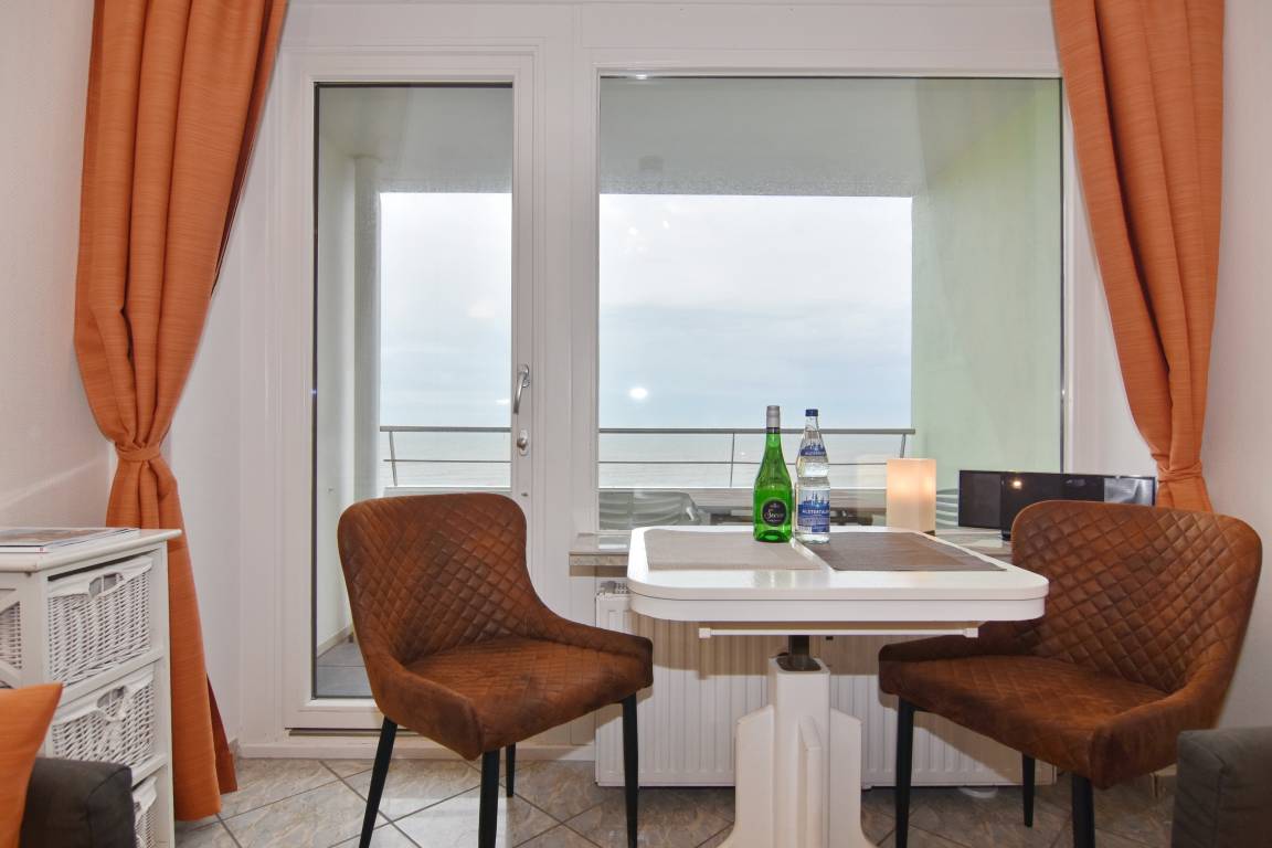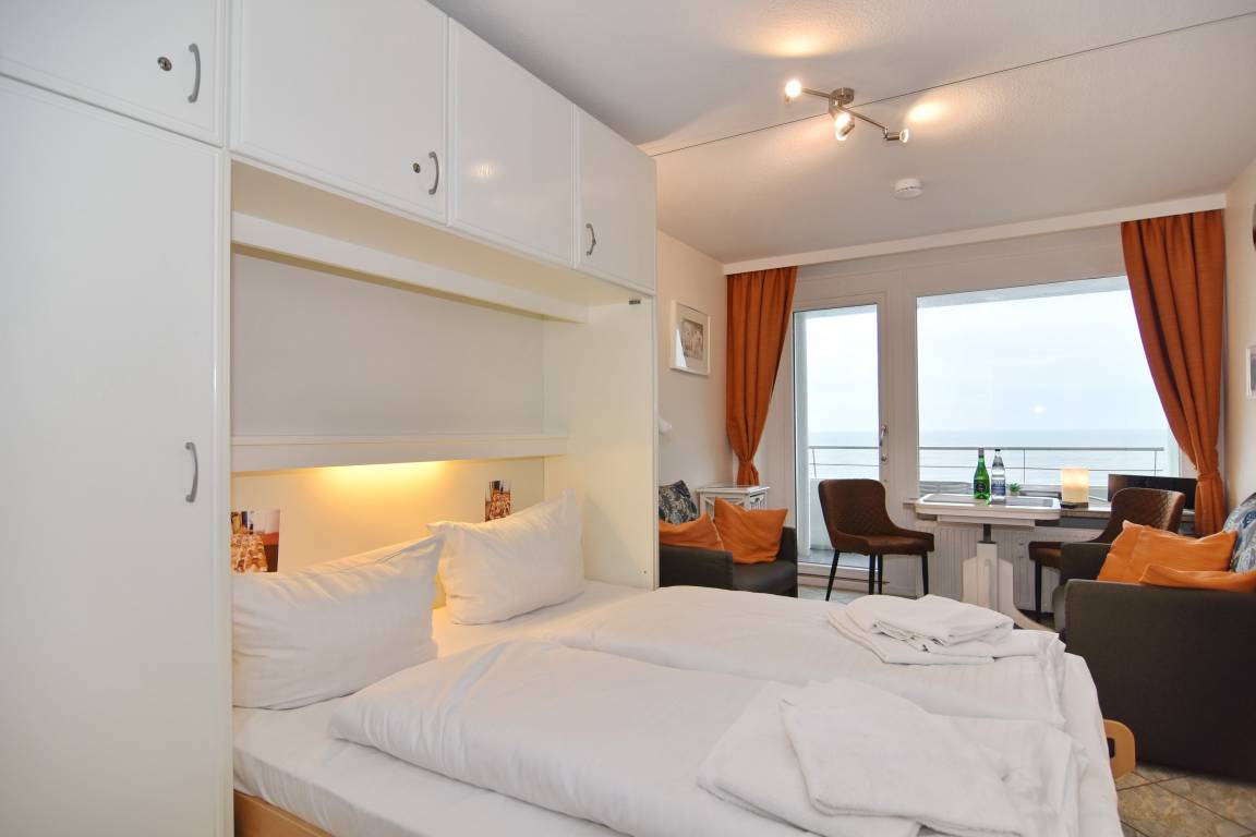 Hübsche 1-Zimmer-Ferienwohnung im 5. OG des "Haus am Meer". Ca. 25 qm. Nichtraucher-App.! Helles Wohn-/Schlafzimmer mit Doppelschrankbett (2x90x200), Eßplatz am Fenster, 2 Sessel, Flachbild-TV, Radio, Westbalkon mit Balkonmöbeln und freiem Meeresblick, moderne Küchenzeile mit Mikrowelle im Flurbereich, Duschbad/WC. W-LAN (ohne Gewähr). Das App. ist komplett gefliest. Bettwäsche und Handtücher sind zur Anreise aufgezogen. Ein PKW-Stellplatz kann kostenpflichtig zugebucht werden. Tierhaltung ist nicht gestattet.