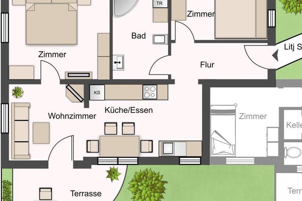 3-Zimmer-Nichtraucher-Hausteil (ca. 53 qm) im Bungalowstil mit möblierter, windgeschützter Terrasse.