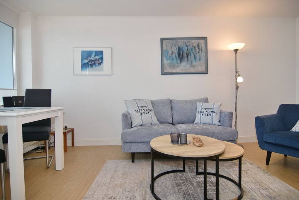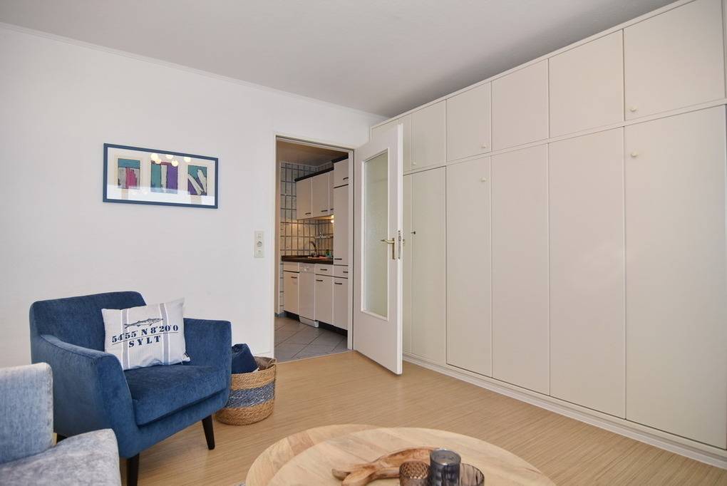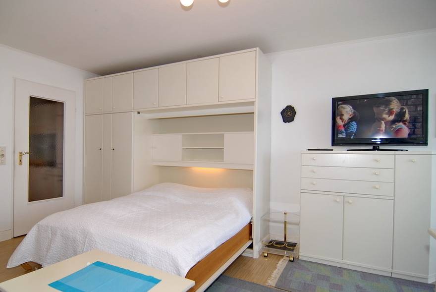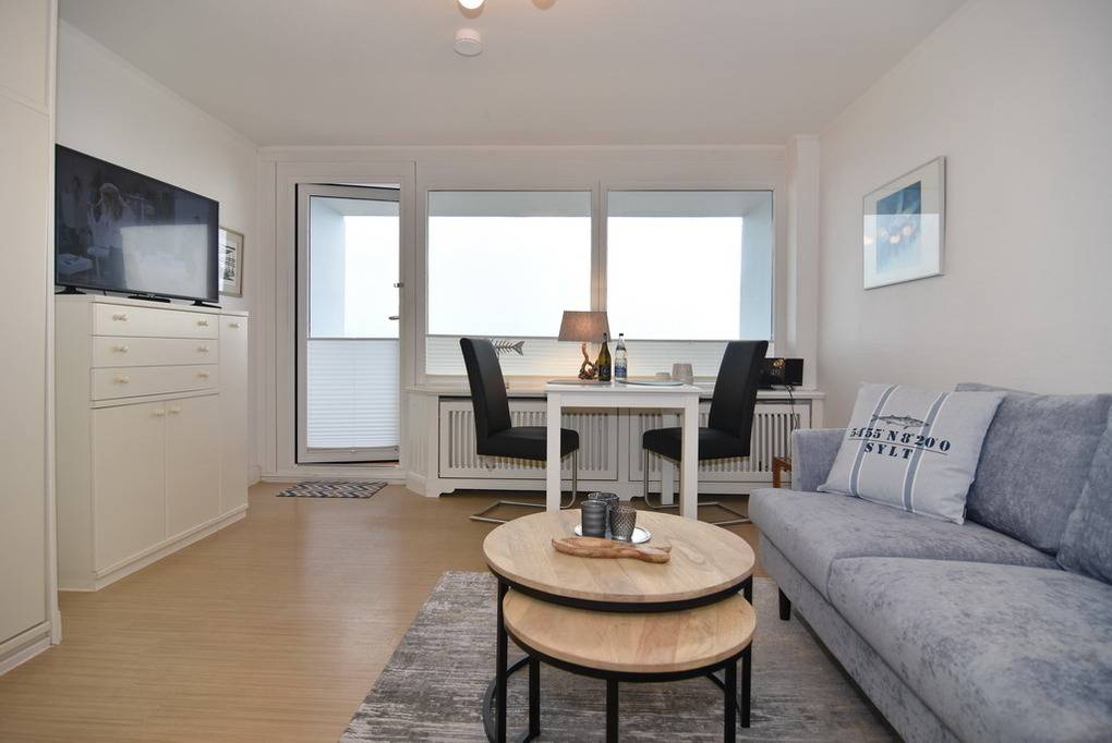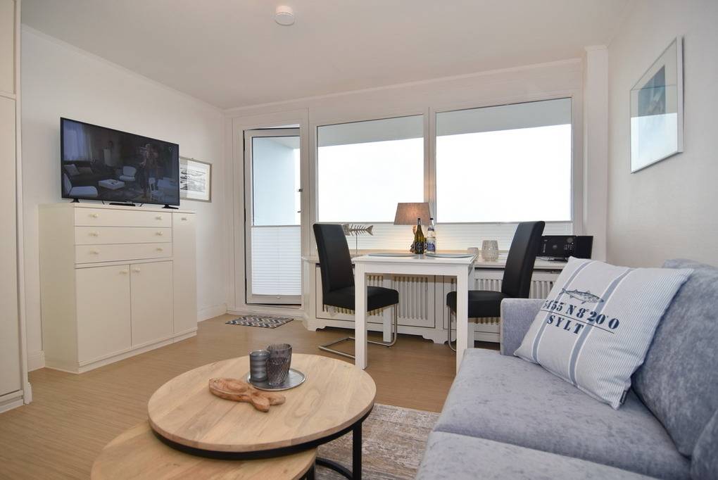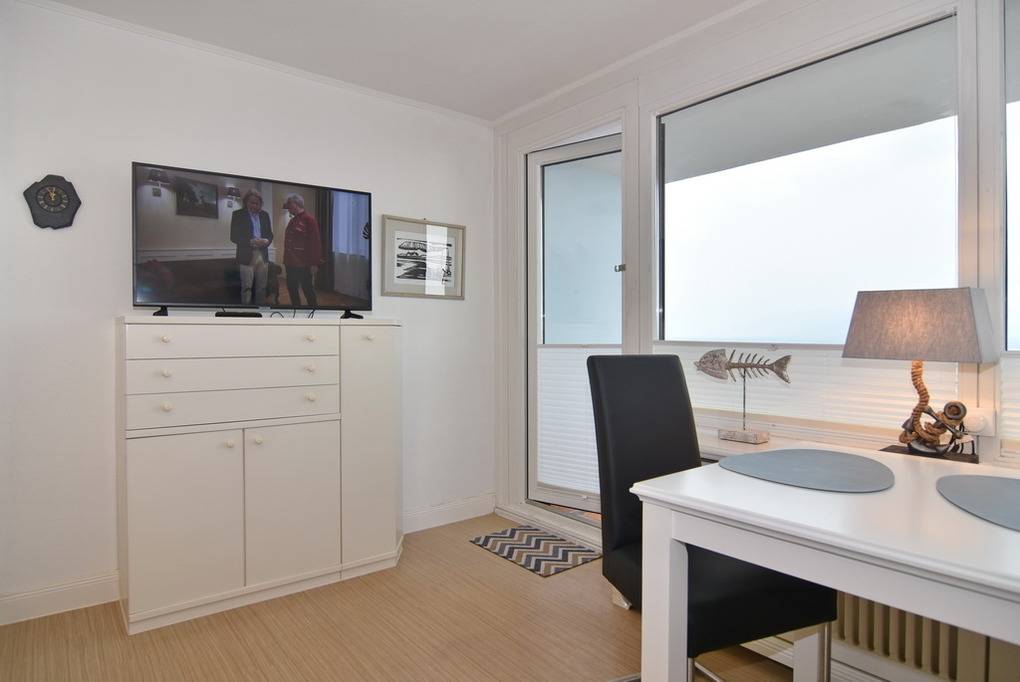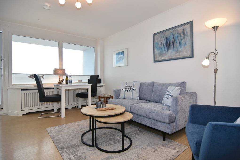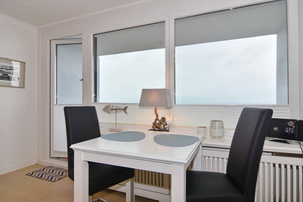 1 Zimmer-Ferienwohnung im Haus Metropol zur Seeseite, 12. OG, ca. 34 m². Kombinierter Wohn-/Schlafraum mit Doppelschrankbett (2x80x200), 2-Sitzer-Couch, Sessel, Eßtisch, Kabel-TV, Radio, WLAN (ohne Gewähr), Westbalkon mit Meeresblick, Küchenzeile mit Geschirrspüler, Duschbad/WC.[ Wohnung ist mit Fliesen und Parkett verlegt. Tierhaltung und Rauchen ist hier nicht gestattet. Bettwäsche und Handtücher sind zur Anreise aufgezogen. Ein PKW-Stellplatz kann kostenpflichtig zugebucht werden.