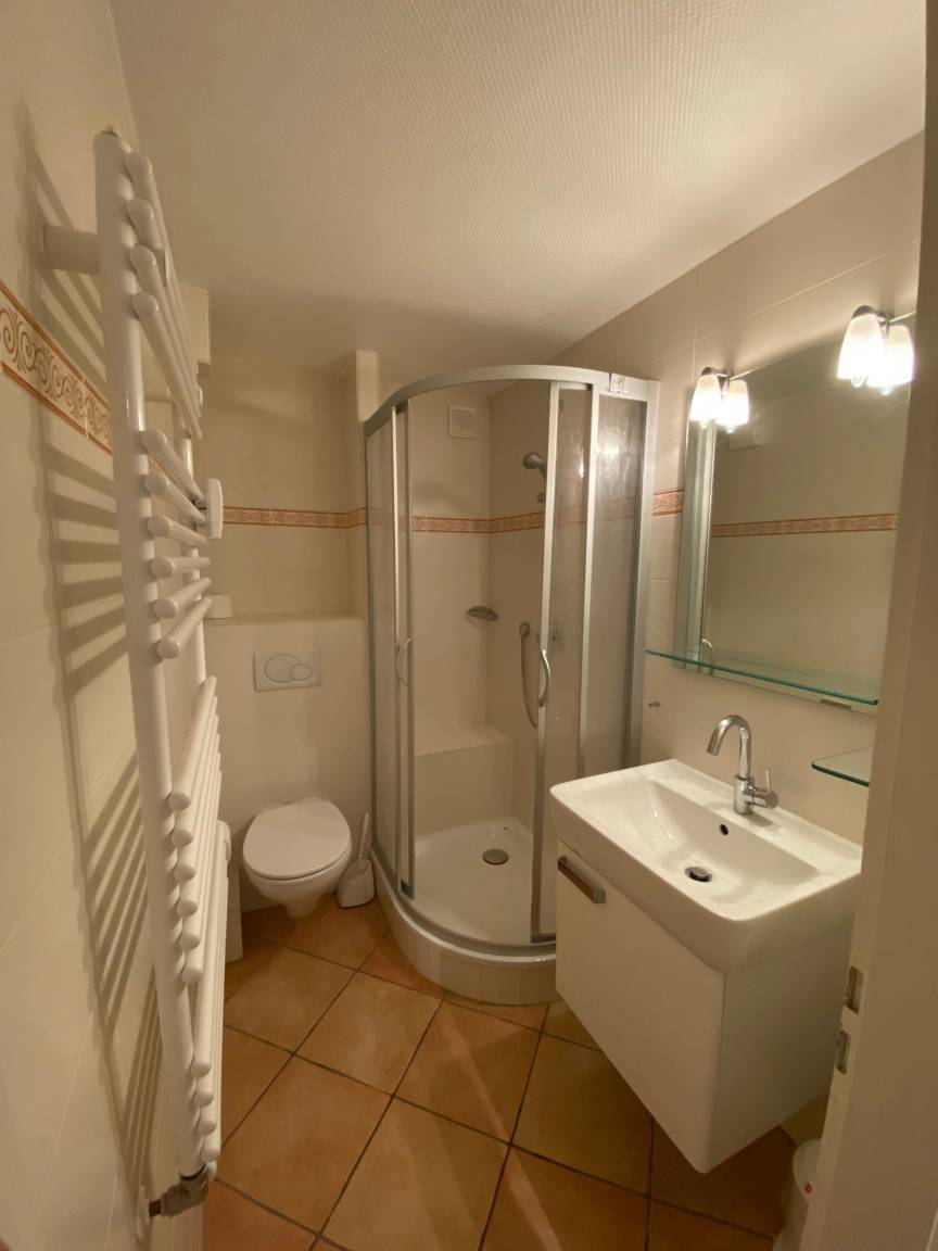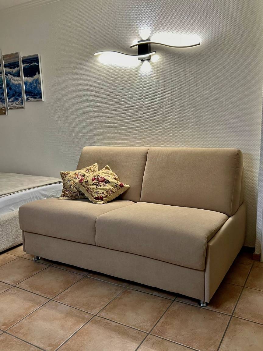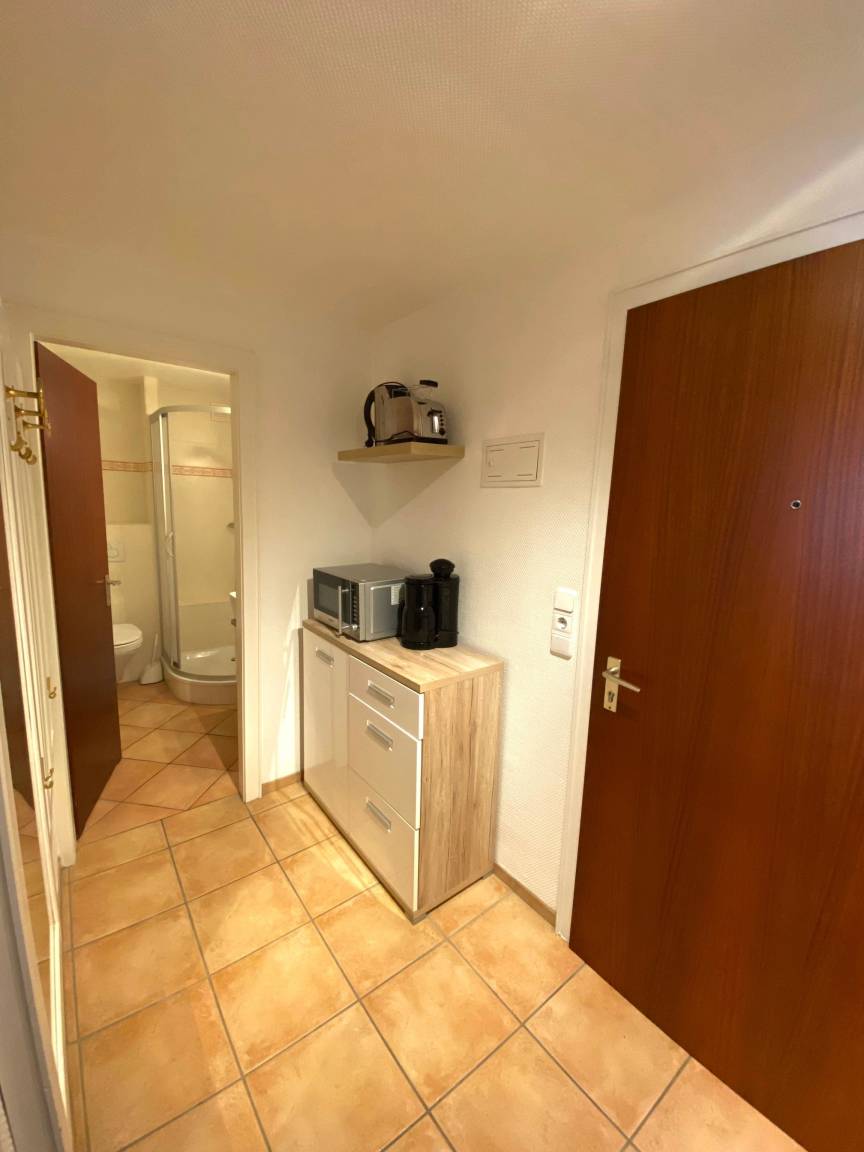 Ein hell und freundlich eingerichteter Wohn-/Schlafraum mit fest- und auseinanderstehenden Einzelbetten je 90 x 200. Einem Essplatz für 2 Personen am Fenster und einer Couch. Die große massive Holz Schrankwand bietet viel Stauraum für Ihre persönlichen Dinge. Die Küchenzeile im Flur hat ein Ceranfeld mit 2 Platten und eine Mikrowellen-Backkombination. Auch eine Kaffeemaschine, Esspressokocher sind vorhanden Im renoviertem Badezimmer gibt es eine schöne Dusche, einen beheizten Handtuchhalter, einen Kosmetikspiegel mit Beleuchtung und 7 fach Vergrößerung sowie einen Fön und einen Badezimmerhocker.