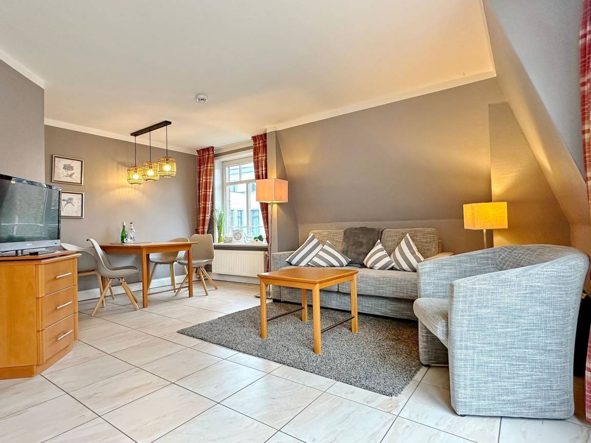 Hübsche 2-Zimmer-Ferienwohnung im Haus "Olympia IV" im 1.OG mit sonnigem Südwestbalkon. Ca. 50m². Nichtraucherwohnung. Wohnzimmer mit Küchenzeile mit Geschirrspüler und Mikrowelle, Doppelschlafcouch und Essplatz für 4 Personen, Duschbad/WC, Schlafzimmer mit Doppelbett, Flur mit Garderobe, TV / Radio. Unter Haus 4 befindet sich das Schwimmbad mit Finnischer Sauna. Unter Haus 2 befindet sich ein separater Wellnessbereich mit Dampfsauna, Finnischer Sauna und Ruhebereich. Eine Waschküche mit Gemeinschaftswaschmaschine/Trockner ist vorhanden. Offenes W-LAN-Netzwerk steht zur Verfügung (ohne Gewähr). Bettwäsche und Handtücher sind zur Anreise aufgezogen. Ein Garagenstellplatz kann kostenpflichtig gebucht werden!