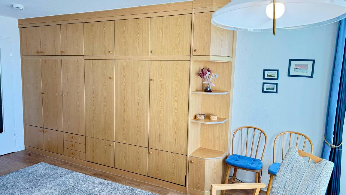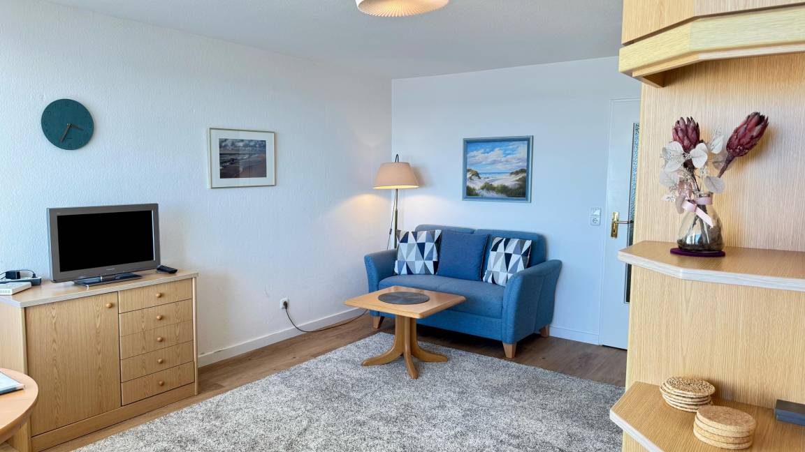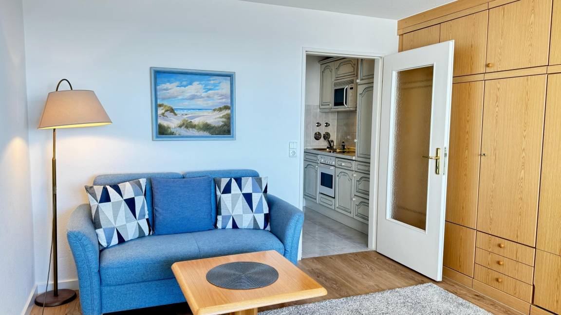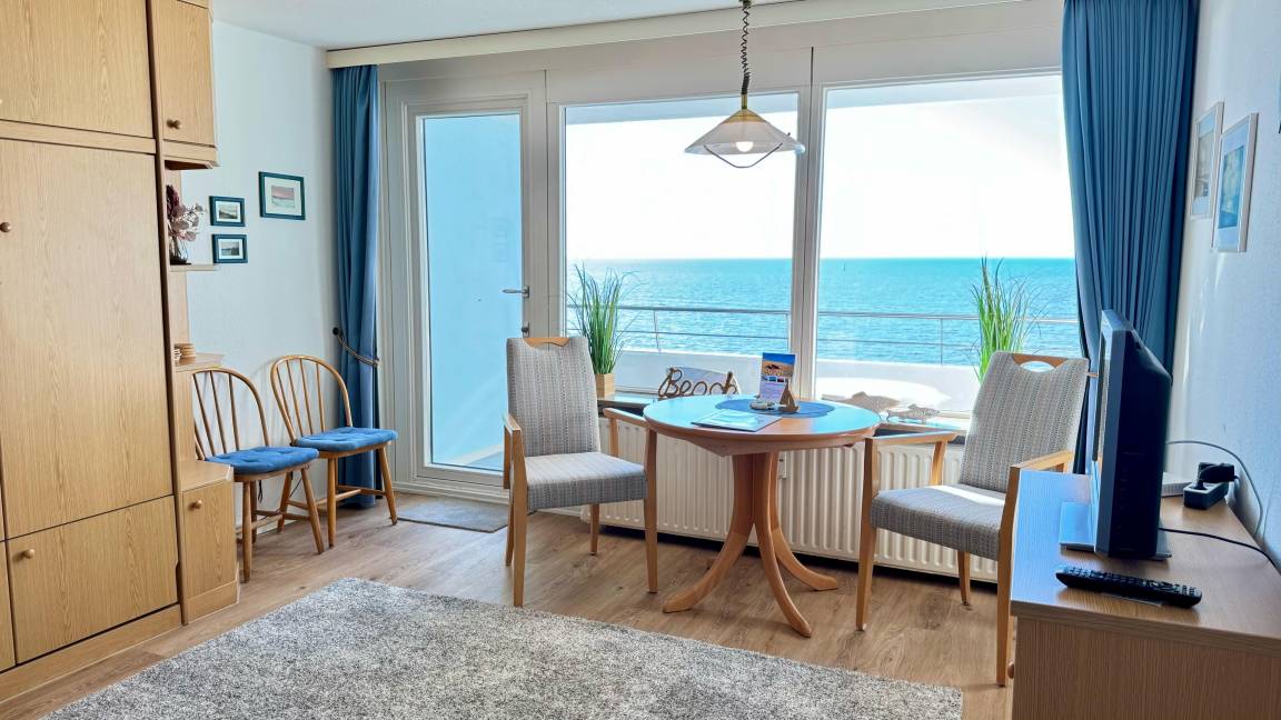 Dieses helle, gut ausgestattete 1-Raum-Appartement befindet sich in der 6. Etage des Hauses "Haus am Meer" im Kurzentrum Westerlands und hat ca. 34 m² Wohnfläche. Es besitzt eine voll ausgestattete Küchenzeile mit einem 4 Flammen-Ceranfeld, Geschirrspüler, Backofen, Kühlschrank, Kaffeemaschine, Wasserkocher, Toaster und Mikrowelle sowie ein weißes Bad mit Dusche/Vollbad. Im gemütlich eingerichteten Wohnraum befindet sich eine bequeme Couch mit Tisch, eine Appartementwand mit einem Doppelbett, sowie Kabel-Flachbild-TV und ein Radio. Im gesamten Haus steht Ihnen ein freier WLAN-Zugang (ohne Gewähr) zur Verfügung. Direkt vor dem Fenster zur Seeseite ist der Essbereich eingerichtet und bietet beim Speisen einen einmaligen Ausblick über die Nordsee. Der Westbalkon ist mit Balkonmöbeln ausgestattet und bietet einen traumhaften Seeblick bis zum endlosen Horizont.