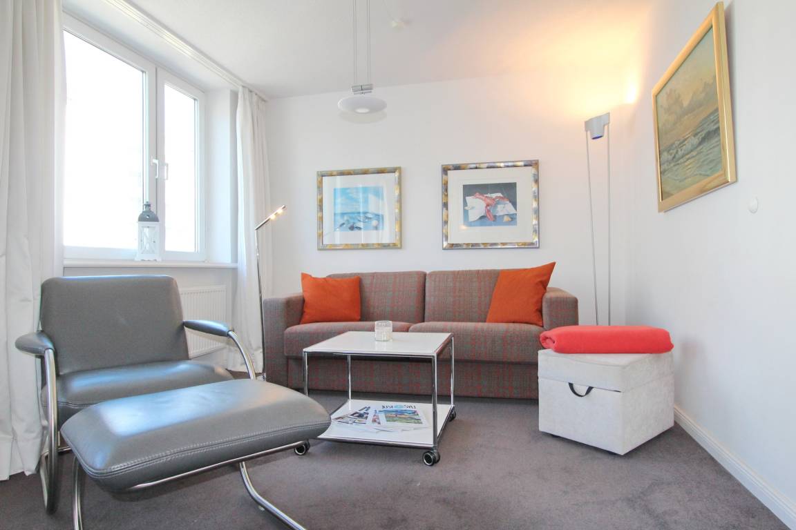 Schöne 2 Zimmer-Wohnung im Herzen von Westerland - sie befindet sich in der 5. Etage zur Westseite in einem mehrstöckigen Appartementhaus in unmittelbarer Nähe des Hauptstrandes und des Stadtzentrums. Der Wohnraum ist mit einer gemütlichen Couchgarnitur mit Schlaffunktion, 2 Swinger-Sesseln mit Hocker und einem Essplatz mit 4 Stühlen ausgestattet. Im Schlafzimmer befindet sich ein großes Doppelbett und ein begehbarer Kleiderschrank. Das angrenzende Duschbad verfügt über eine Dusche mit niedrigem Einstieg, WC und großem Waschtisch und einer Waschmaschine. In der separaten Küche finden Sie ein Ceran-Kochfeld mit 4 Platten, ein Backofen, ein Kühlschrank mit Gefrierfach und einen Geschirrspüler. Ein Hotspot im Haus ermöglicht Ihnen kabellosen und kostenfreien Zugang ins Internet (WEG-AD3 - Passwortfrei - ohne Gewähr). Nichtraucherwohnung. Wohnungsgröße ca. 40 m².
