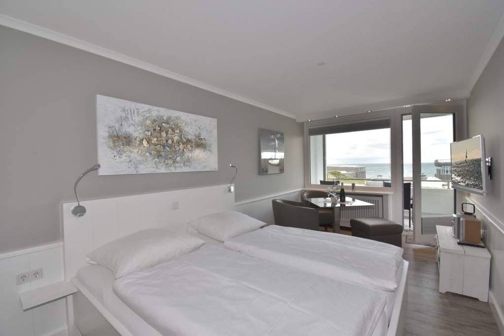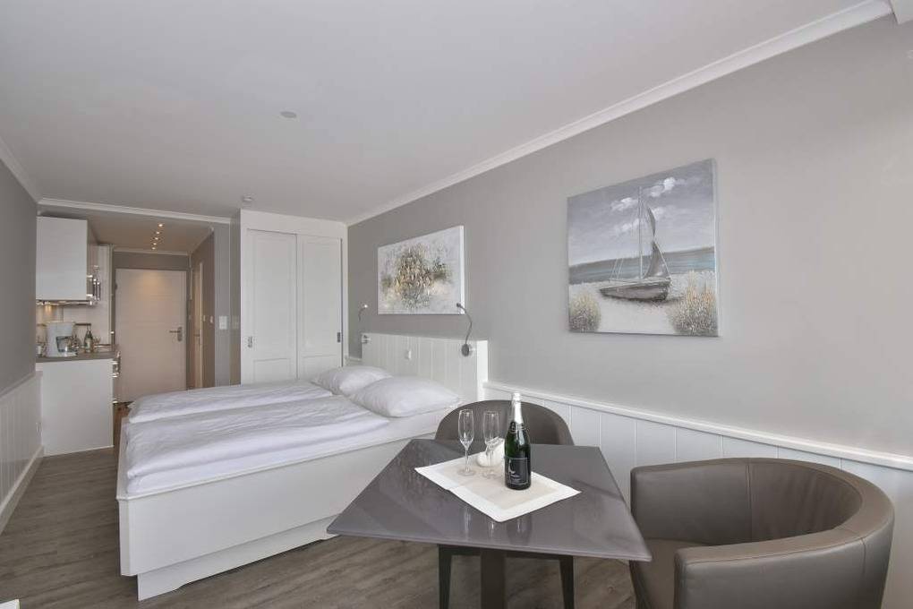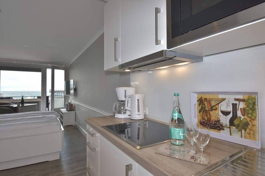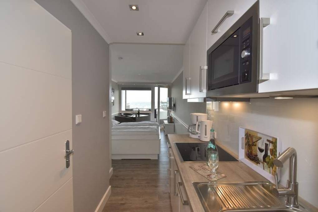 Individuell gestaltete 1-Zimmer-Nichtraucher-Ferienwohnung (ca. 25 qm) in der 4. Etage zur Seeseite mit Westloggia und herrlichem Meerblick, (Nachmittagssonne mit Balkonmöbeln und Auflagen) für max. 2 Personen. Vom Vorflur mit Garderobe und Küchenzeile gelangt man in das kombinierte Wohn-/Schlafzimmer (mit Austritt zum Balkon) und in das moderne Duschbad/WC.
