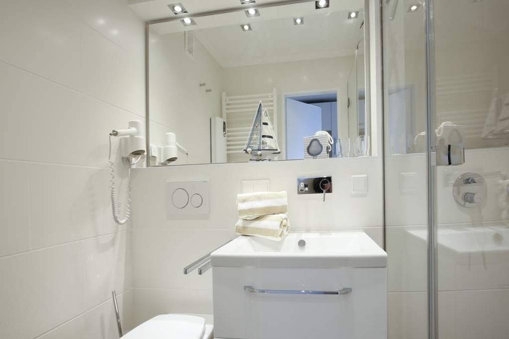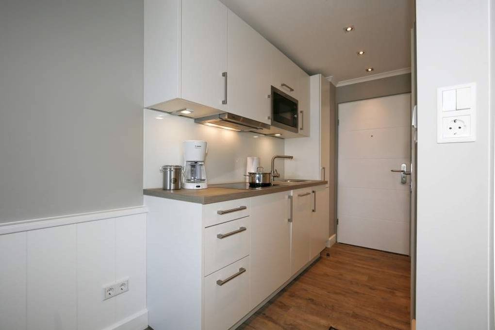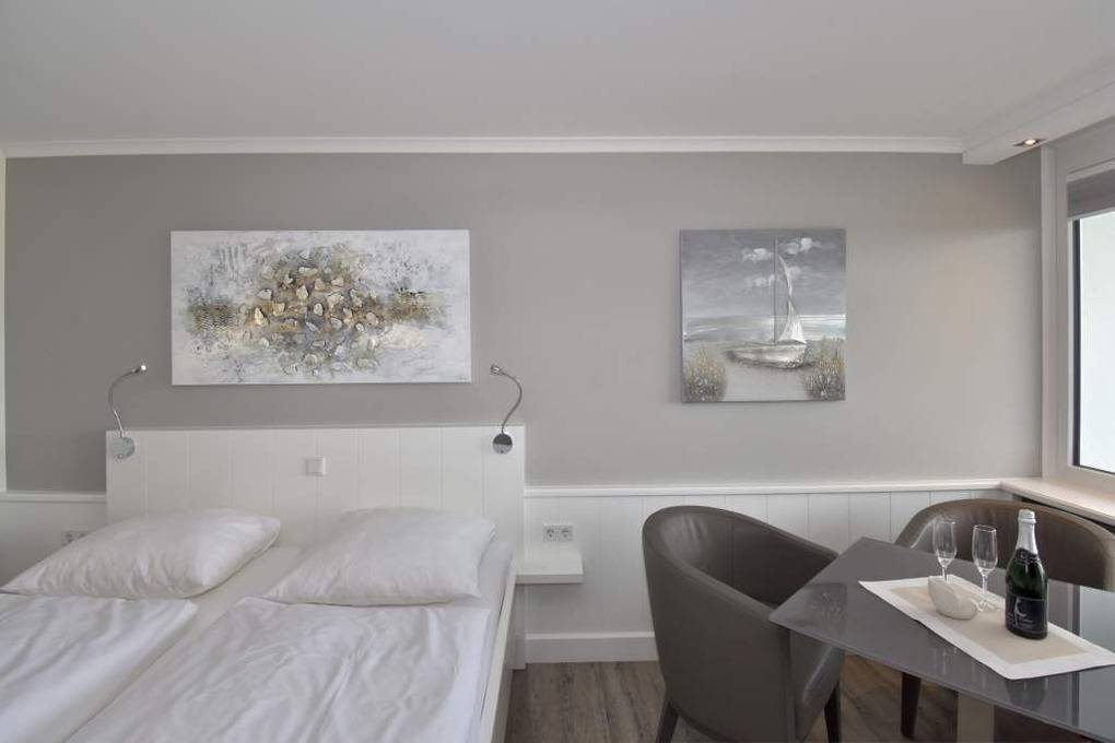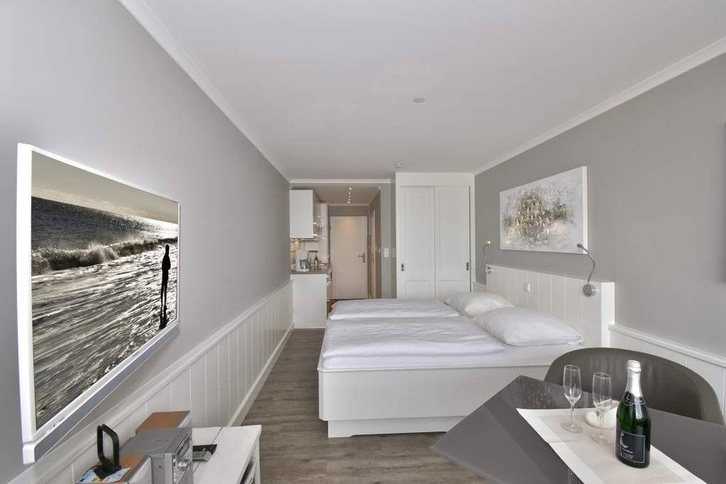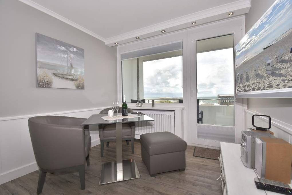 Individuell gestaltete 1-Zimmer-Nichtraucher-Ferienwohnung (ca. 25 qm) in der 4. Etage zur Seeseite mit Westloggia und herrlichem Meerblick, (Nachmittagssonne mit Balkonmöbeln und Auflagen) für max. 2 Personen. Vom Vorflur mit Garderobe und Küchenzeile gelangt man in das kombinierte Wohn-/Schlafzimmer (mit Austritt zum Balkon) und in das moderne Duschbad/WC.