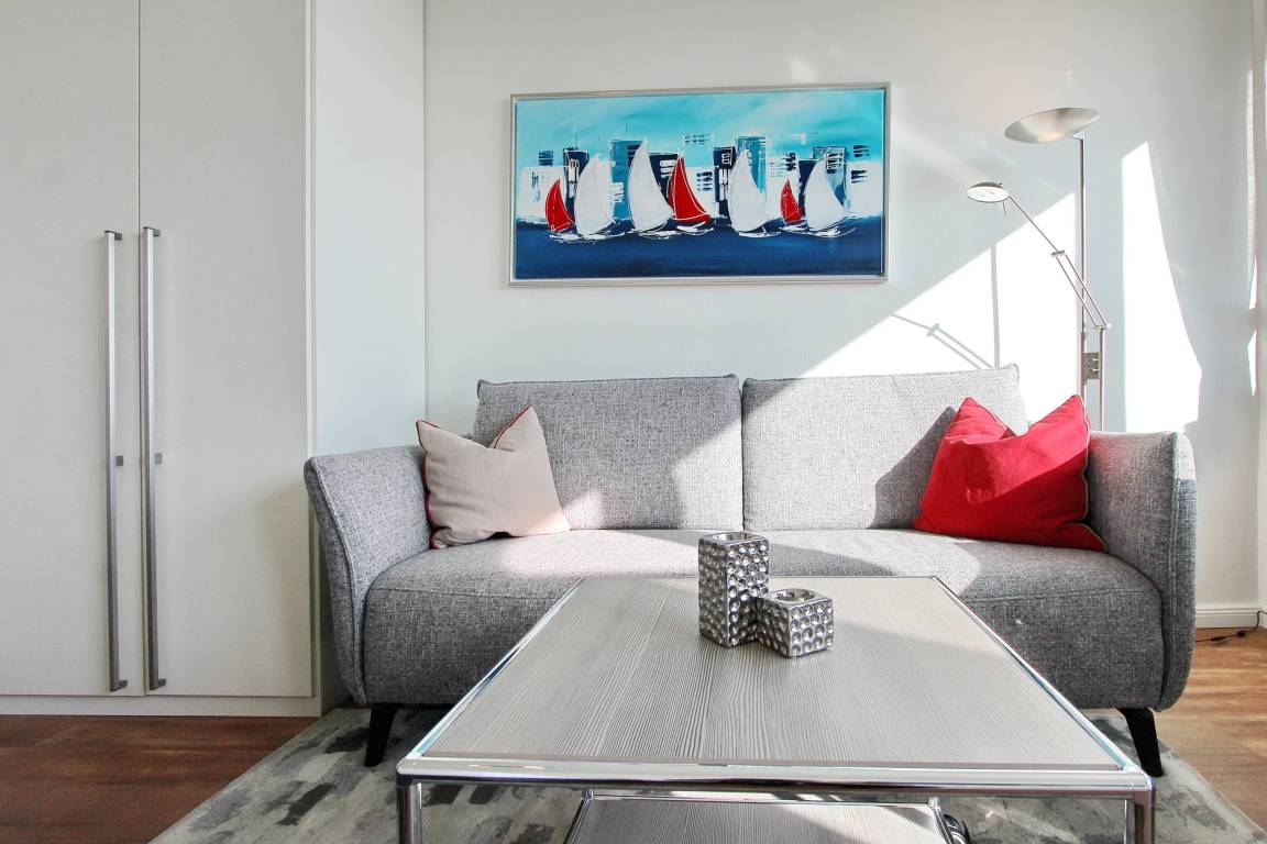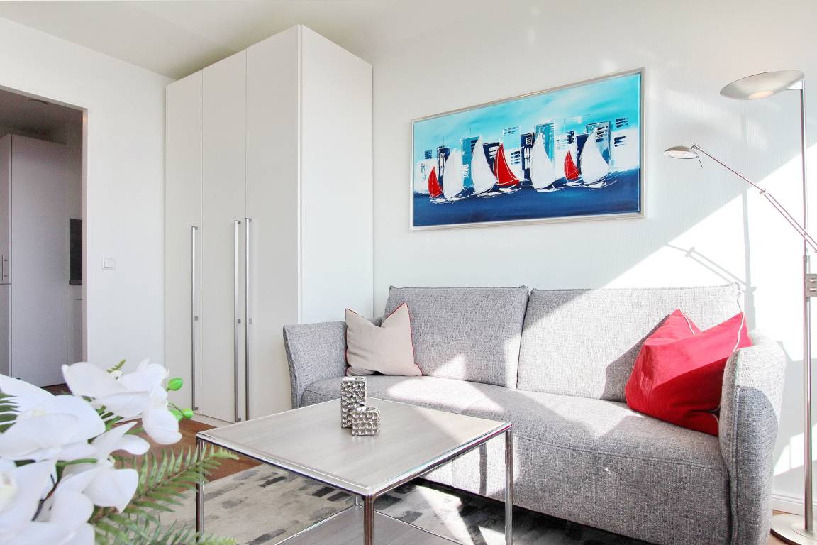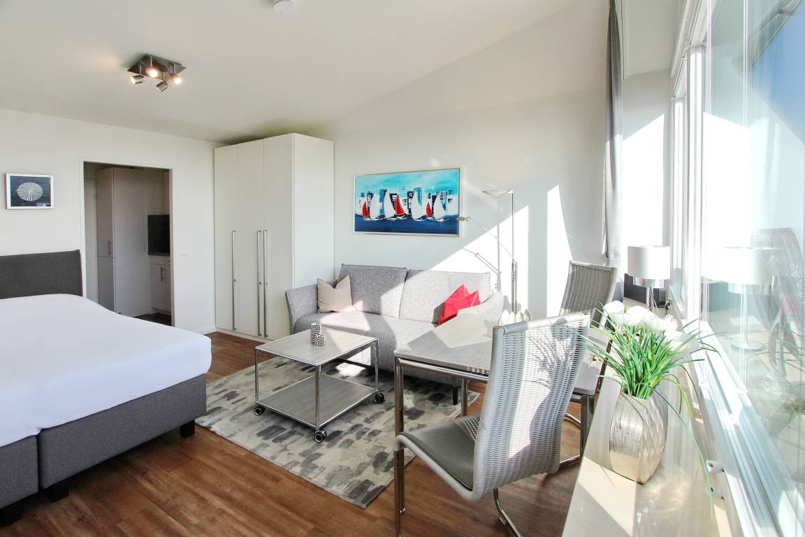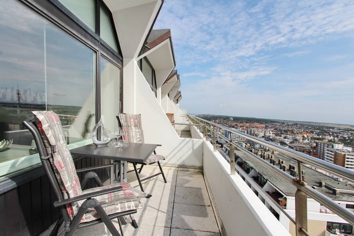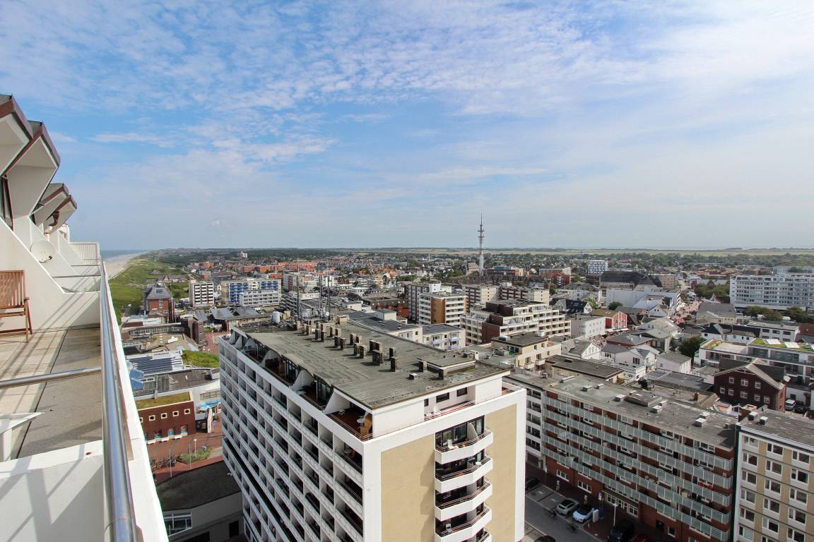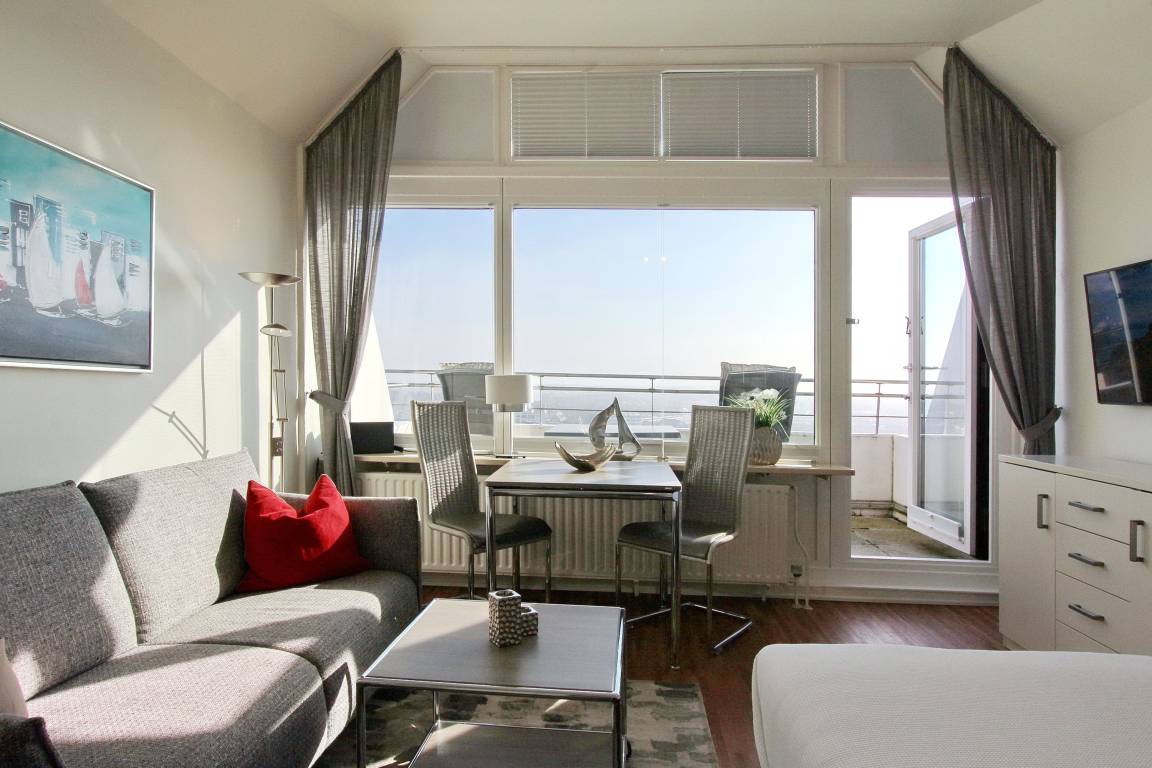 Penthousewohnung in der 14. Etage des Haus Metropol mit herrlichem Weitblick über die Insel und die Stadt. Der Wohn-/Schlafraum mit vorgelagertem Ostbalkon und Balkonmöbeln verfügt über ein komfortables Boxspringbett, eine bequeme 2 Sitzer Couch, einen Kleiderschrank mit viel Stauraum und eine Kommode. Der Essplatz mit 2 Stühlen steht direkt am Fenster und von dort aus können Sie den wunderbaren Sonnenaufgang genießen. Das helle Badezimmer hat eine Dusche. Im Flur gibt es eine Küchenzeile mit 2 Platten Ceranfeld, eine Mikrowellen-Backkombination, einen Geschirrspüler und eine zusätzliche Nespressomaschine. Stilvoll decken Sie den Tisch mit Geschirr von Thomas Trend. Zur technischen Ausstattung dieser Nichtraucherwohnung gehört: ein Radio mit CD Player und ein Flachbildfernseher. Der freie WLAN Hotspot (WEG Haus Metropol - Passwortfrei - ohne Gewähr) steht ihnen ebenfalls kostenfrei zur Verfügung. Das Penthouse ist nur über eine Treppe erreichbar, da der Aufzug in der 13. Etage endet. Wohnungsgröße: ca. 30 m².