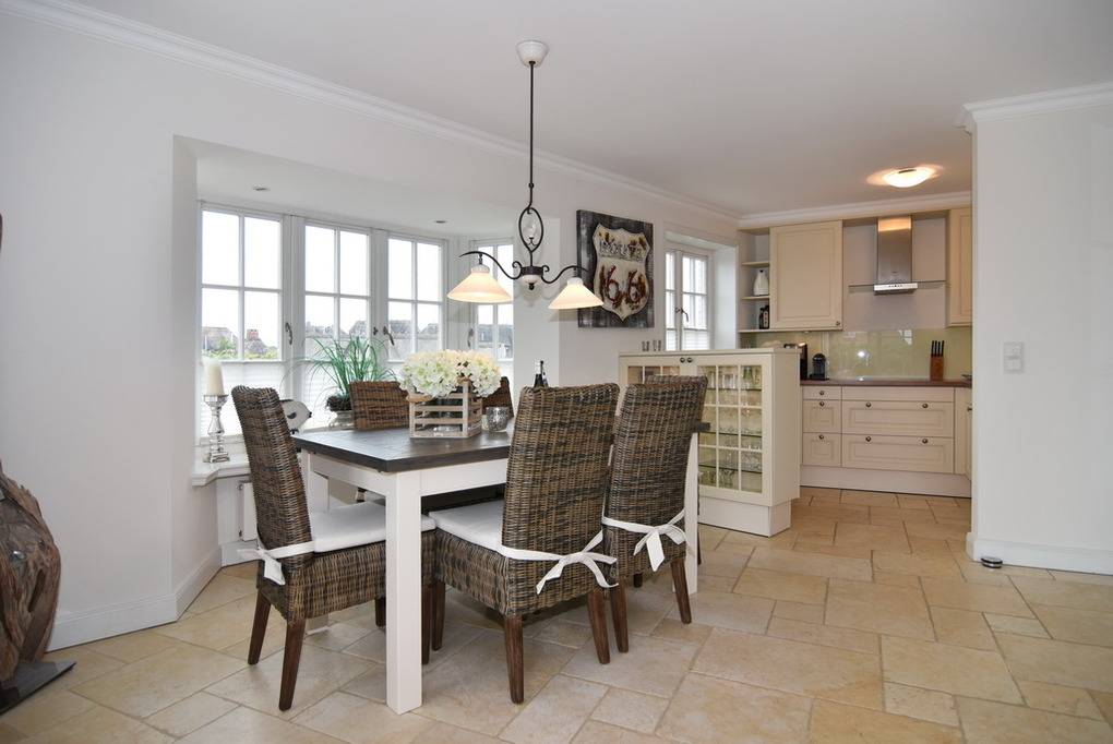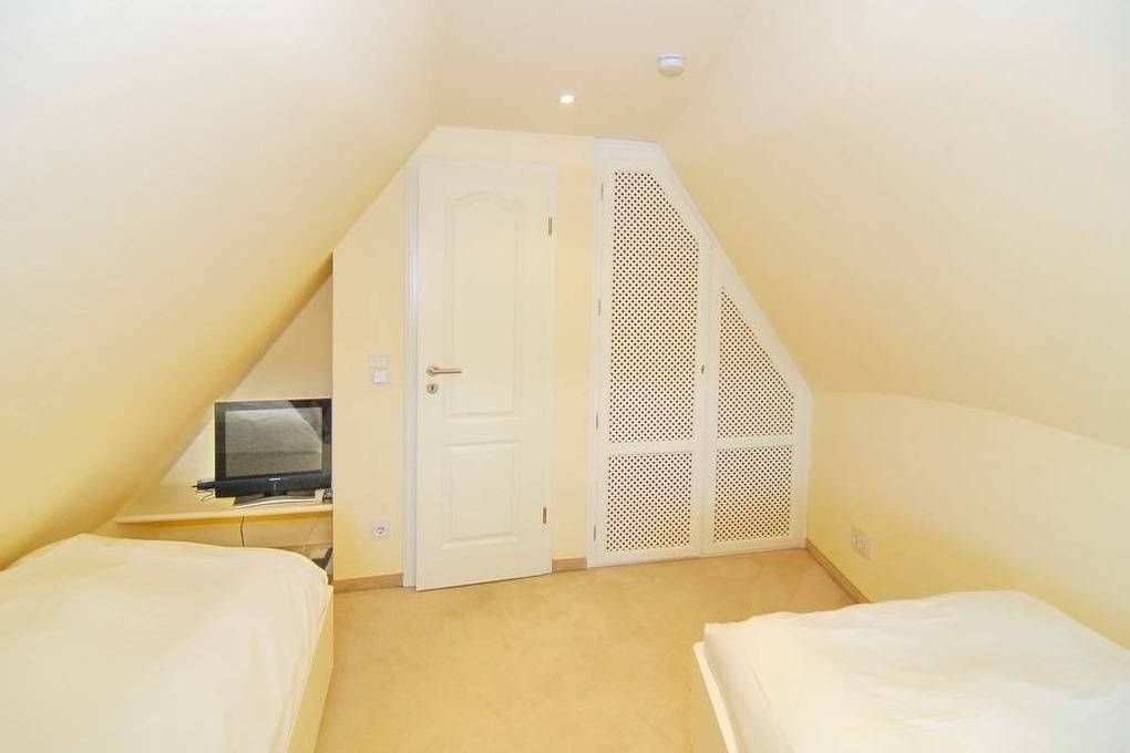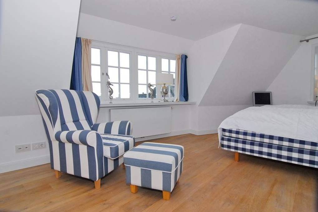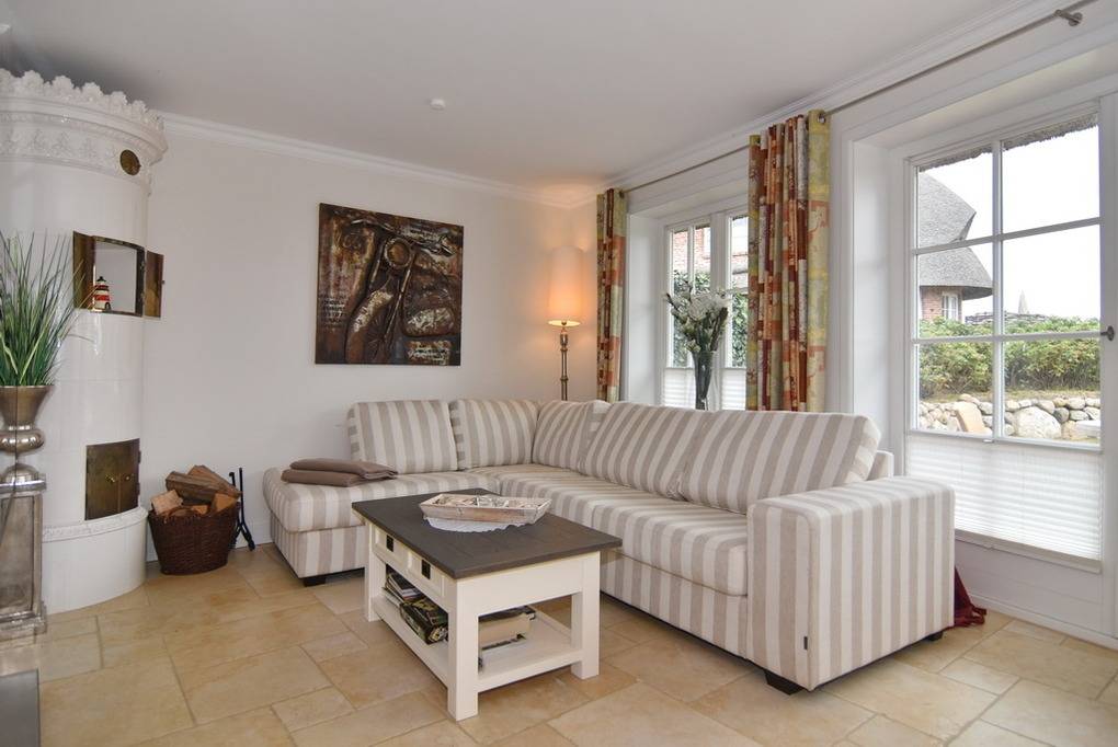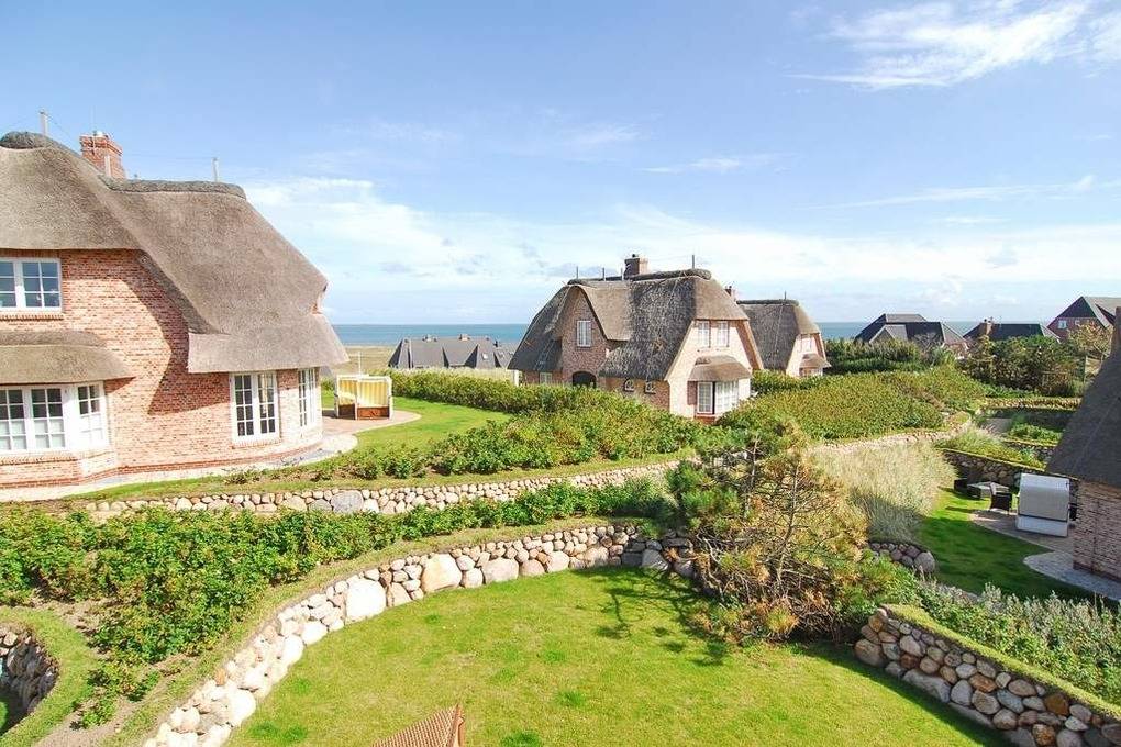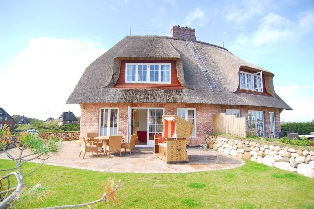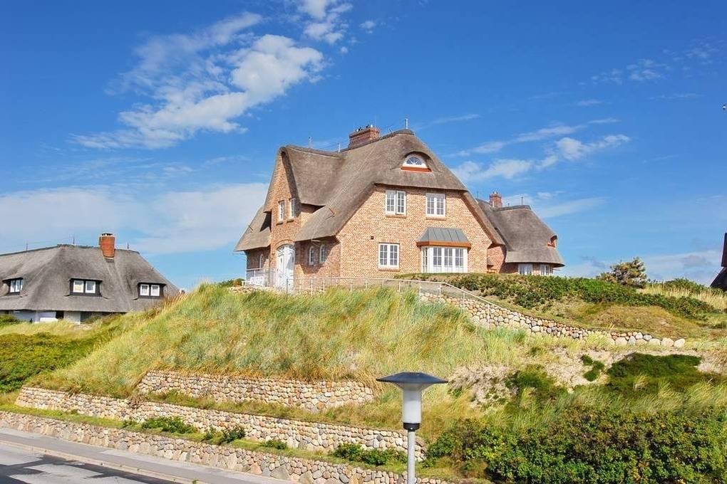 Schön gelegene Haushälfte unter Reet. Herrliche Lage auf dem Dünenkamm mit Wattblick. Ca. 52 Stufen bis zum Eingang. Ca. 155 m². EG: Wohnzimmer mit Kachelofen, Flachbild-TV, Radio, offene Küche mit Geschirrspüler, Mikrowelle und Induktionsherd, umlaufende Terrasse mit Strandkorb und Gartenmöbeln, Flur mit Garderobe, Gäste-WC OG: Schlafzimmer mit Hästens-Doppelbett (2x2m Matratze ), TV, Einbauschränke und Wattblick. Bad mit Wanne und Dusche, separates WC DG: 2 Einzelbetten (1 unter der Schräge), Flachbild-TV, begehbarer Kleiderschrank. UG: 1 Schlafzimmer mit Doppelbett und Schrank, Sauna (f. 3-4 Personen) mit Duschbad/WC. Hauswirtschaftsraum mit Waschmaschine und Trockner, Bügelbrett. Kinderhochstuhl und -reisebett im Haus. Pkw-Stellplatz vorhanden. Tierhaltung ist verboten. Bettwäsche und Handtücher sind zur Anreise aufgezogen.