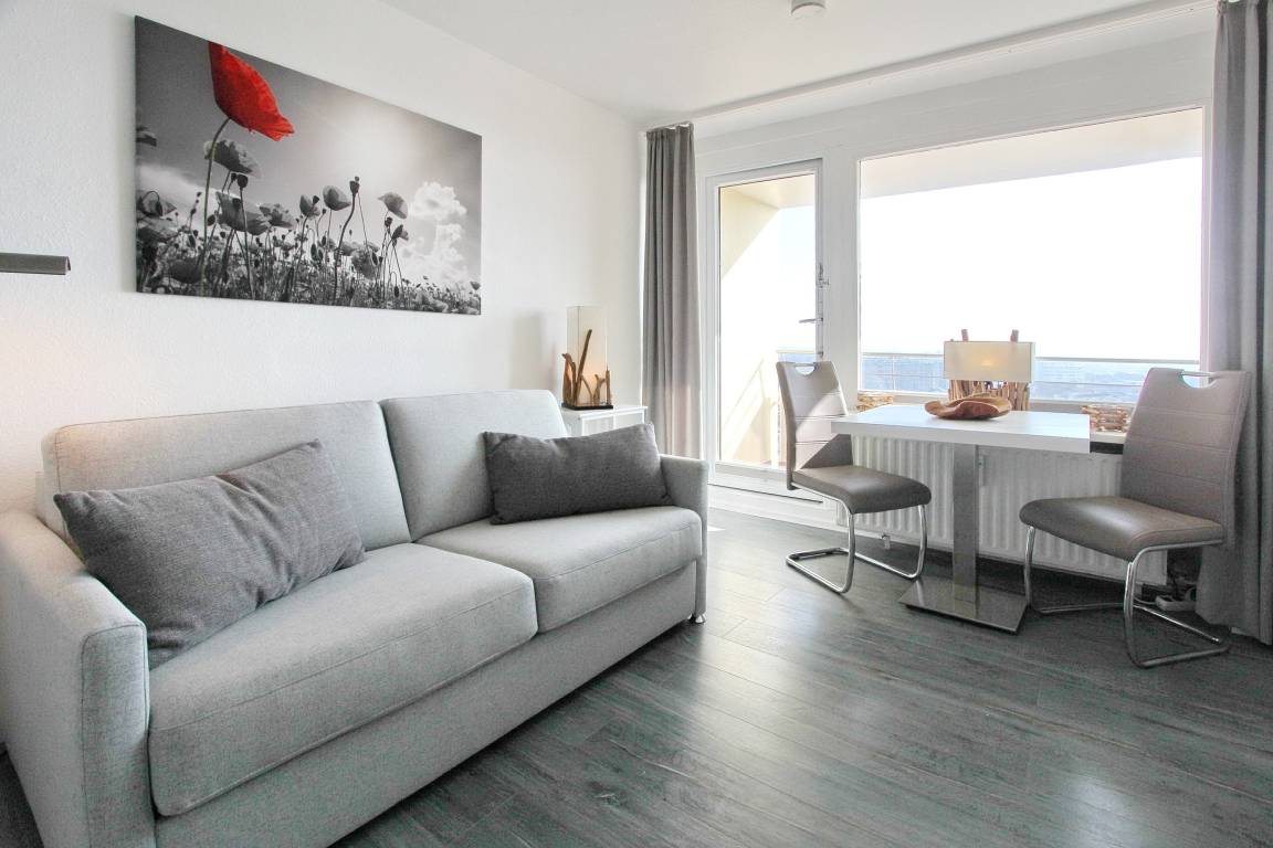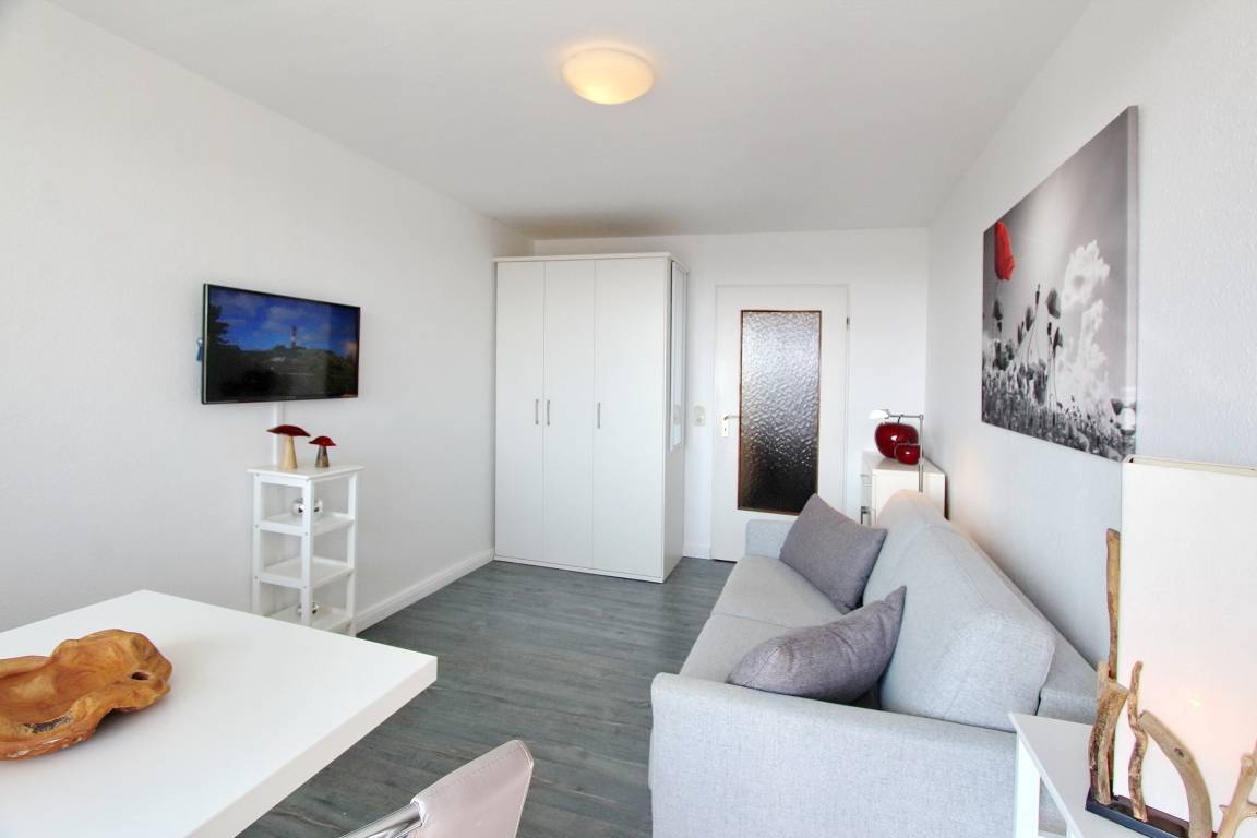 Kleine und gemütliche Einzimmerwohnung in der 9. Etage im Haus Metropol mit herrlichem Weitblick über die Insel und die Stadt. Bei klarem Wetter können Sie bis zum nordfriesischen Wattenmeer schauen. Der hell und freundlich eingerichtete Wohn-/Schlafraum mit bequemer Schlafcouch für 2 Personen hat einen Balkon zur Ostseite. Hier stehen 2 Stühle und ein Tisch, so dass Sie jeden Morgen draußen frühstücken und die Sonnenaufgänge über der Insel genießen können. Sollte das Wetter mal nicht so mitspielen, haben Sie drinnen am Fenster auch noch einen Essplatz mit 2 Stühlen. In der Wohnung liegt Designfussboden in Holzoptik, der dem Raum Wärme und Gemütlichkeit gibt. Das moderne Badezimmer verfügt über eine Dusche mit niedrigem Einstieg, einen Handtuchtrockner und Fön. In der Einbauküche mit 4-Platten-Cerankochfeld, Backofen und Geschirrspüler im Flur können sie sich selbst verpflegen. Zur technischen Ausstattung dieser Wohnung gehört: ein Smartfernseher und ein Radio mit CD Player. Das freie WLAN Netz (WEG Haus Metropol - Passwortfrei - ohne Gewähr) können Sie kostenfrei nutzen. Diese Nichtraucherwohnung hat eine Größe von ca. 23 m².