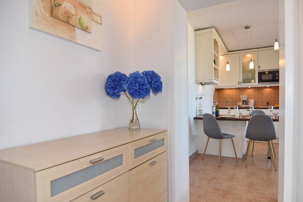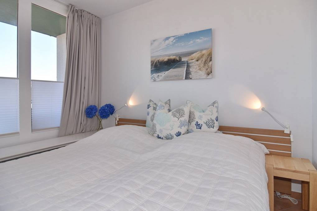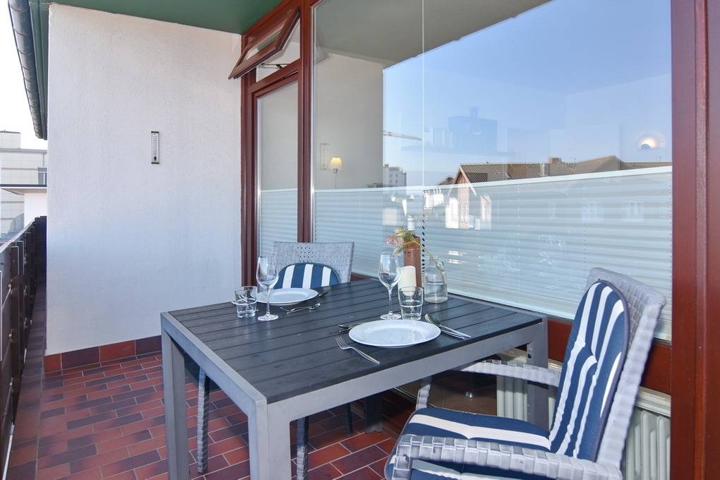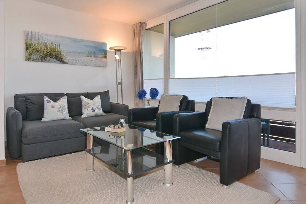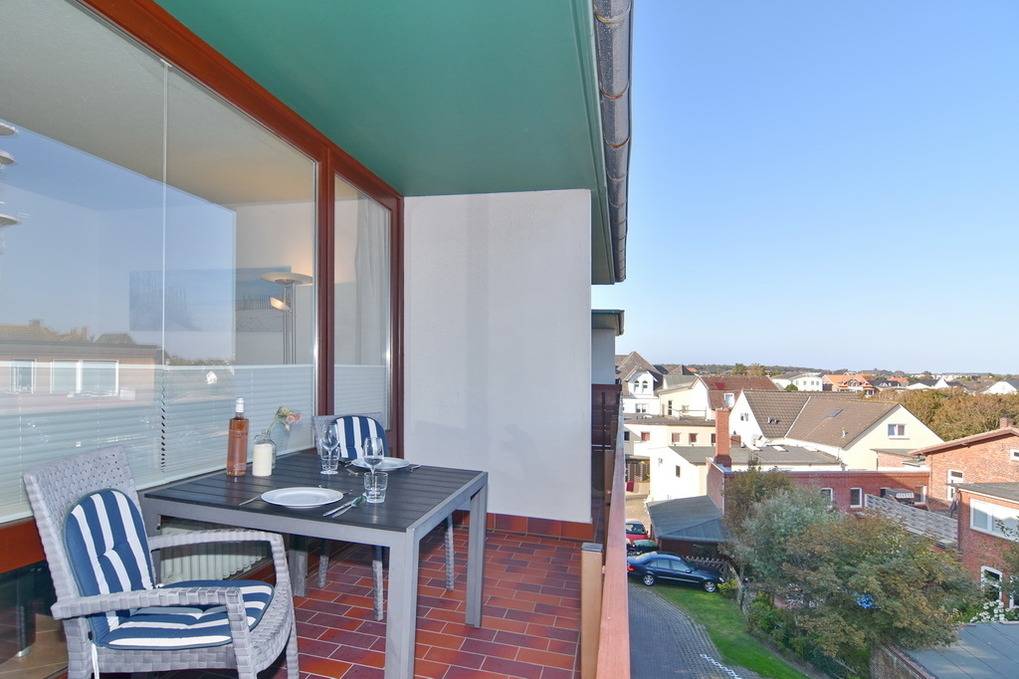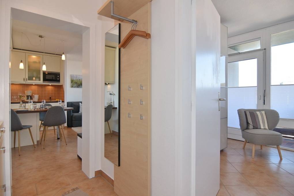 Moderne 2-Zimmer-Ferienwohnung in stadt- und strandnaher Lage im 3.OG. Ca. 54m². Helles Wohnzimmer mit offener Küche mit Esstresen, Geschirrspüler und Mikrowelle, hübsche Couchecke mit Schlaffunktion und 2 Sessel. Flachbild-TV, Blueray-Player und Radio. W-LAN ( ohne Gewähr ). Schlafzimmer mit Doppelbett, Kleiderschrank und TV. Badezimmer mit Dusche. Kleiner Dielenbereich mit Garderobe. Großer, sonniger Ostbalkon. 1 Pkw-Stellplatz in der Tiefgarage - hier dürfen keine Fahrräder abgestellt werden. Es gibt eine Fahrradabstellmöglichkeit draussen am Haus (nicht überdacht). Die Einfahrtshöhe zur Garage beträgt 1,77m. Benutzung der Garage auf eigene Gefahr. Die komplette Wohnung ist gefliest. Bettwäsche und Handtücher sind zur Anreise aufgezogen. Nichtraucherwohnung, Tierhaltung verboten! Auf dem nördlich angrenzenden Nachbargrundstück entsteht ab Mai 2024 ein Neubauvorhaben. Hier kann es zu Lärmbelästigung kommen.