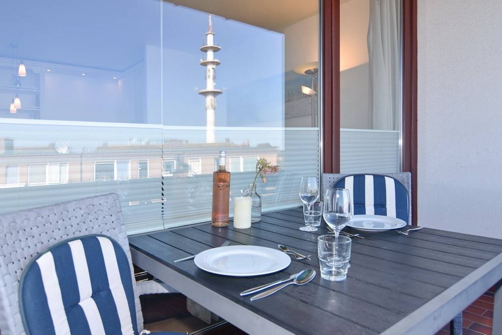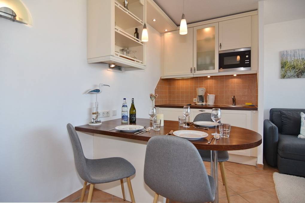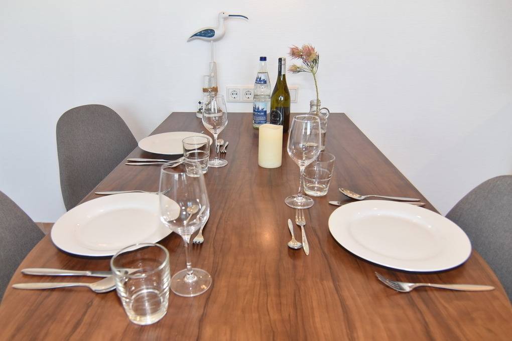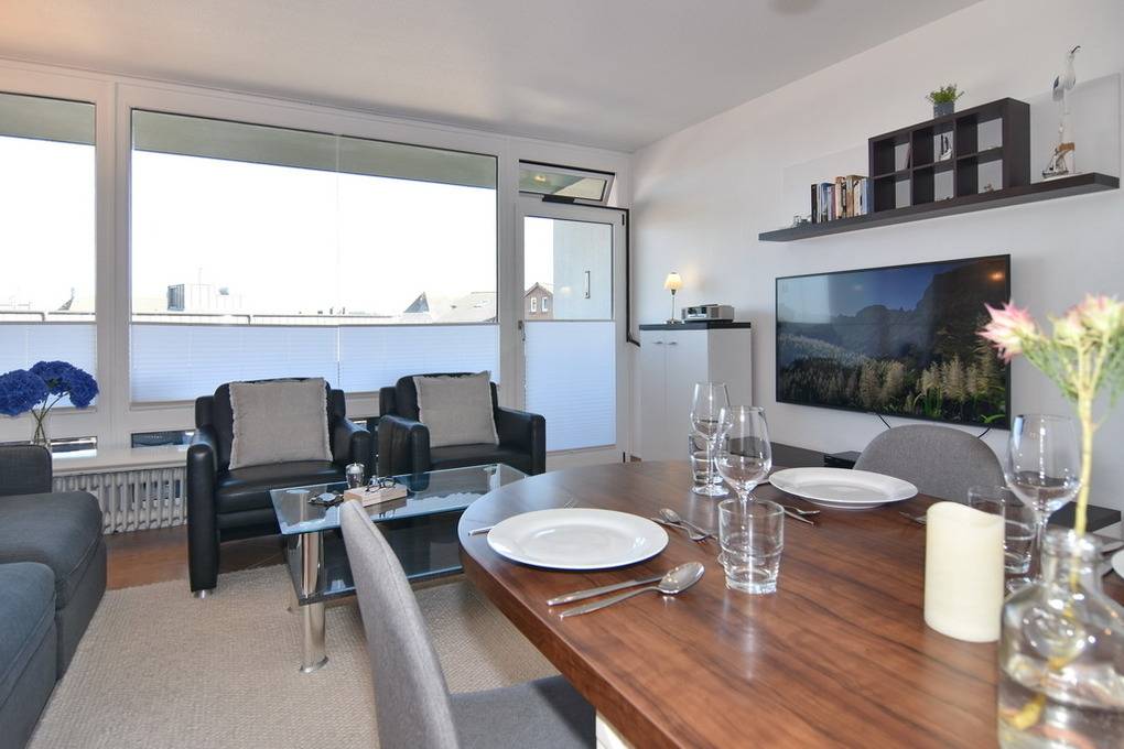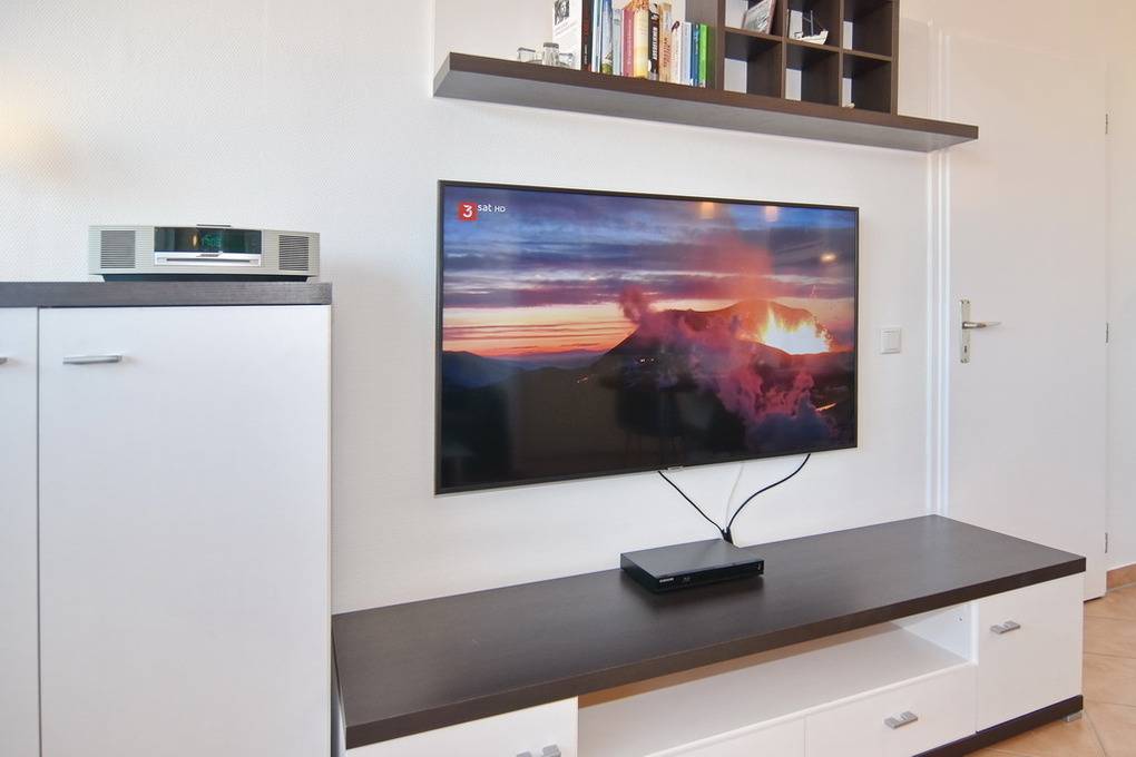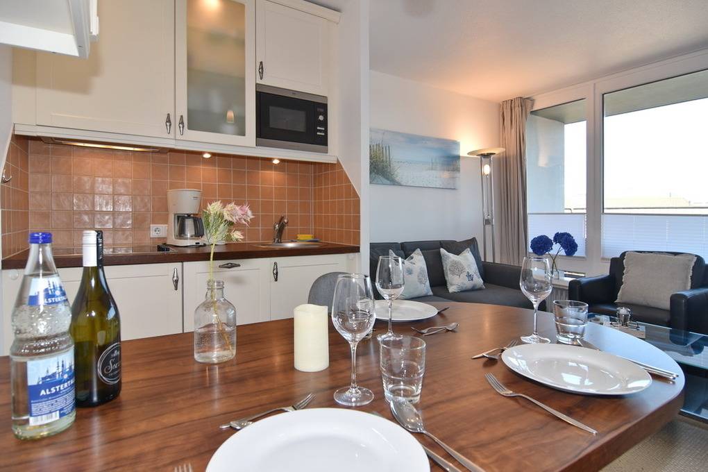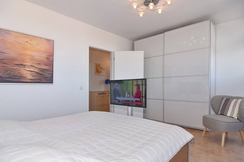 Moderne 2-Zimmer-Ferienwohnung in stadt- und strandnaher Lage im 3.OG. Ca. 54m². Helles Wohnzimmer mit offener Küche mit Esstresen, Geschirrspüler und Mikrowelle, hübsche Couchecke mit Schlaffunktion und 2 Sessel. Flachbild-TV, Blueray-Player und Radio. W-LAN ( ohne Gewähr ). Schlafzimmer mit Doppelbett, Kleiderschrank und TV. Badezimmer mit Dusche. Kleiner Dielenbereich mit Garderobe. Großer, sonniger Ostbalkon. 1 Pkw-Stellplatz in der Tiefgarage - hier dürfen keine Fahrräder abgestellt werden. Es gibt eine Fahrradabstellmöglichkeit draussen am Haus (nicht überdacht). Die Einfahrtshöhe zur Garage beträgt 1,77m. Benutzung der Garage auf eigene Gefahr. Die komplette Wohnung ist gefliest. Bettwäsche und Handtücher sind zur Anreise aufgezogen. Nichtraucherwohnung, Tierhaltung verboten! Auf dem nördlich angrenzenden Nachbargrundstück entsteht ab Mai 2024 ein Neubauvorhaben. Hier kann es zu Lärmbelästigung kommen.