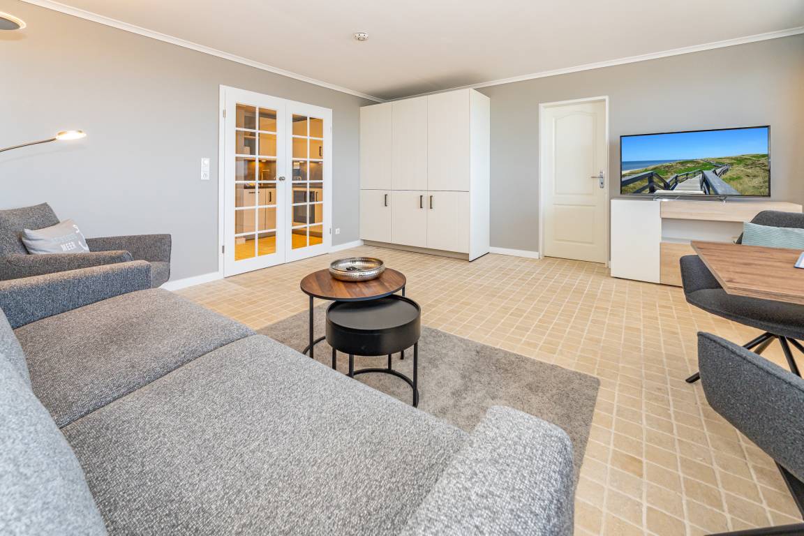 Das Wohnzimmer mit Austritt zur Loggia hat eine 2-Sitzer-Couch mit Schlaffunktion (1,60 x 2,00 m), einen Sessel, einen Essplatz, Kabel-Flachbild-TV, CD-Player, Radio.