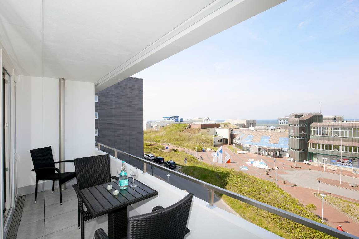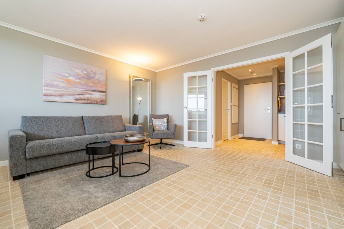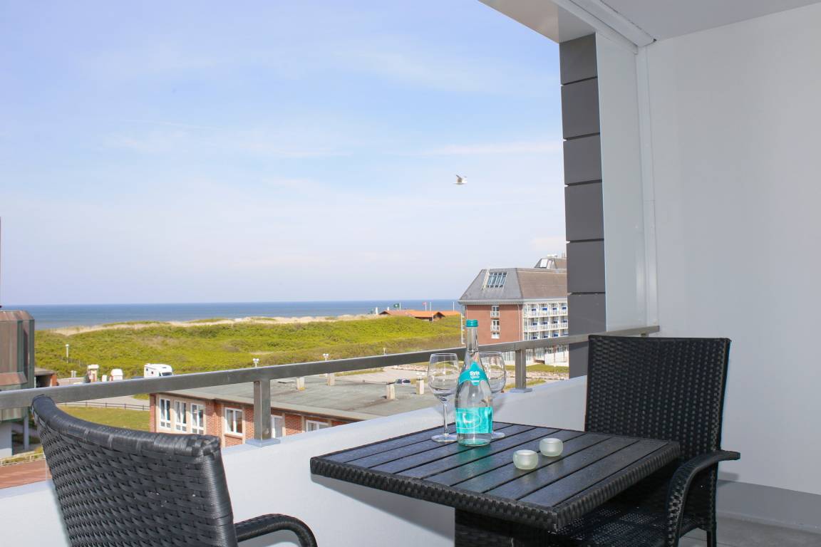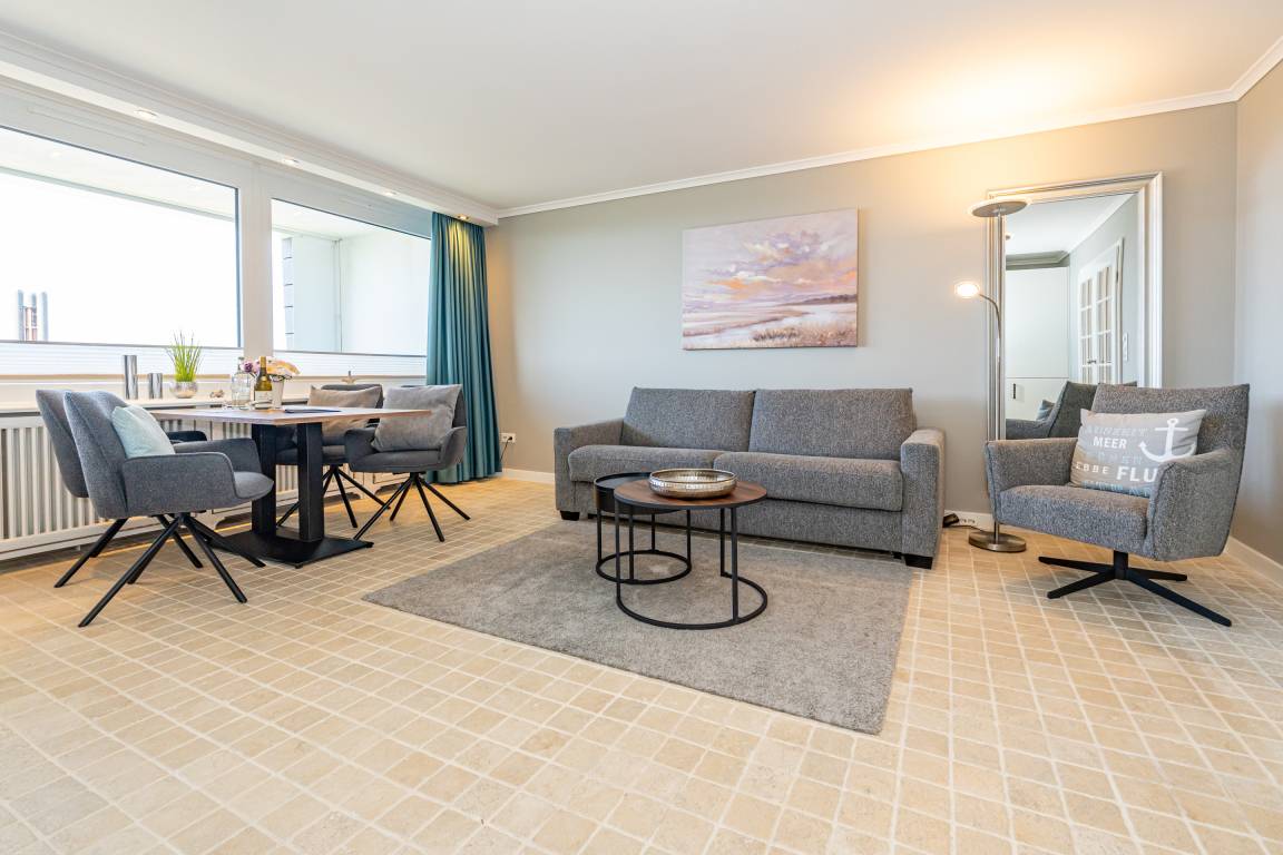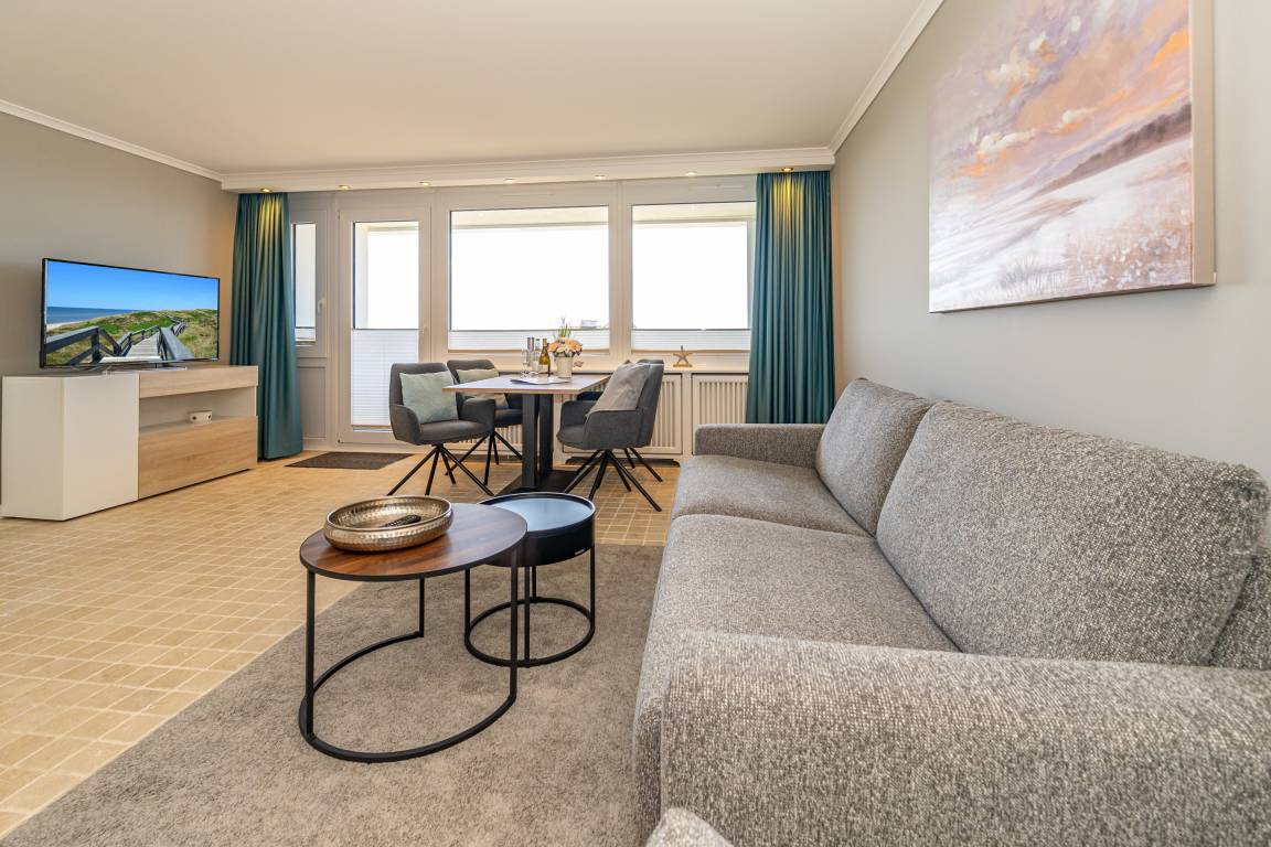 2025 renovierte, stilvolle 2-Zimmer-Nichtraucher-Ferienwohnung mit schönem Meerblick (ca. 51 qm) in der 4. Etage zur Seeseite mit 2 Westloggien (Nachmittagssonne, mit Balkonmöbeln und Auflagen) für max. 4 Personen.