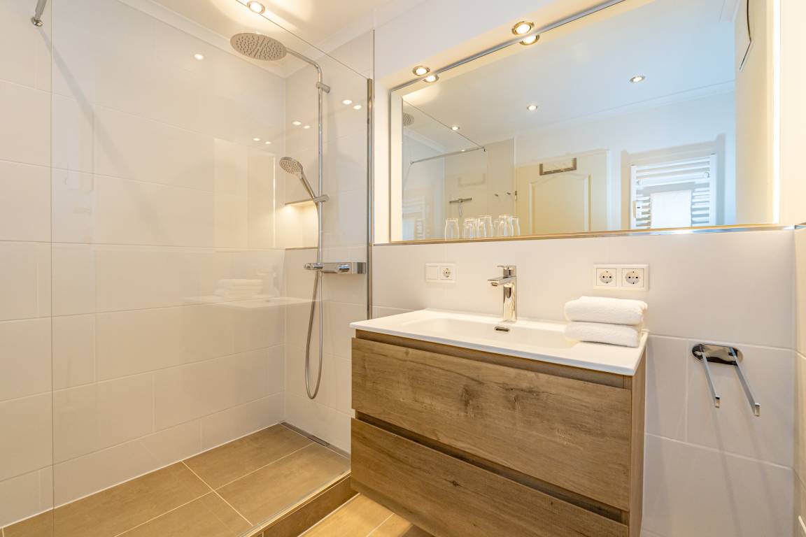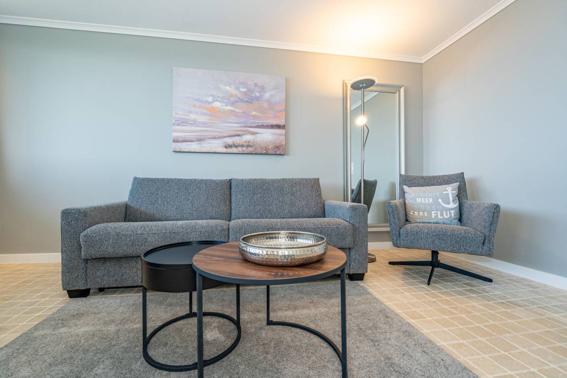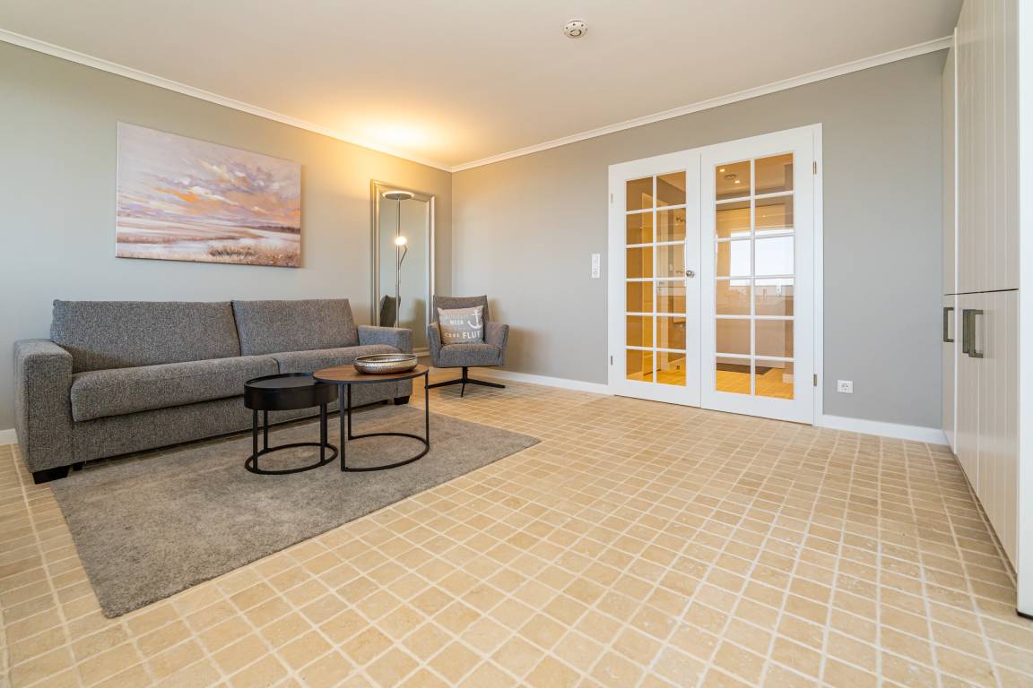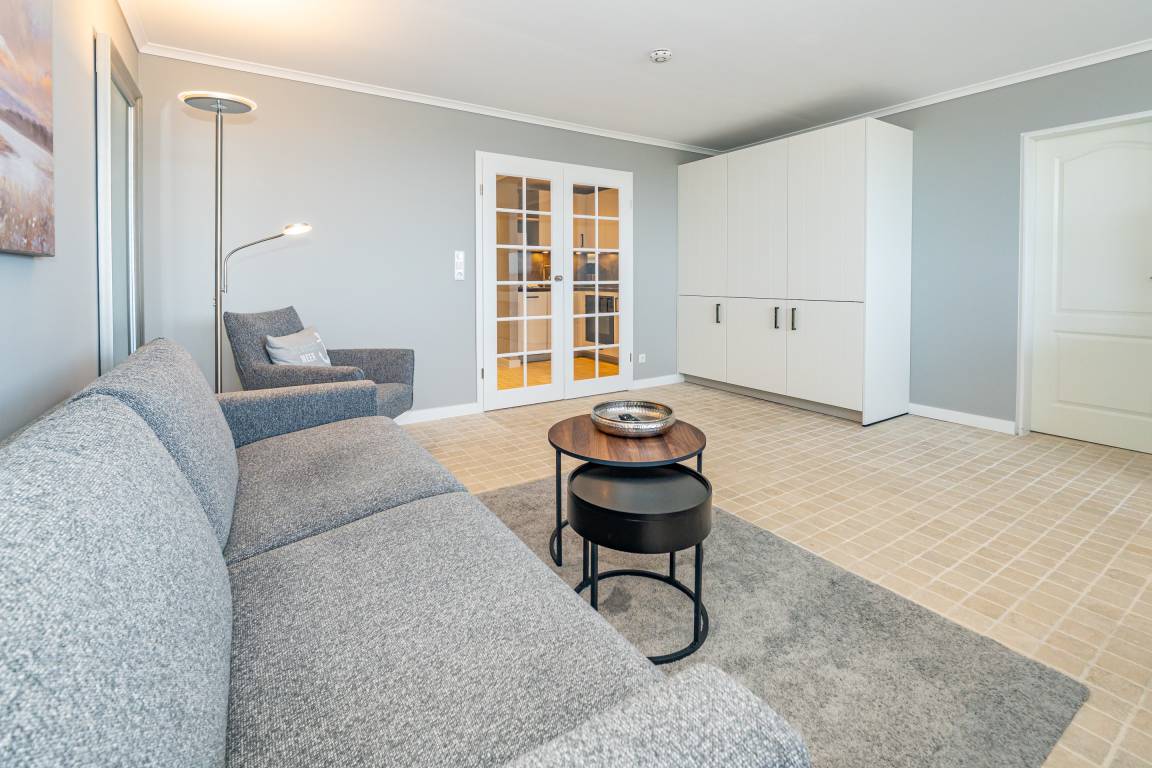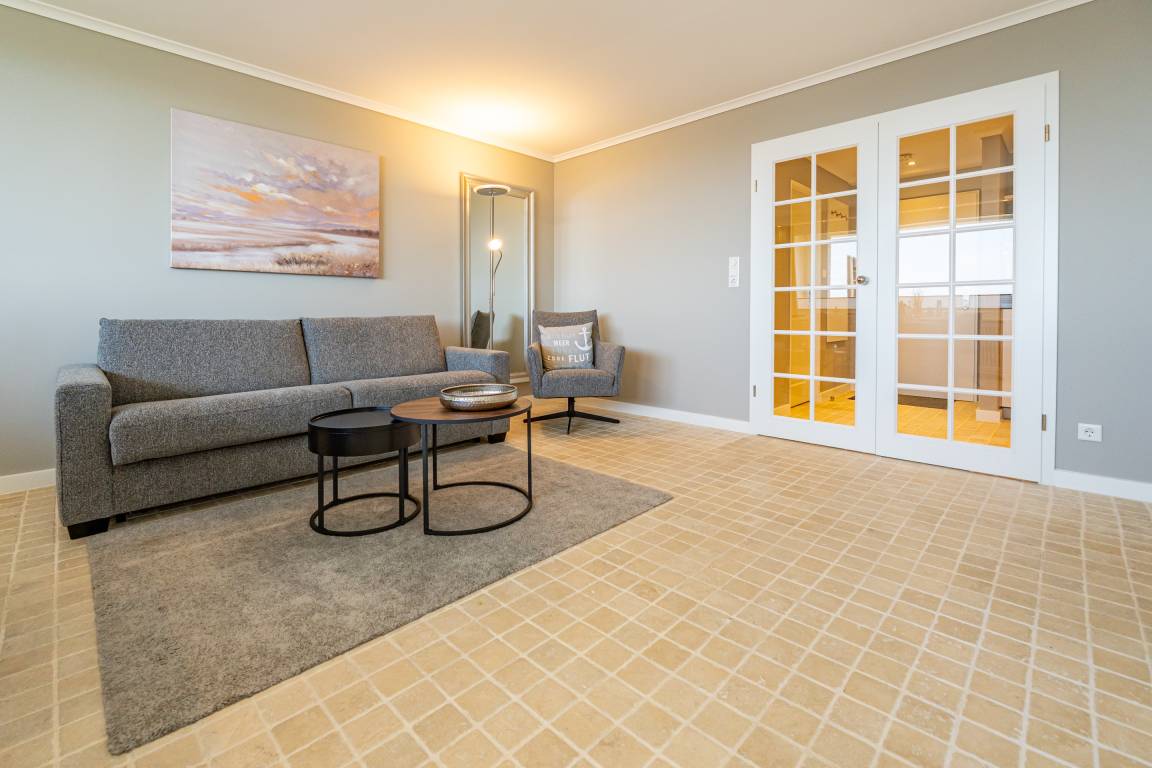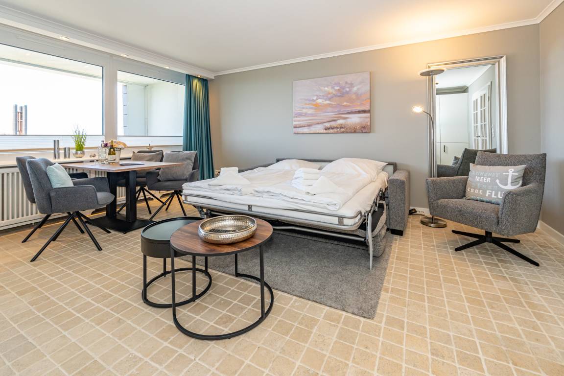 2025 renovierte, stilvolle 2-Zimmer-Nichtraucher-Ferienwohnung mit schönem Meerblick (ca. 51 qm) in der 4. Etage zur Seeseite mit 2 Westloggien (Nachmittagssonne, mit Balkonmöbeln und Auflagen) für max. 4 Personen.