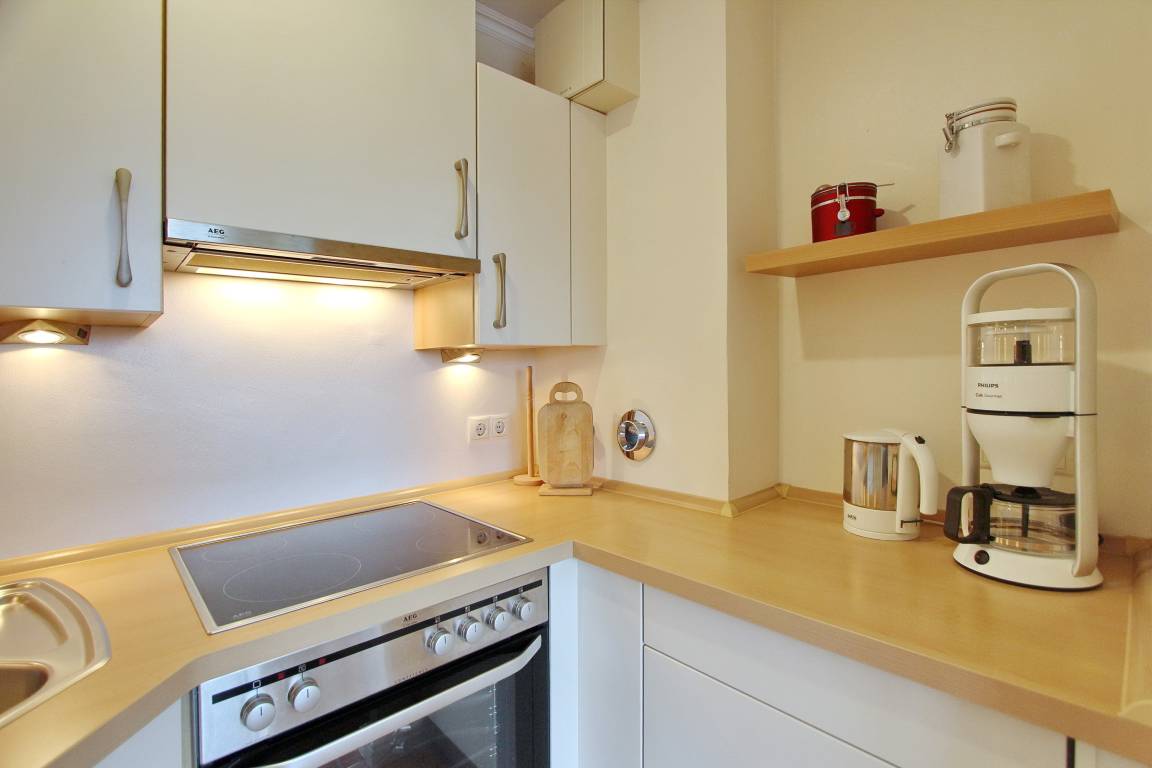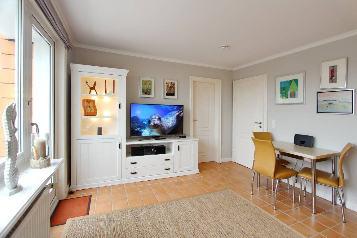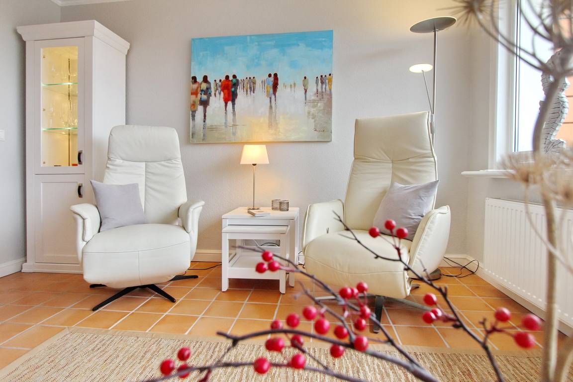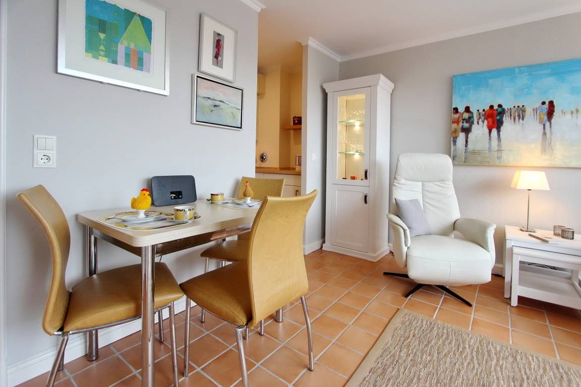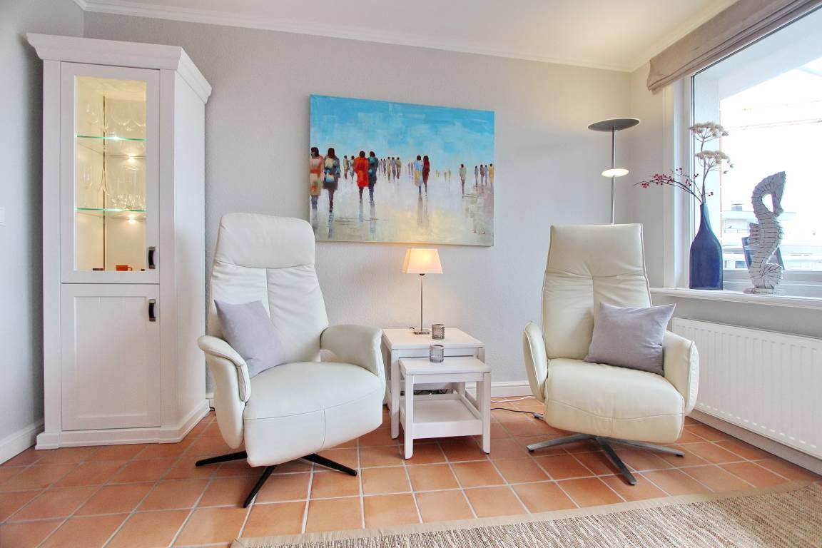 Mit ca. 40 m² bietet die Nichtraucherwohnung alles, was Sie für einen komfortablen Aufenthalt benötigen. Das helle Wohnzimmer lädt zum Entspannen ein, ausgestattet mit besonders gemütlichen elektrischen Sesseln, in denen Sie nach einem erlebnisreichen Tag am Meer wunderbar relaxen können. Der Essplatz mit zwei Stühlen ist ideal für gemeinsame Mahlzeiten oder einen kleinen Kaffee zwischendurch.