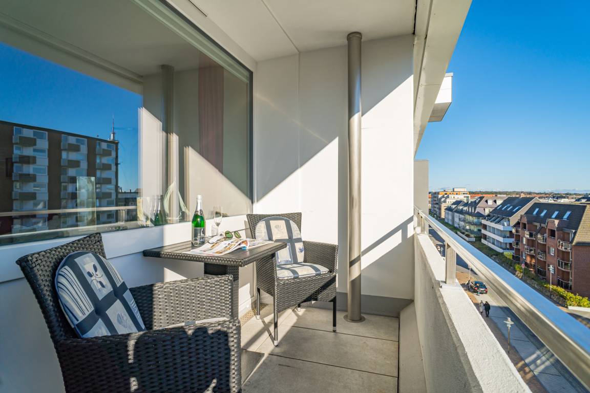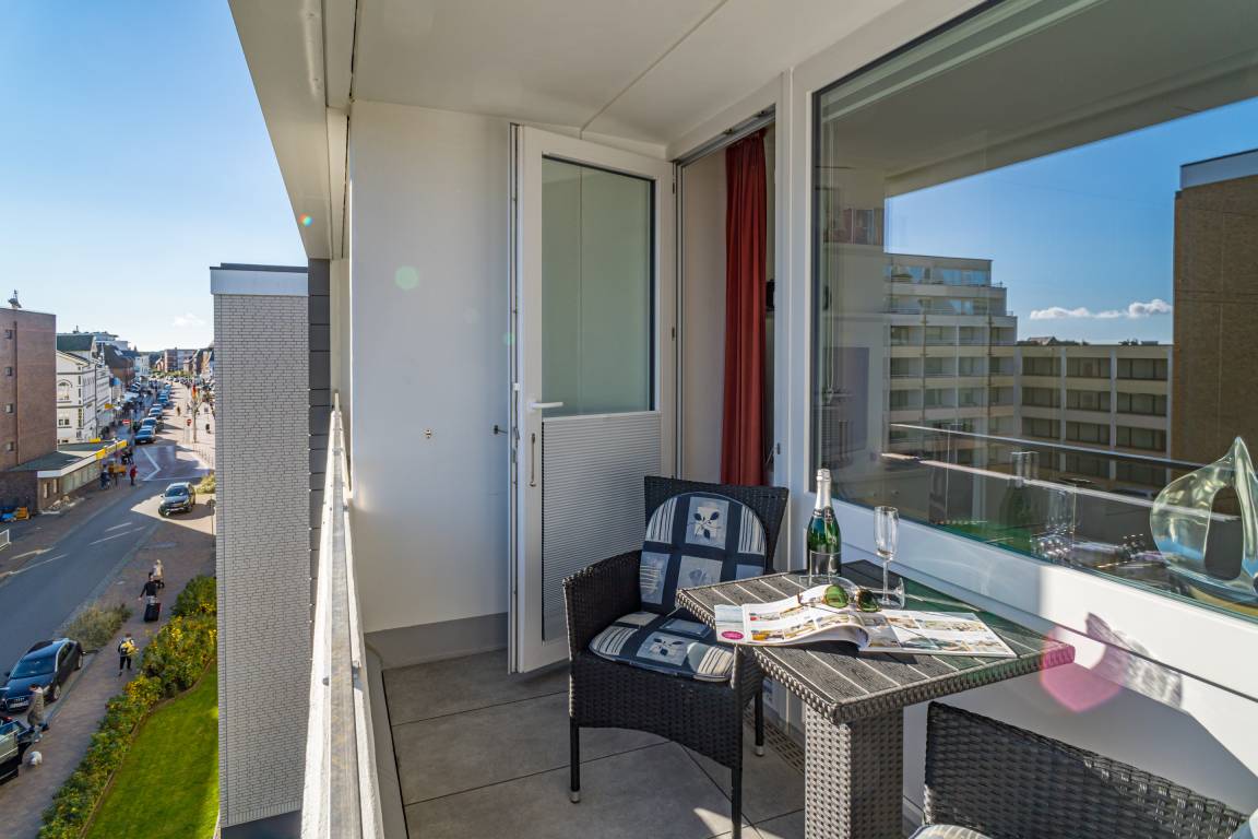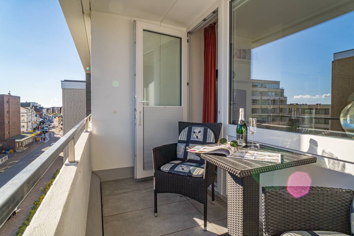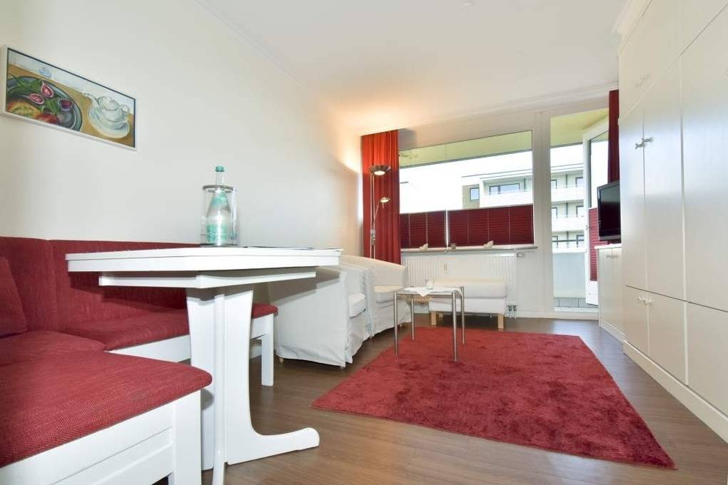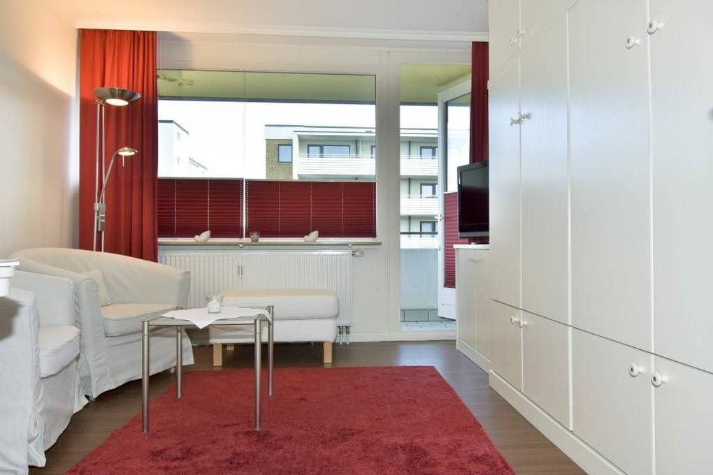 Komfortabel eingerichtete 1-Zimmer-Nichtraucher-Ferienwohnung ca. 23 qm in der 4. Etage zur Landseite mit Ostloggia (Morgensonne, mit Balkonmöbeln und Auflagen) für max. 2 Personen.