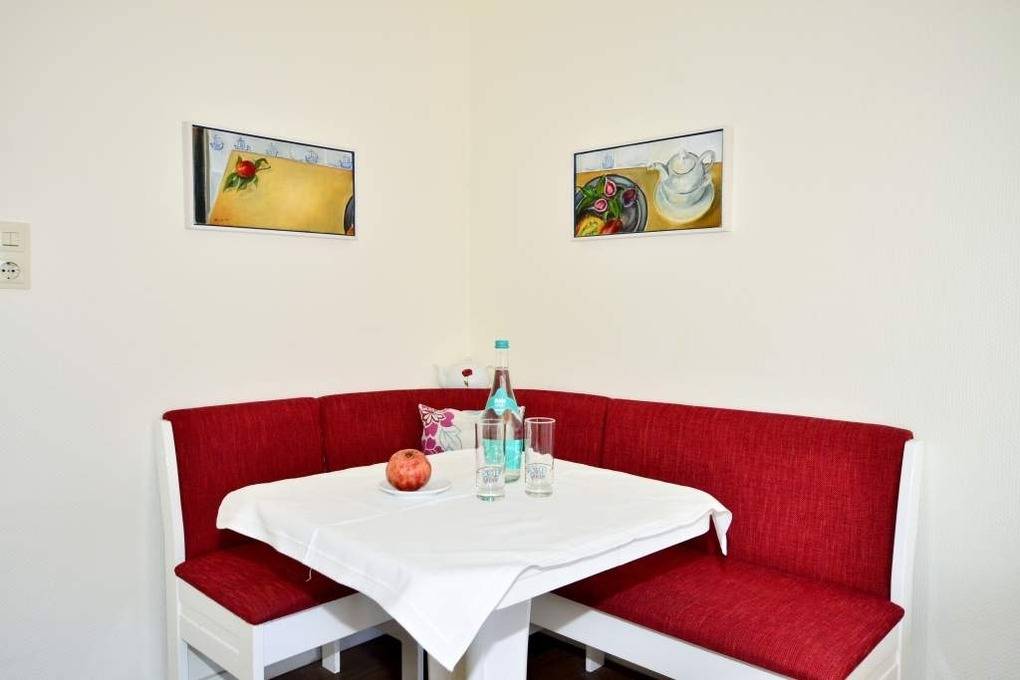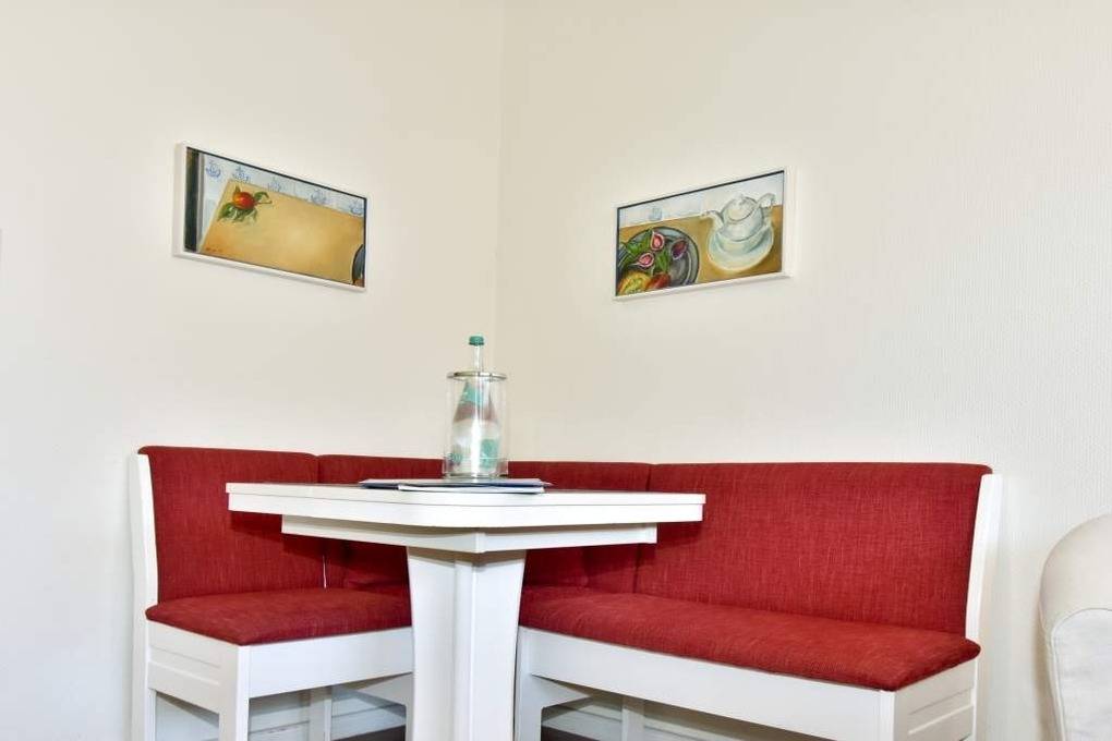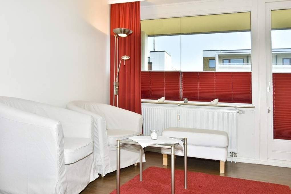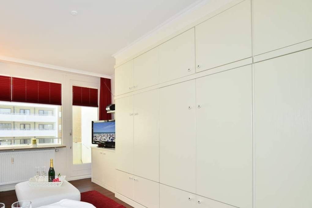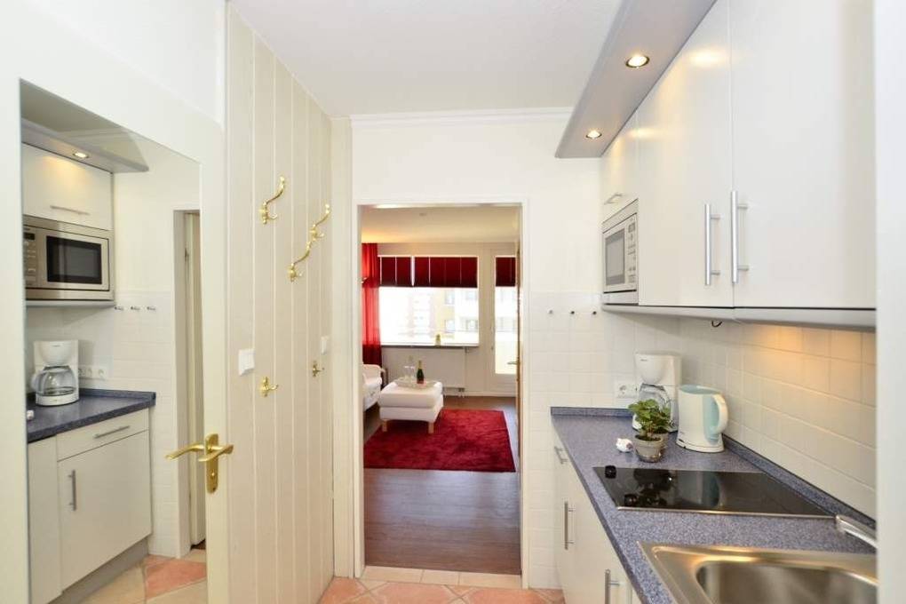 Komfortabel eingerichtete 1-Zimmer-Nichtraucher-Ferienwohnung ca. 23 qm in der 4. Etage zur Landseite mit Ostloggia (Morgensonne, mit Balkonmöbeln und Auflagen) für max. 2 Personen.