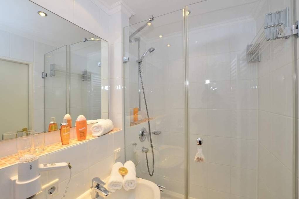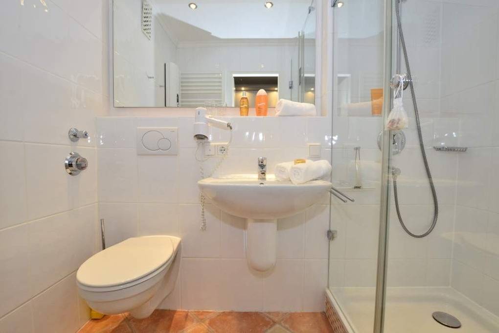 Im Bad befinden sich eine Dusche, ein WC, ein Waschtisch, ein Handtuchtrockner und ein Fön.