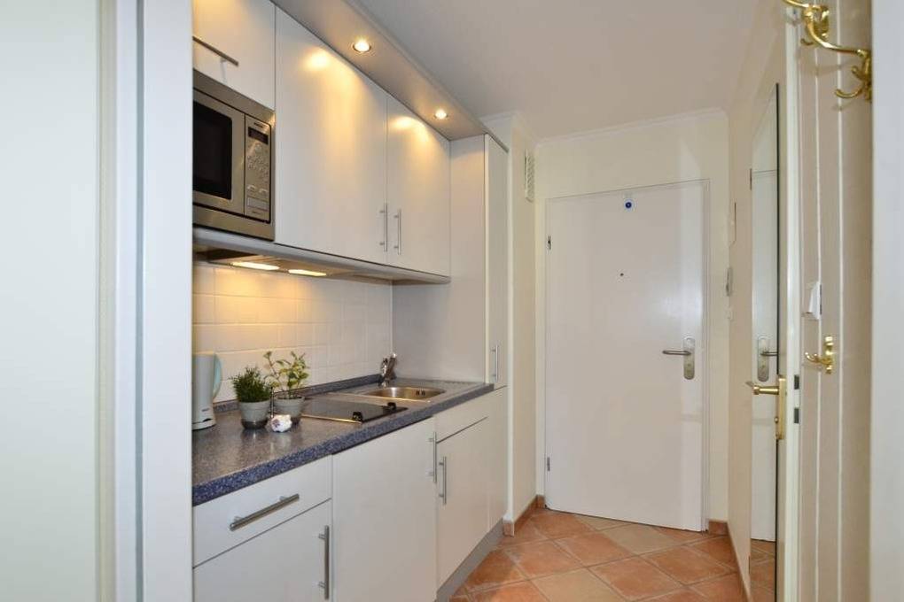 Die Küchenzeile hat ein Cerankochfeld, eine Mikrowelle mit Grillfunktion und einen Kühlschrank mit 3*-Gefrierfach. Kaffeemaschine, Wasserkocher und Toaster gehören zur Grundausstattung.