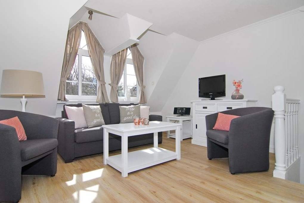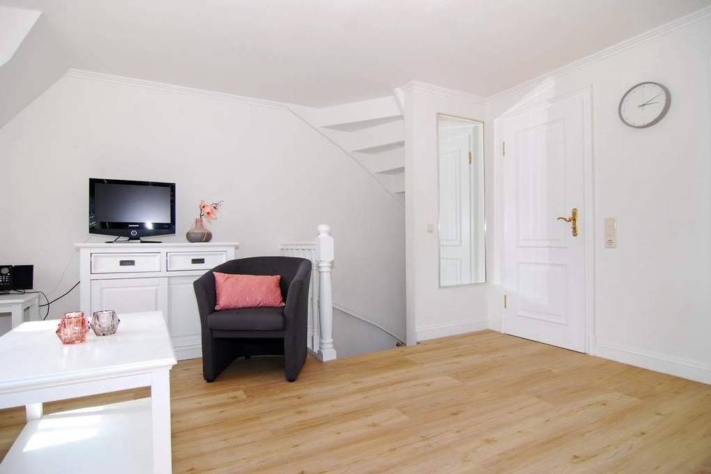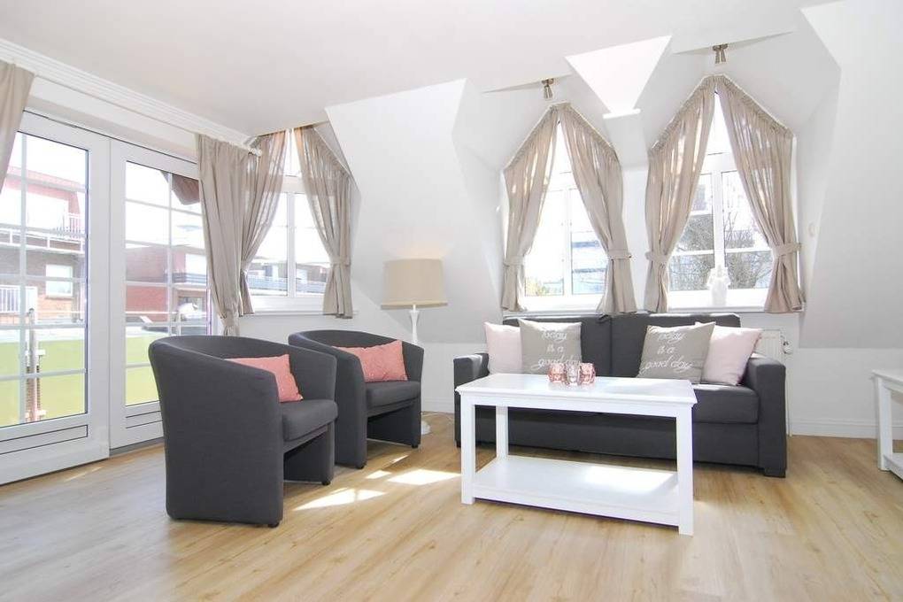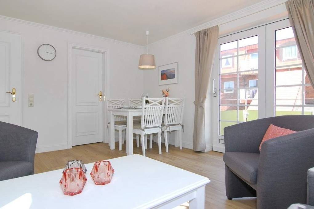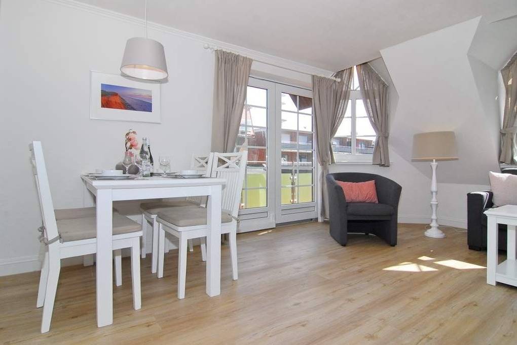 Helle 2-Zimmer-Ferienwohnung mit Südostbalkon im Haus "Olympia 1". Ca. 52m². OG: Wohnzimmer mit Essecke, Doppelschlafcouch (150x200) und Couchtisch, Kabel-TV, Radio, W-LAN ohne Gewähr, separate Küche mit Geschirrspüler, Duschbad/WC. DG: Schlafzimmer mit Doppelbett (2x90x200) und Einbauschränken. Nichtraucherwohnung, Tierhaltung verboten. Unter Haus 4 befindet sich das Schwimmbad mit Finnischer Sauna. Unter Haus 2 befindet sich ein separater Wellnessbereich mit Dampfsauna, Finnischer Sauna und Ruhebereich. Achtung: Es besteht kein direkter Zugang zum Wellnessbereich, zur Waschküche mit Gemeinschaftswaschmaschine/Trockner und Tiefgarage. Diese sind über das Nachbar-Haus 2 zu erreichen. Offenes W-LAN-Netzwerk steht zur Verfügung (ohne Gewähr). Bettwäsche und Handtücher sind zur Anreise aufgezogen. Ein Garagenstellplatz kann kostenpflichtig gebucht werden!